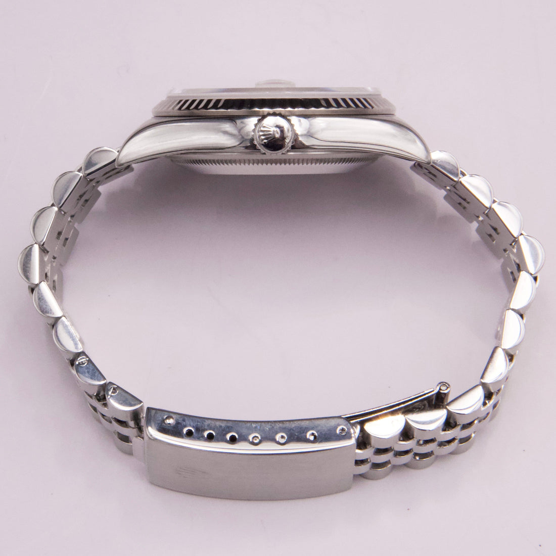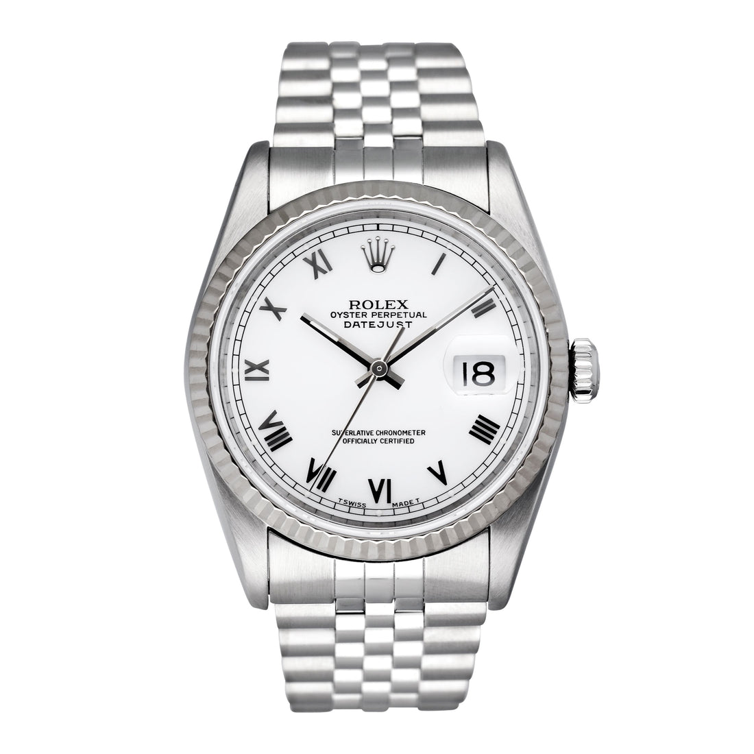 Rolex Datejust 16234 Mens Watch. 36mm stainless steel case. 18K white gold fluted bezel. White dial with steel hands and Roman numeral hour marker. Minute maker on the outer dial. Stainless steel Jubilee bracelet with fold over clasp. Will fit up to a 7-inch wrist. Sapphire crystal. Stainless steel case back. Automatic self-winding movement.