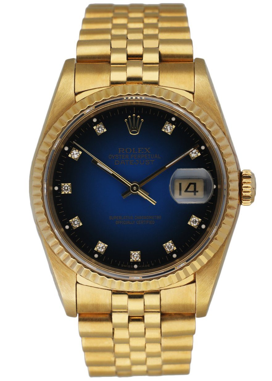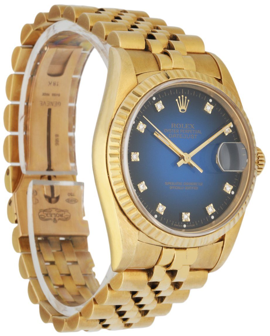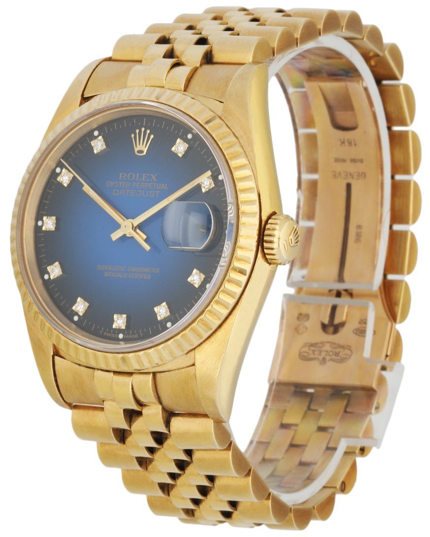 Rolex Datejust 16238 Men Watch. 36mm 18k Yellow Gold case. 18K Yellow Gold fluted bezel. Blue vignette dial with gold hands and diamond hour markers. Minute markers on the outer dial. Date display at the 3 o'clock position. 18K Yellow Gold jubilee Bracelet with Fold Over Clasp. Will fit up to a 7-inch wrist. Sapphire Crystal, yellow gold case back. Automatic self-winding movement with a 48-hour power reserve.