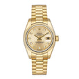 Rolex Oyster Perpetual Datejust 179178 Ladies Watch. 26mm 18K yellow gold case. 18K yellow gold fluted bezel. Pink dial with gold hands and factory diamond set hour markers. Minute markers on the outer dial. The date is displayed at the 3 o'clock position. 18K yellow gold President bracelet with 18K rose gold hidden fold over clasp. Will fit up to 5.75-Inch wrist. Sapphire crystal. 18K yellow gold case back. Automatic self-winding movement.