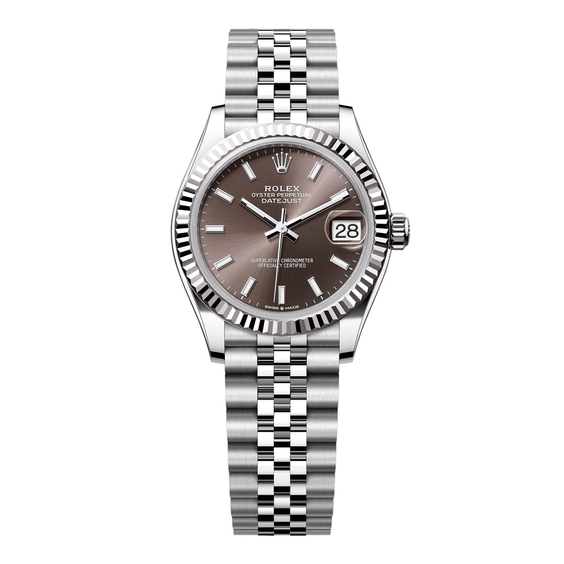 Rolex Oyster Perpetual Datejust 278274 Ladies watch. 31mm stainless steel case. 18K white gold fluted bezel. Dark Grey dial with silver-tone hands and Index hour markers. Date display at 3 o'clock position. Stainless steel Jubilee band with hidden fold over clasp. Will fit up to a 6.5- inch wrist. Sapphire crystal. Stainless steel case back. Automatic self-winding movement. This will come with original Box and Papers.
