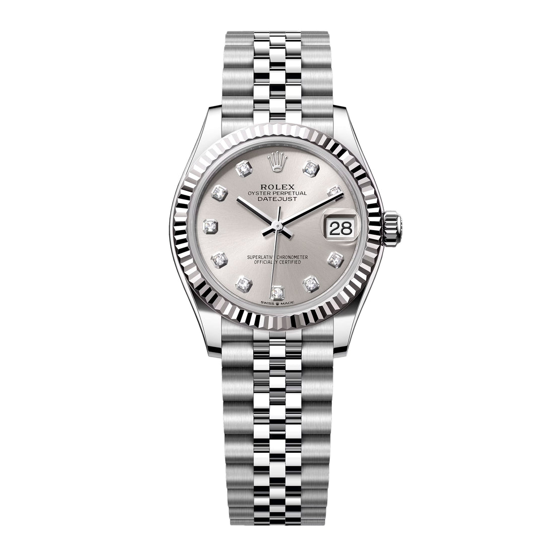 Rolex Oyster Perpetual Datejust 278274 Ladies watch. 31mm stainless steel case. 18K white gold fluted bezel. Silver dial with silver-tone hands and factory diamond hour markers. Date display at 3 o'clock position. Stainless steel Jubilee band with hidden fold over clasp. Will fit up to a 6.5- inch wrist. Sapphire crystal. Stainless steel case back. Automatic self-winding movement. This will come with original Box and Papers.