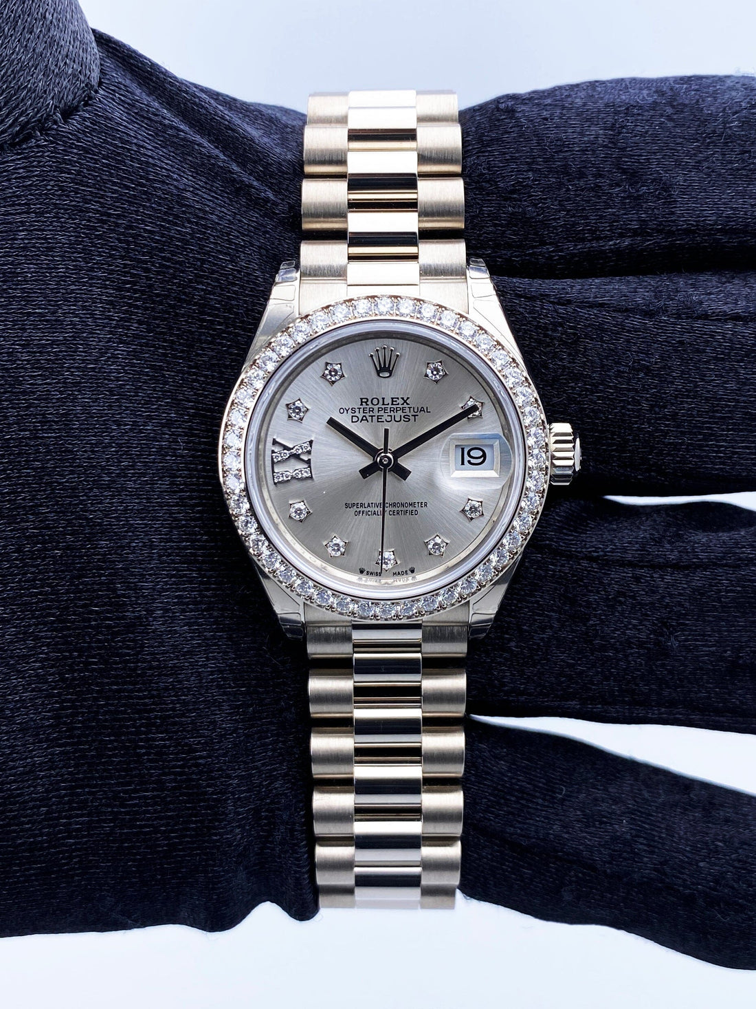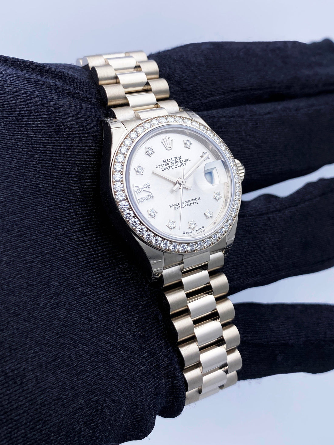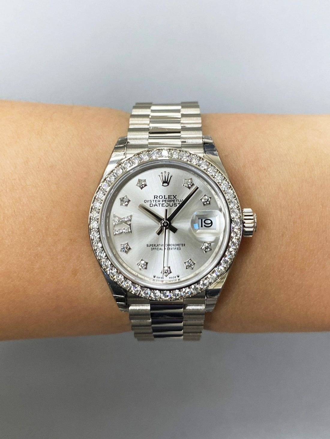 Rolex Datejust 279139RBR Ladies Watch. 28mm 18K white gold case. 18K white gold bezel with factory diamonds. Silver dial with silver-tone hands and factory diamond hour markers. Date display at the 3 o'clock position. 18K white gold President bracelet with hidden fold over clasp. Will fit up to a 6-inch wrist. Sapphire crystal. 18K white gold case back. Automatic self-winding chronometer movement. This watch come with Box and Papers.