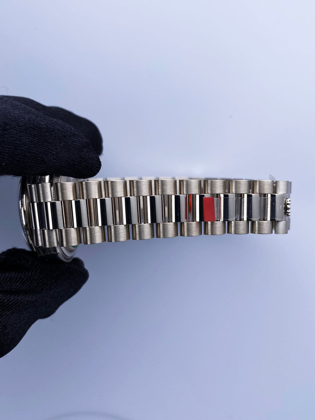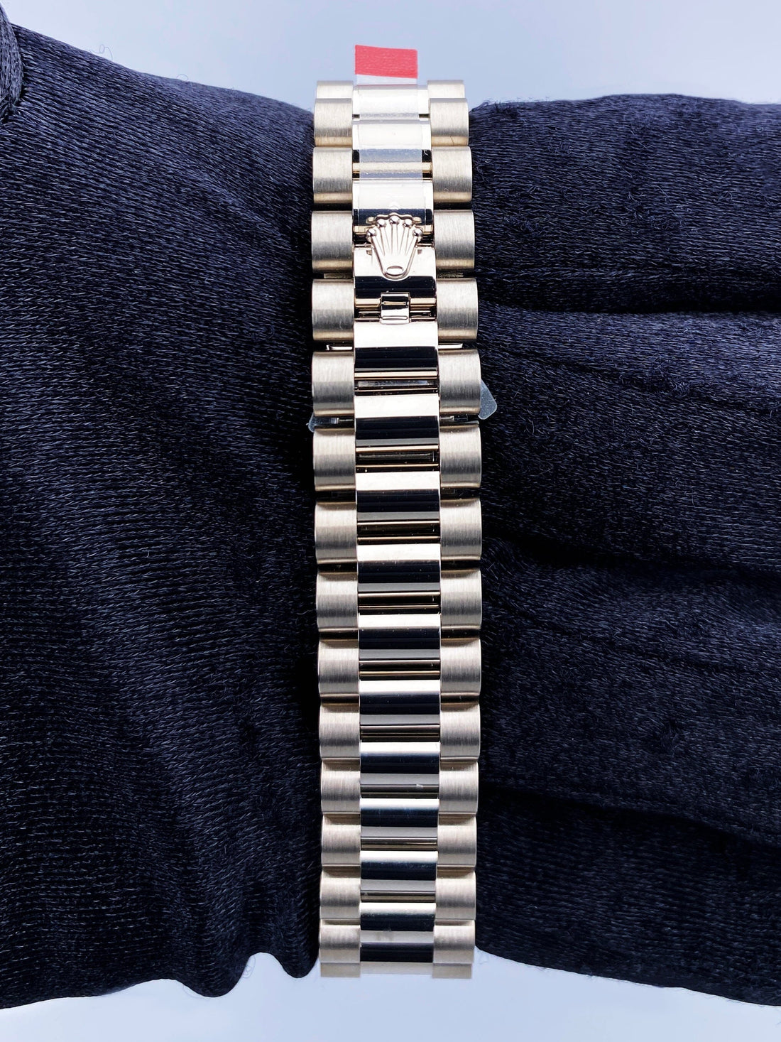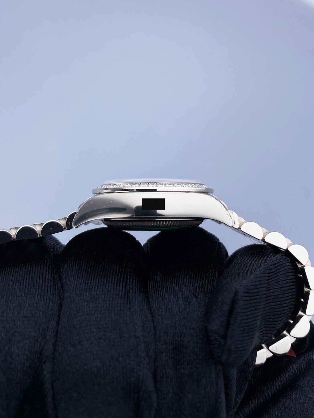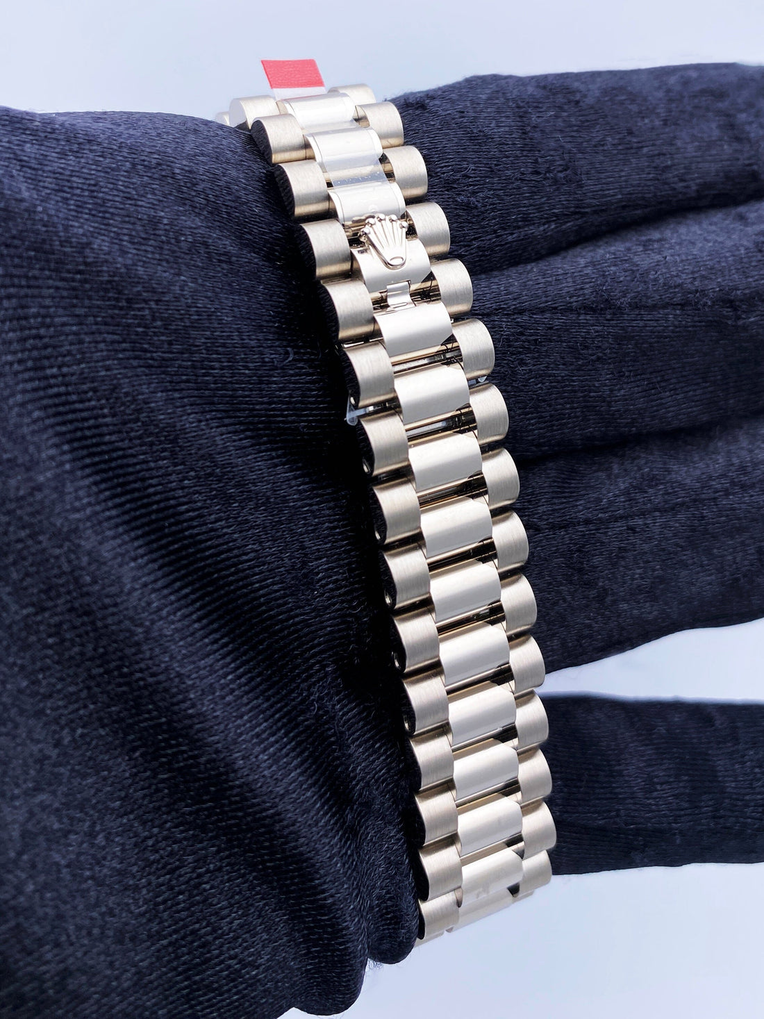 Rolex Datejust 279139RBR Ladies Watch. 28mm 18K white gold case. 18K white gold bezel with factory diamonds. Silver dial with silver-tone hands and factory diamond hour markers. Date display at the 3 o'clock position. 18K white gold President bracelet with hidden fold over clasp. Will fit up to a 6-inch wrist. Sapphire crystal. 18K white gold case back. Automatic self-winding chronometer movement. This watch come with Box and Papers.