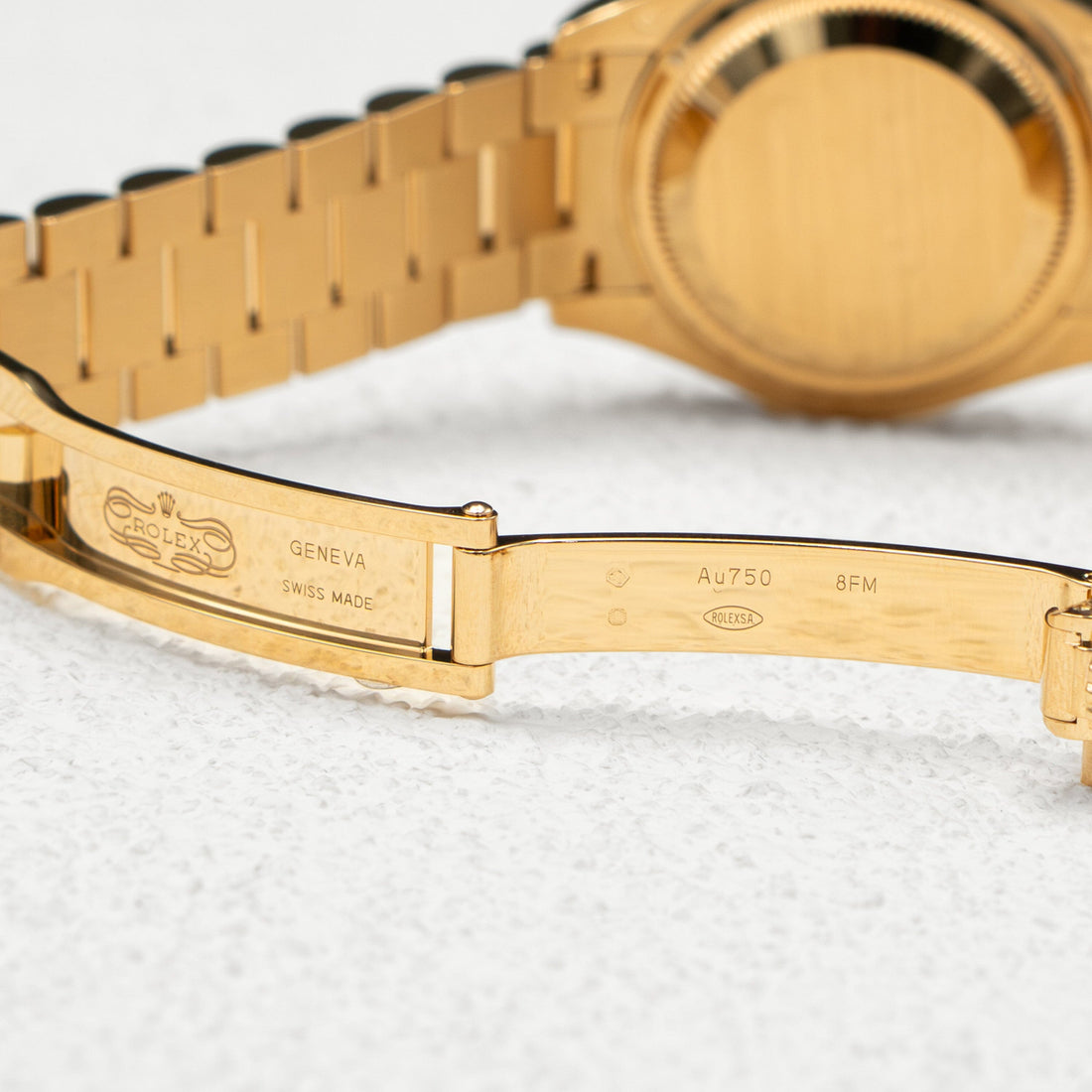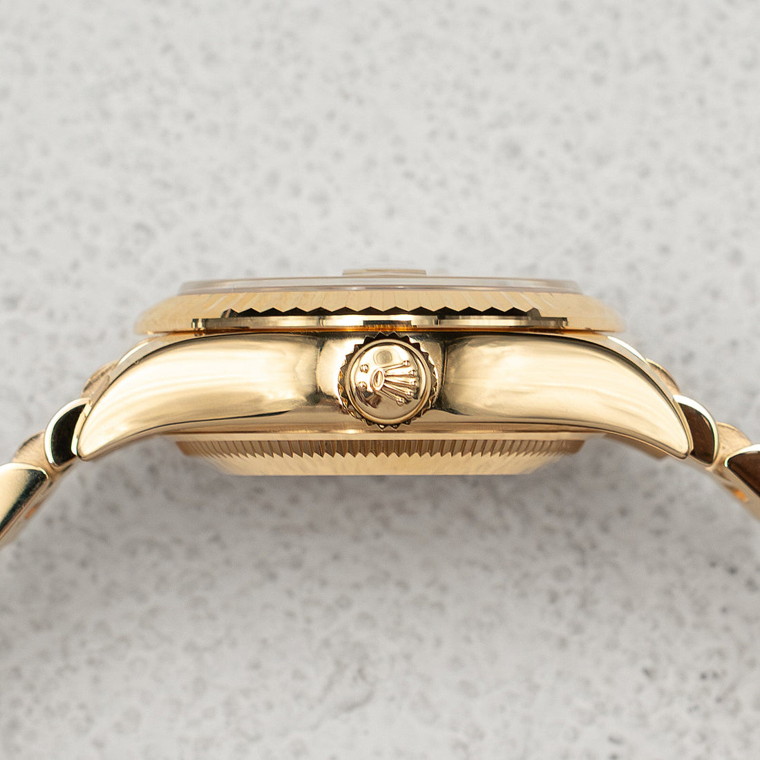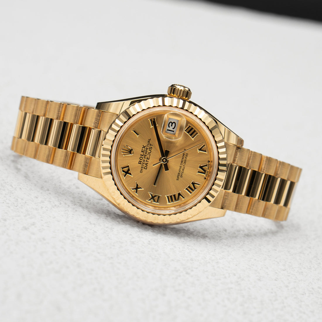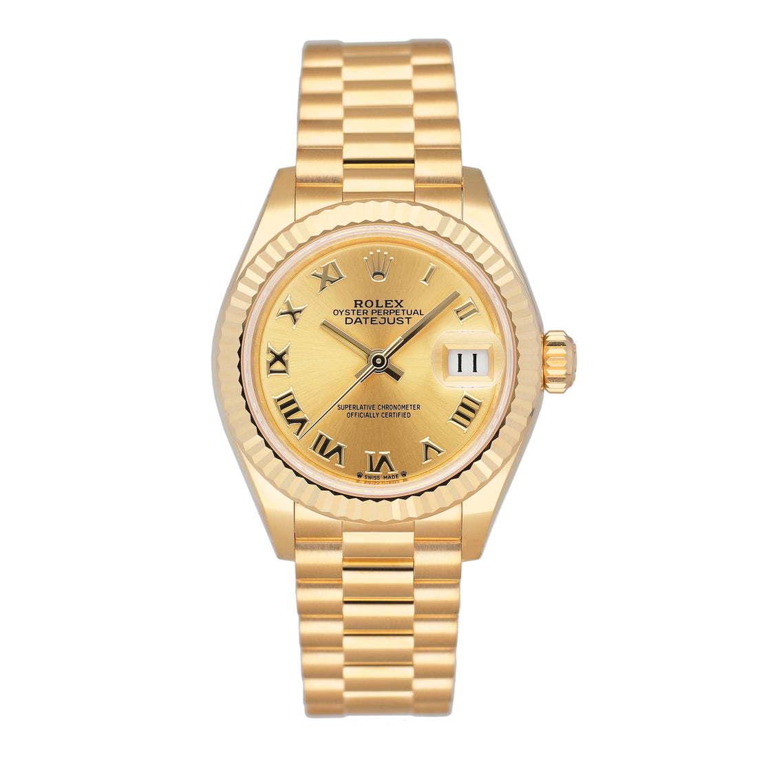Rolex Oyster Perpetual Datejust 279178 Ladies Watch. 28mm 18K yellow gold case. 18K yellow gold fluted bezel. Champagne dial with gold hands and Roman numeral hour markers. Date display at the 3 o'clock position. 18K yellow gold President bracelet with 18K yellow gold hidden fold over clasp. Will fit up to 6-Inch wrist. Sapphire crystal. 18K yellow gold case back. Automatic self-winding movement. This watch comes with original Box and Papers.