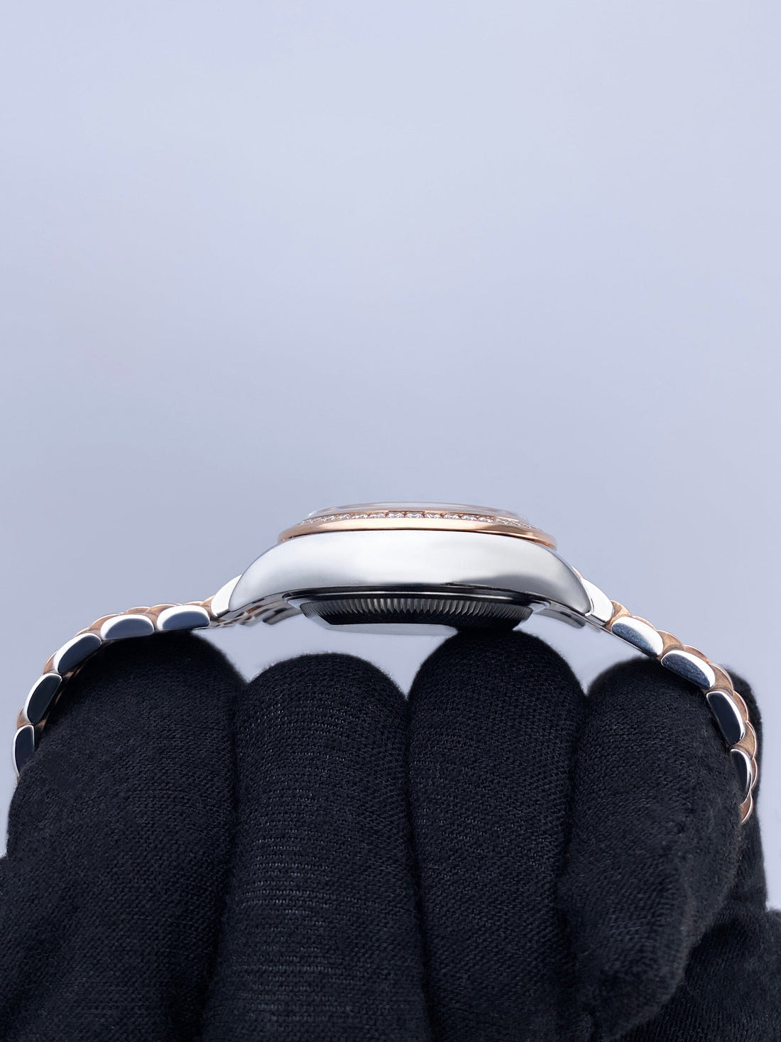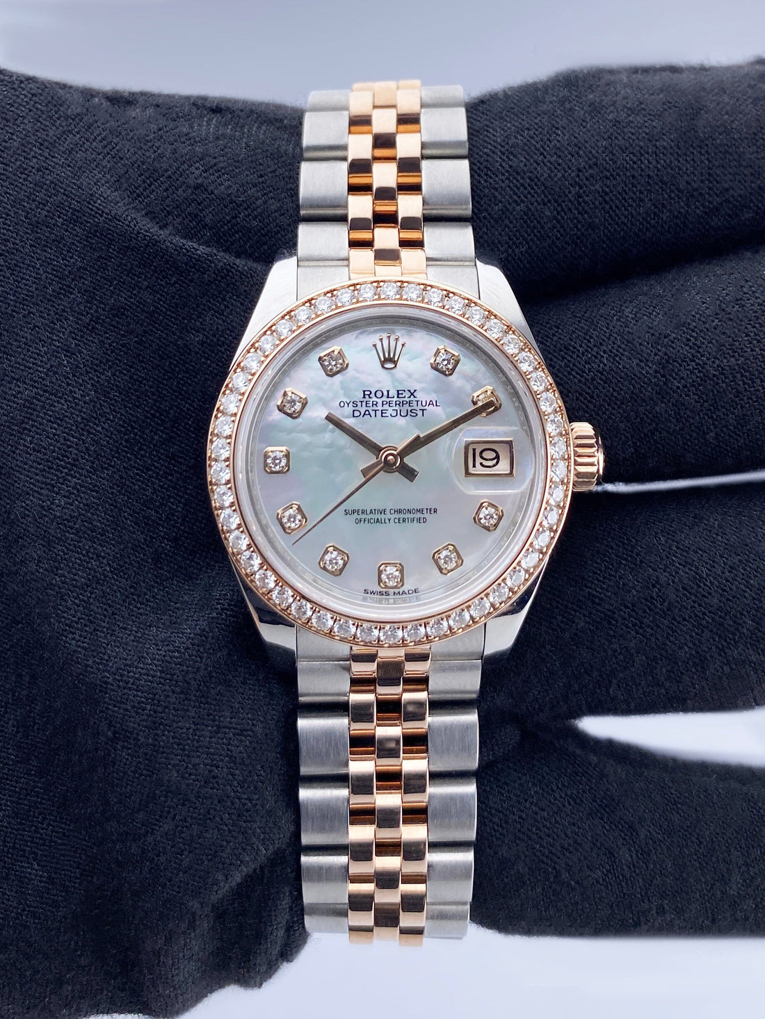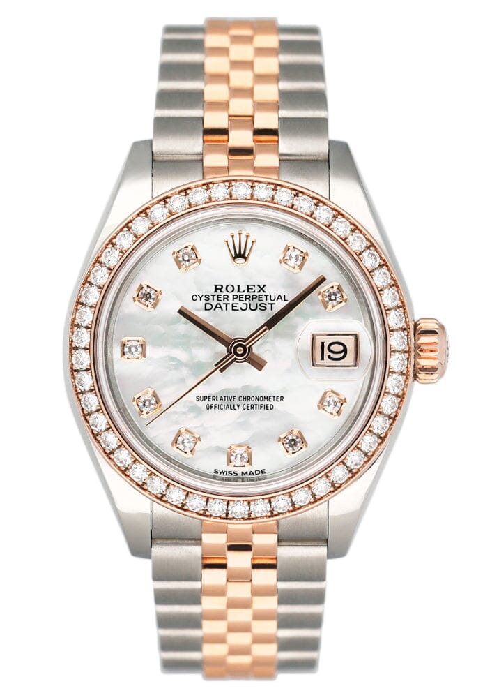 Rolex Datejust 279381RBR Ladies Watch. 28mm stainless steel case. 18K rose gold bezel with factory diamonds. Mother of Pearl dial with rose gold hands and factory diamond hour markers. Date display at the 3 o'clock position. 18K rose gold & stainless steel President bracelet with hidden fold over clasp. Will fit up to a 6-inch wrist. Sapphire crystal. Stainless steel case back. Automatic self-winding chronometer movement. This watch come with Box and Papers.