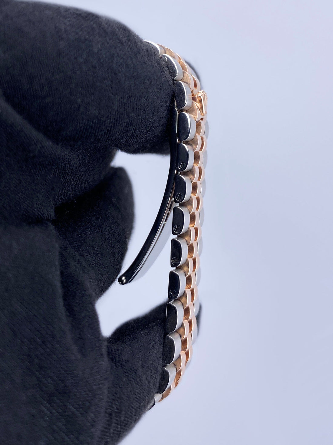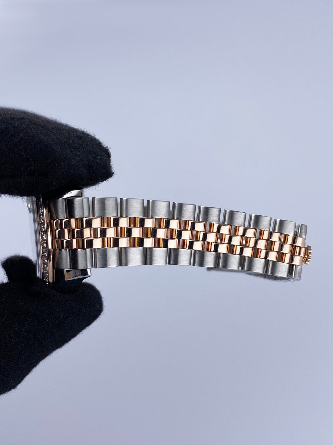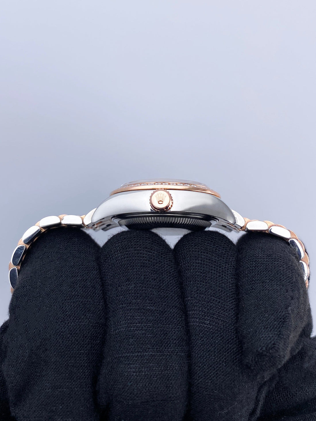 Rolex Datejust 279381RBR Ladies Watch. 28mm stainless steel case. 18K rose gold bezel with factory diamonds. Mother of Pearl dial with rose gold hands and factory diamond hour markers. Date display at the 3 o'clock position. 18K rose gold & stainless steel President bracelet with hidden fold over clasp. Will fit up to a 6-inch wrist. Sapphire crystal. Stainless steel case back. Automatic self-winding chronometer movement. This watch come with Box and Papers.