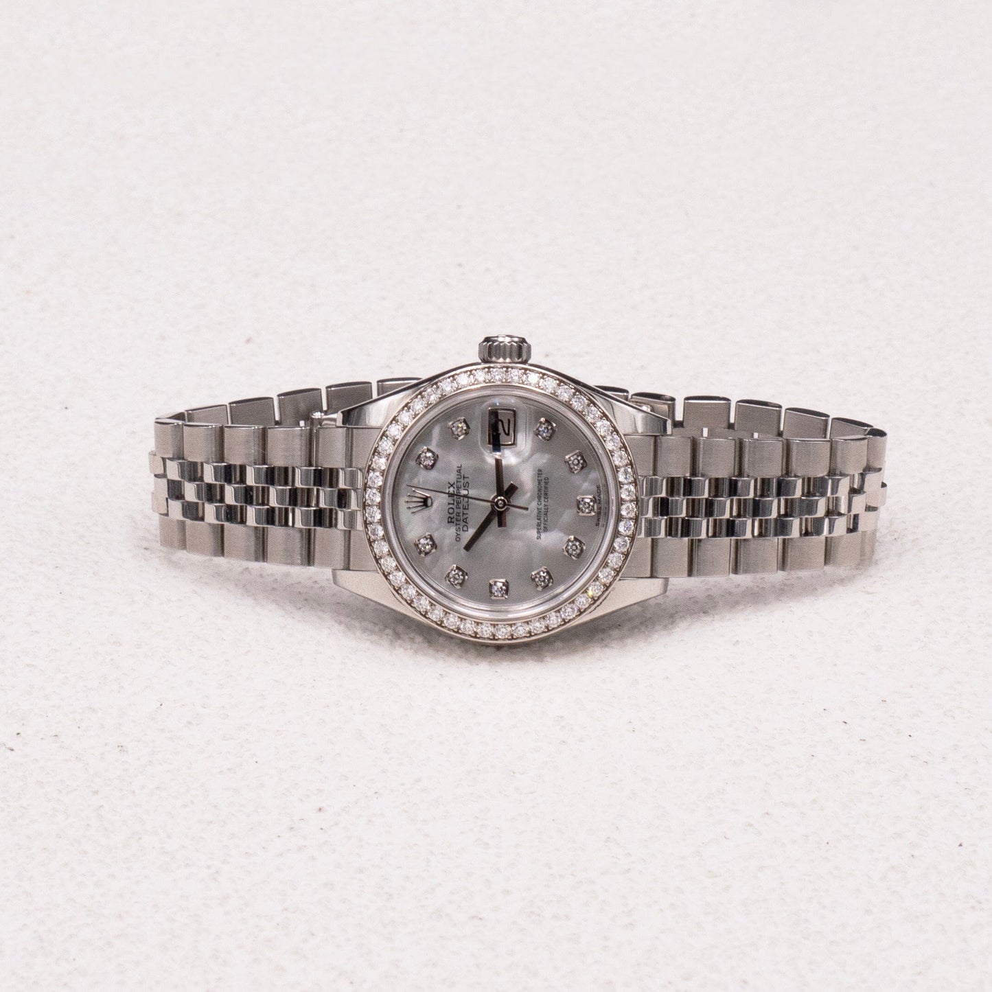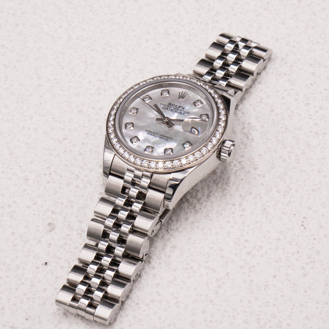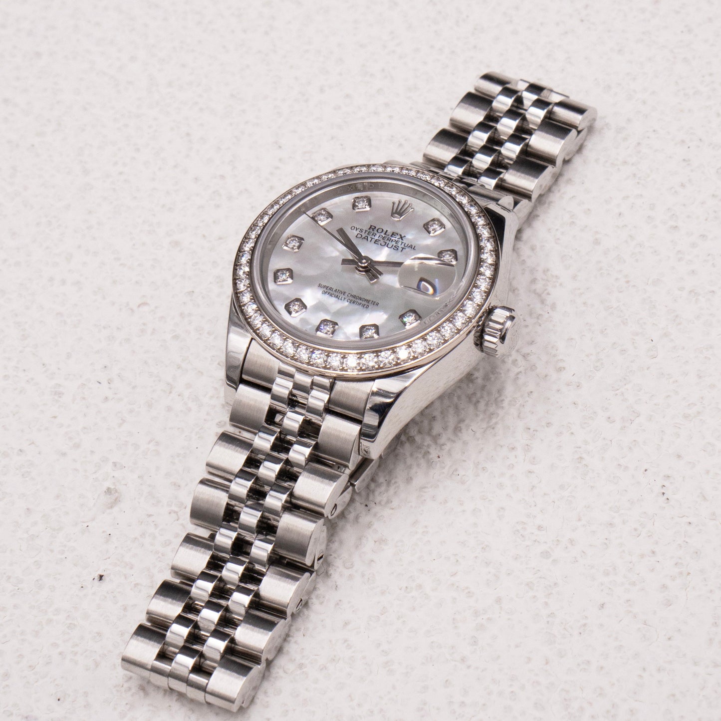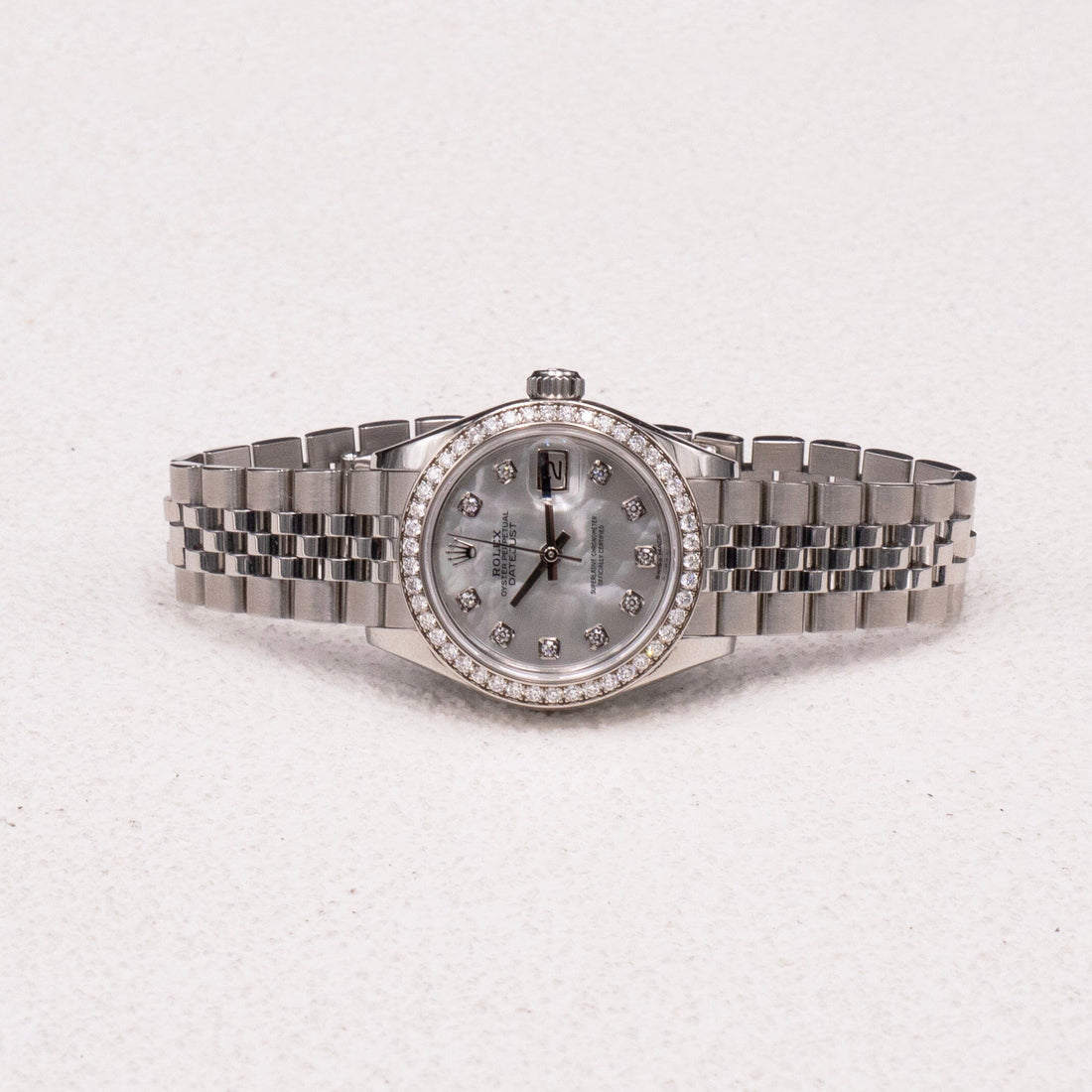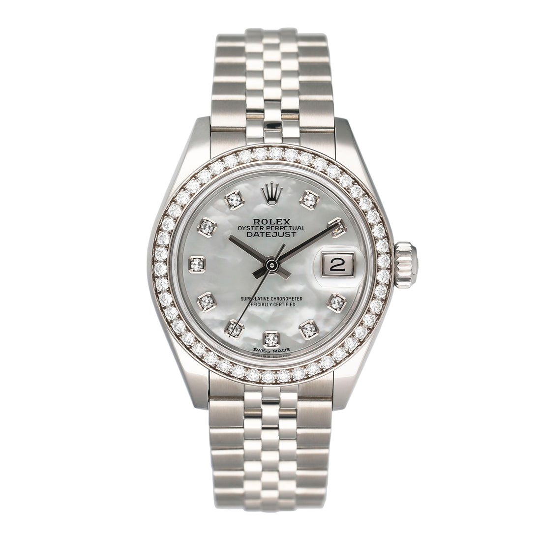 Rolex Datejust 279384RBR Ladies Watch. 28mm stainless steel case. 18K white gold bezel with factory diamonds. Mother of Pearl dial with white gold hands and factory diamond hour markers. Date display at the 3 o'clock position. Stainless steel Jubilee bracelet with hidden fold over clasp. Will fit up to a 6-inch wrist. Sapphire crystal. Stainless steel case back. Automatic self-winding chronometer movement. This watch come with Box and Papers.