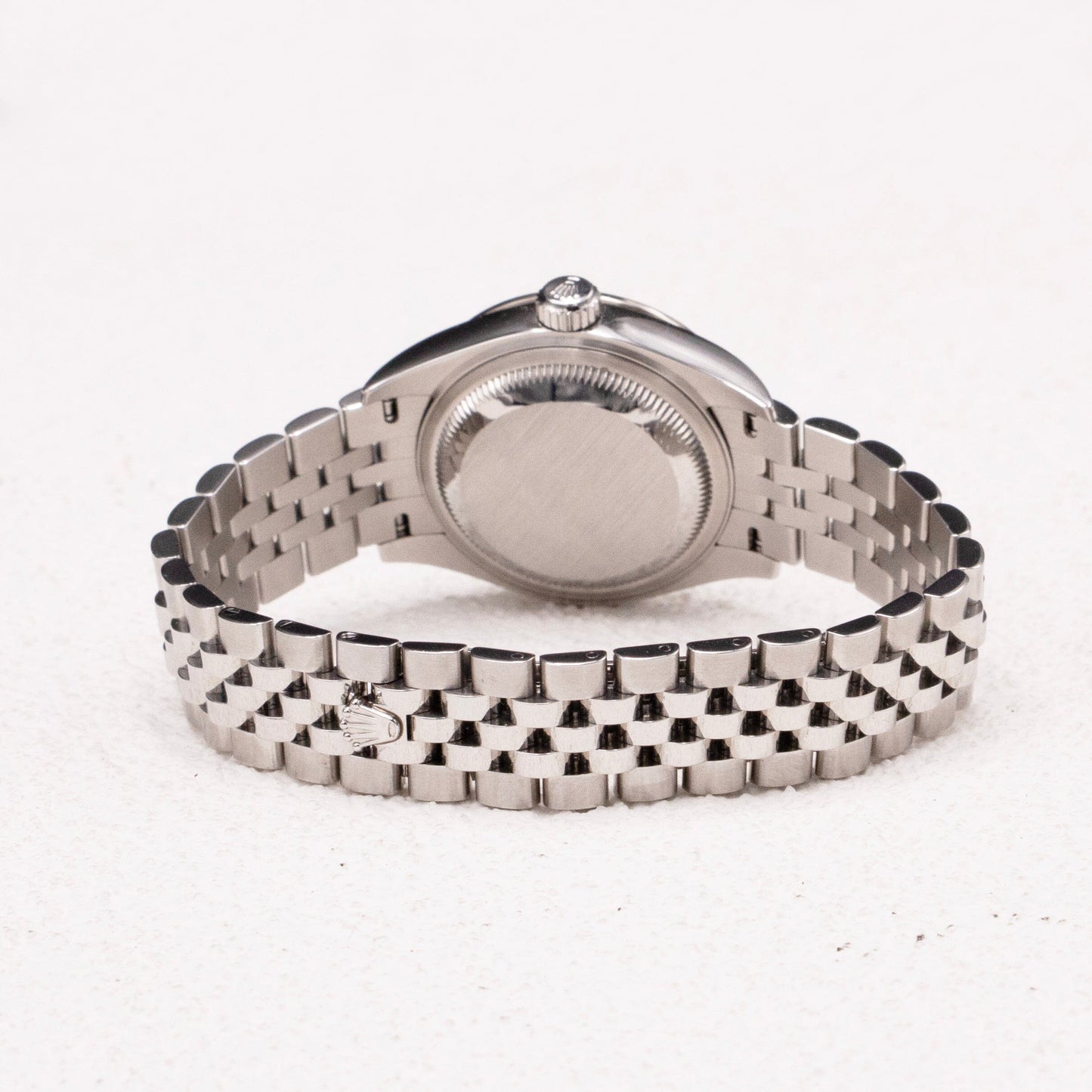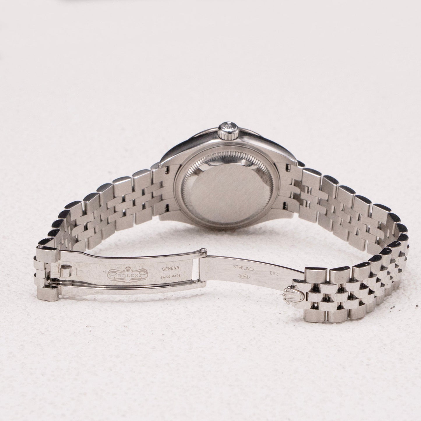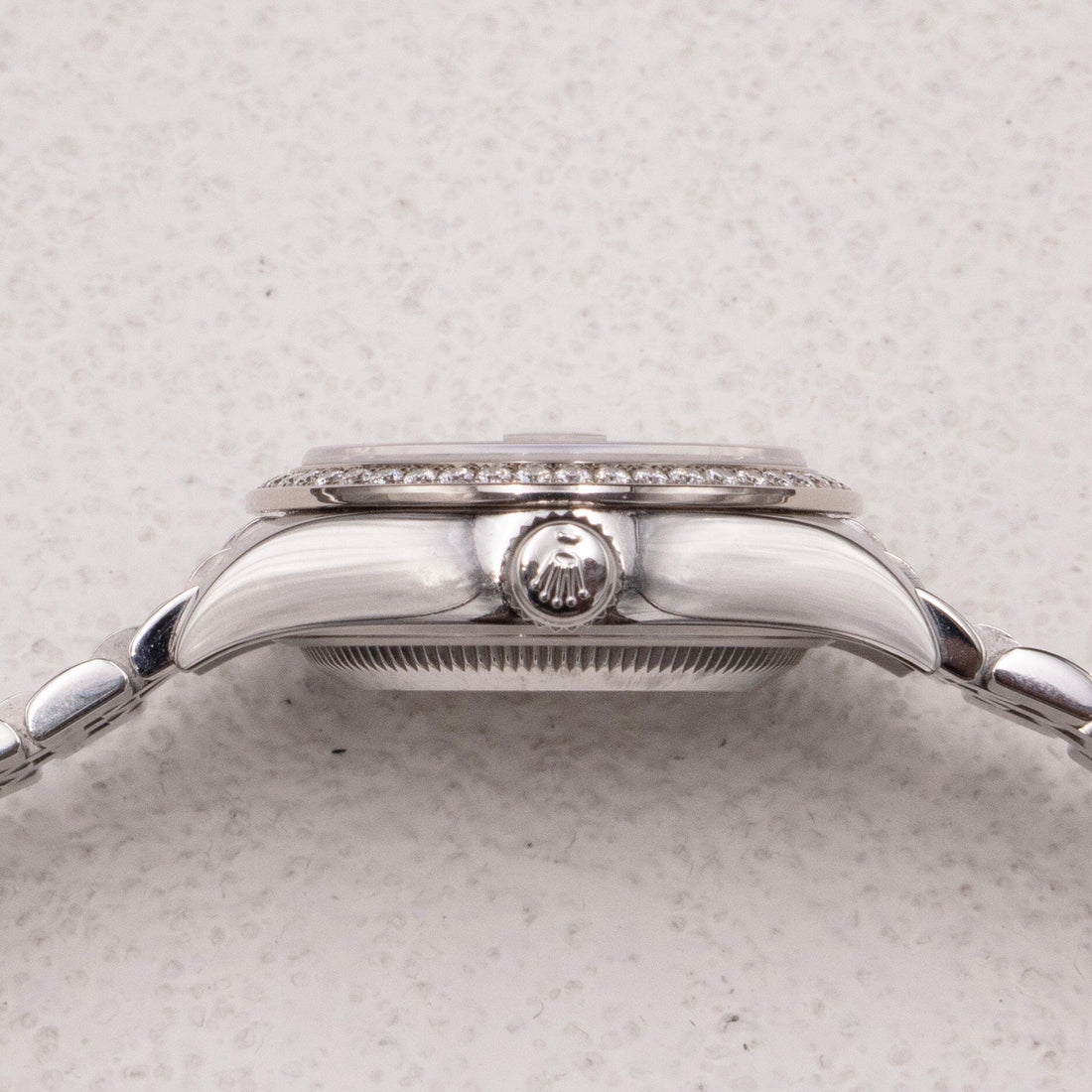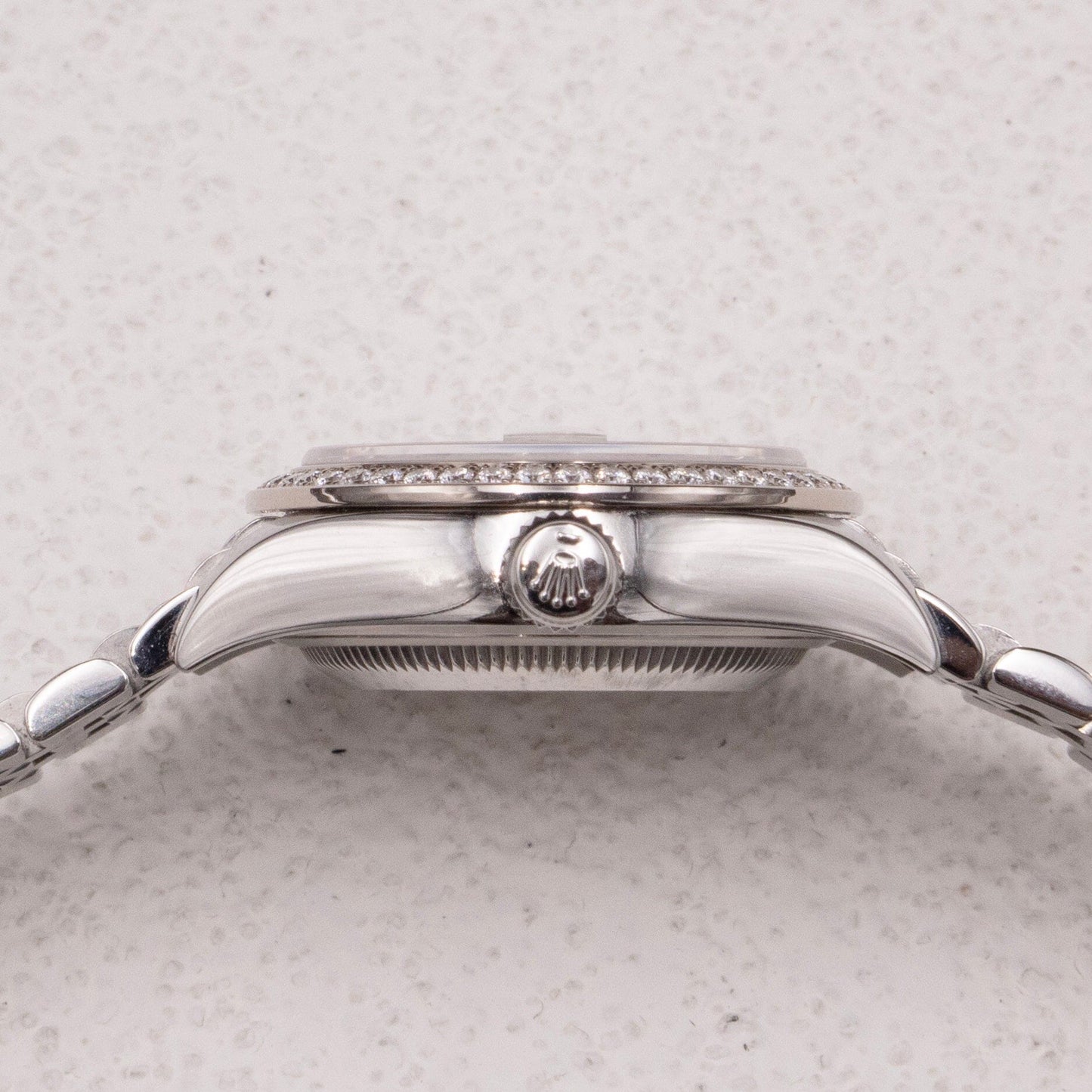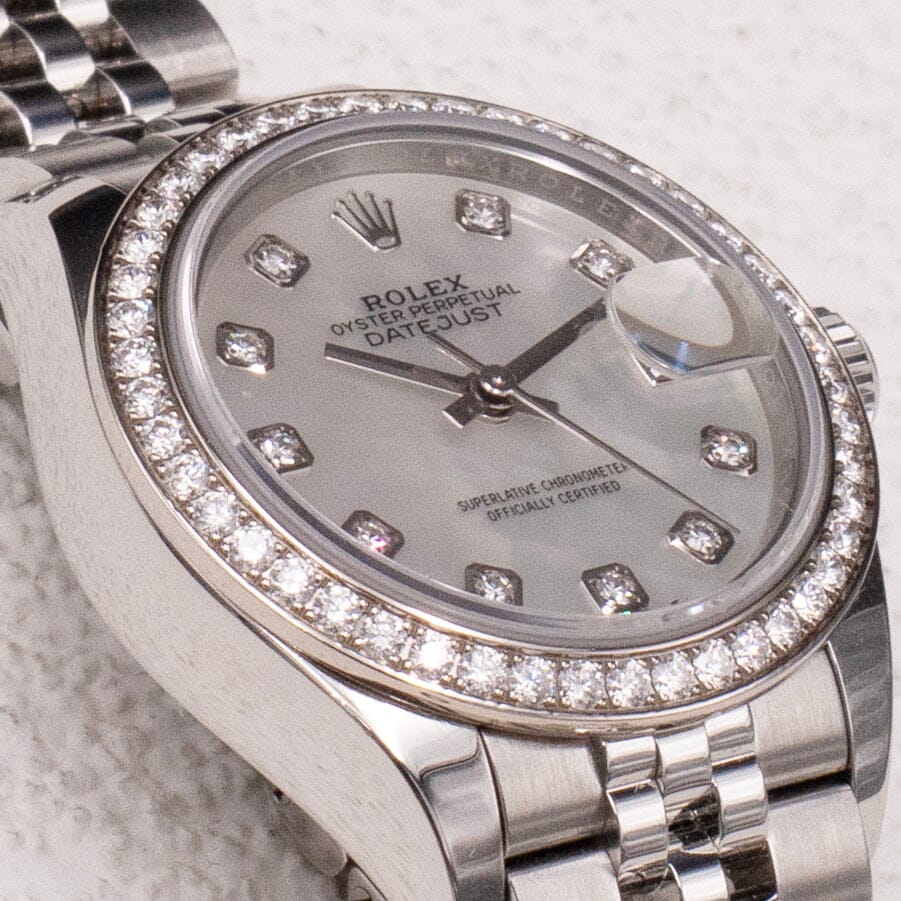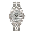 Rolex Datejust 279384RBR Ladies Watch. 28mm stainless steel case. 18K white gold bezel with factory diamonds. Mother of Pearl dial with white gold hands and factory diamond hour markers. Date display at the 3 o'clock position. Stainless steel Jubilee bracelet with hidden fold over clasp. Will fit up to a 6-inch wrist. Sapphire crystal. Stainless steel case back. Automatic self-winding chronometer movement. This watch come with Box and Papers.
