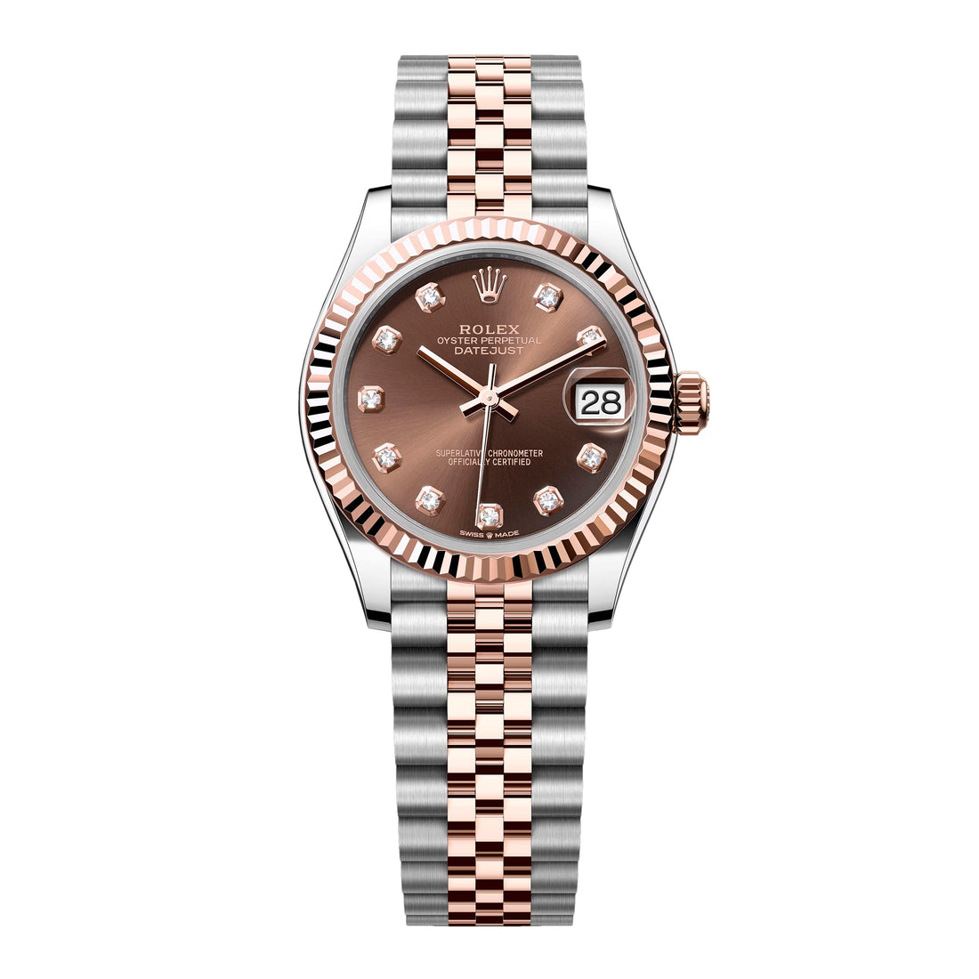 Rolex Datejust 278271 Ladies Watch. 31mm stainless steel case. 18K rose gold fluted bezel. Chocolate dial with gold hands and factory diamond hour markers. Minute markers on the outer dial. Date display at the 3 o'clock position. Stainless steel & 18K rose gold Jubilee bracelet with fold over clasp. Will fit up to a 6.5-inch wrist. Sapphire crystal. Stainless steel case back. Automatic self-winding movement. This watch comes with original Box and Papers.