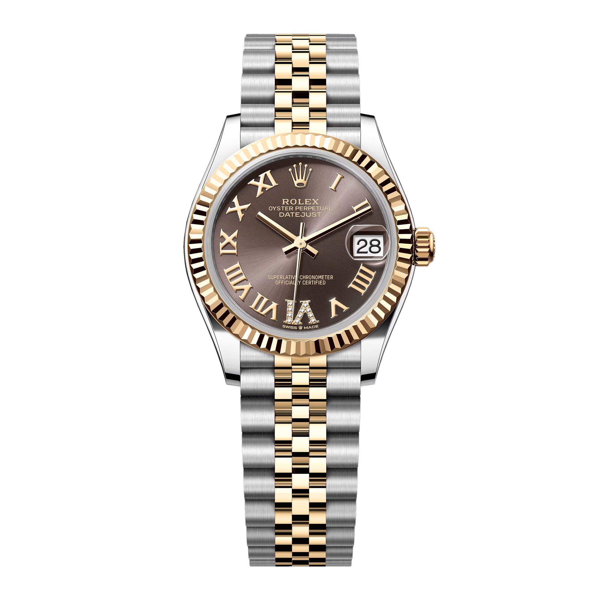 Rolex Datejust 278273 Ladies Watch. 31mm stainless steel case. 18K yellow gold fluted bezel. Dark grey dial with gold hands and Roman numeral hour markers. The dial features a large VI set with 11 diamonds. Minute markers on the outer dial. Date display at the 3 o'clock position. Stainless steel & 18K yellow gold Jubilee bracelet with fold over clasp. Will fit up to a 6.5-inch wrist. Sapphire crystal. Stainless steel case back. Automatic self-winding movement. This watch comes with original Box and Papers.