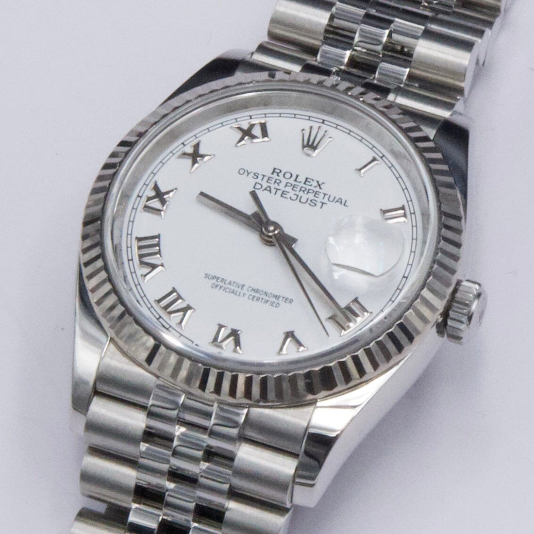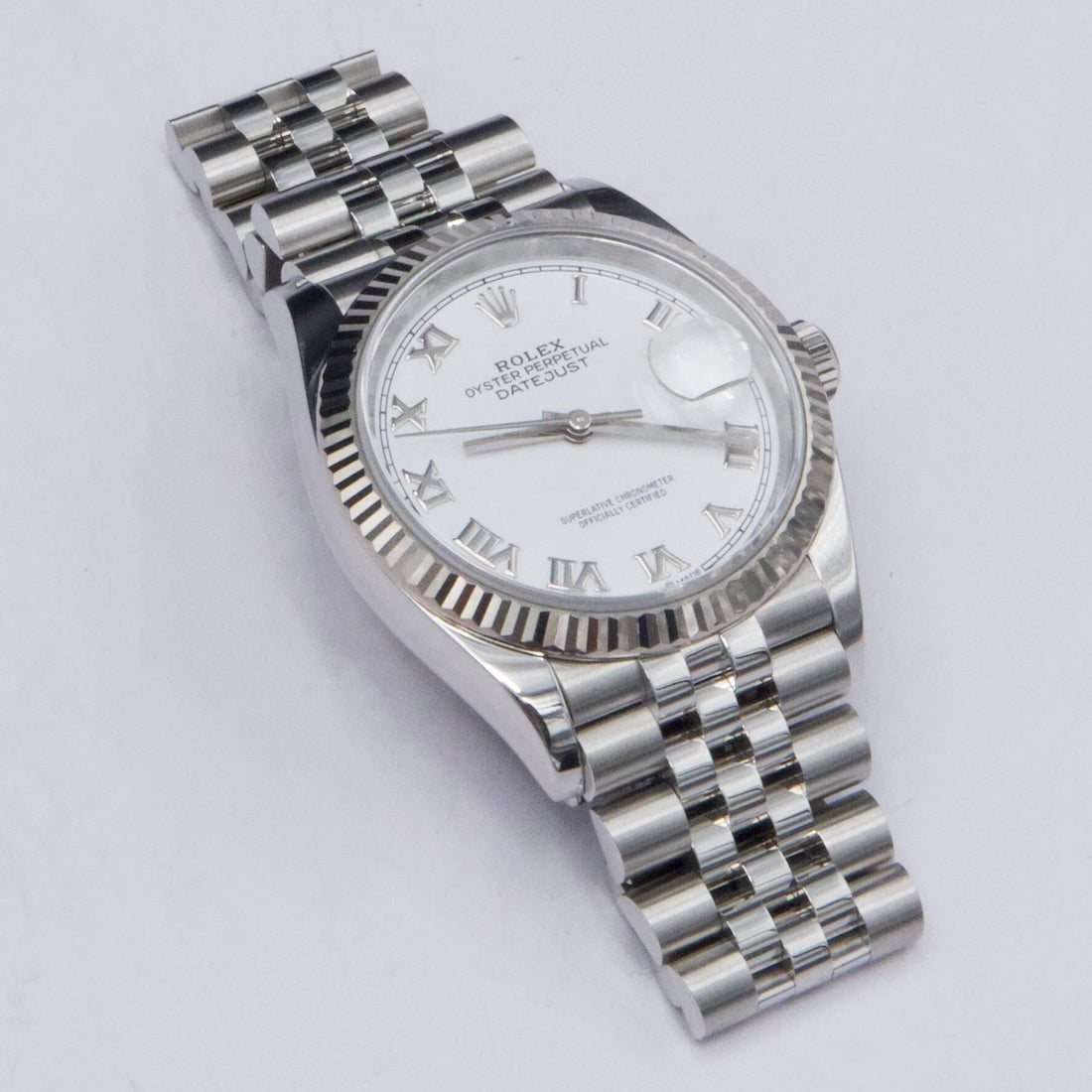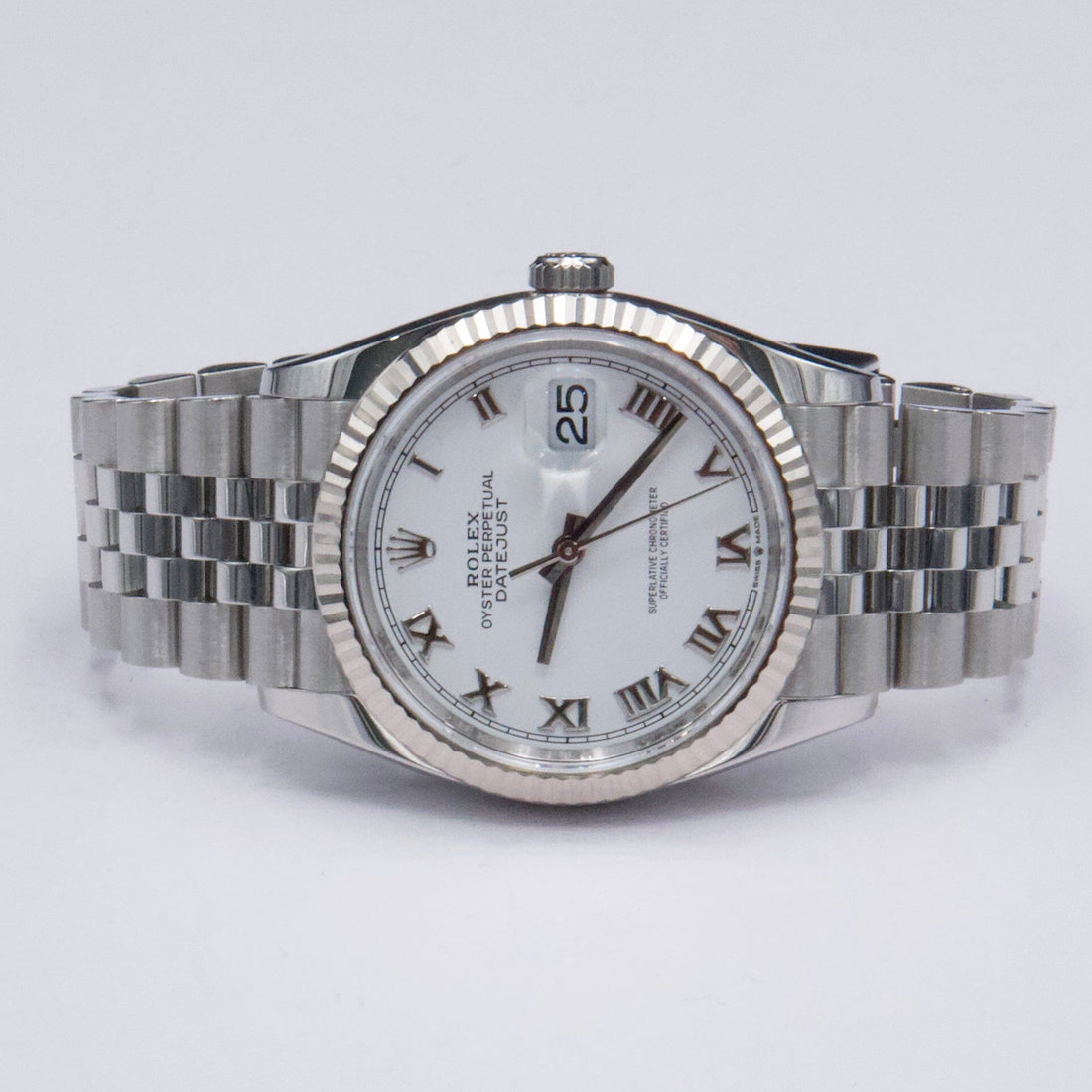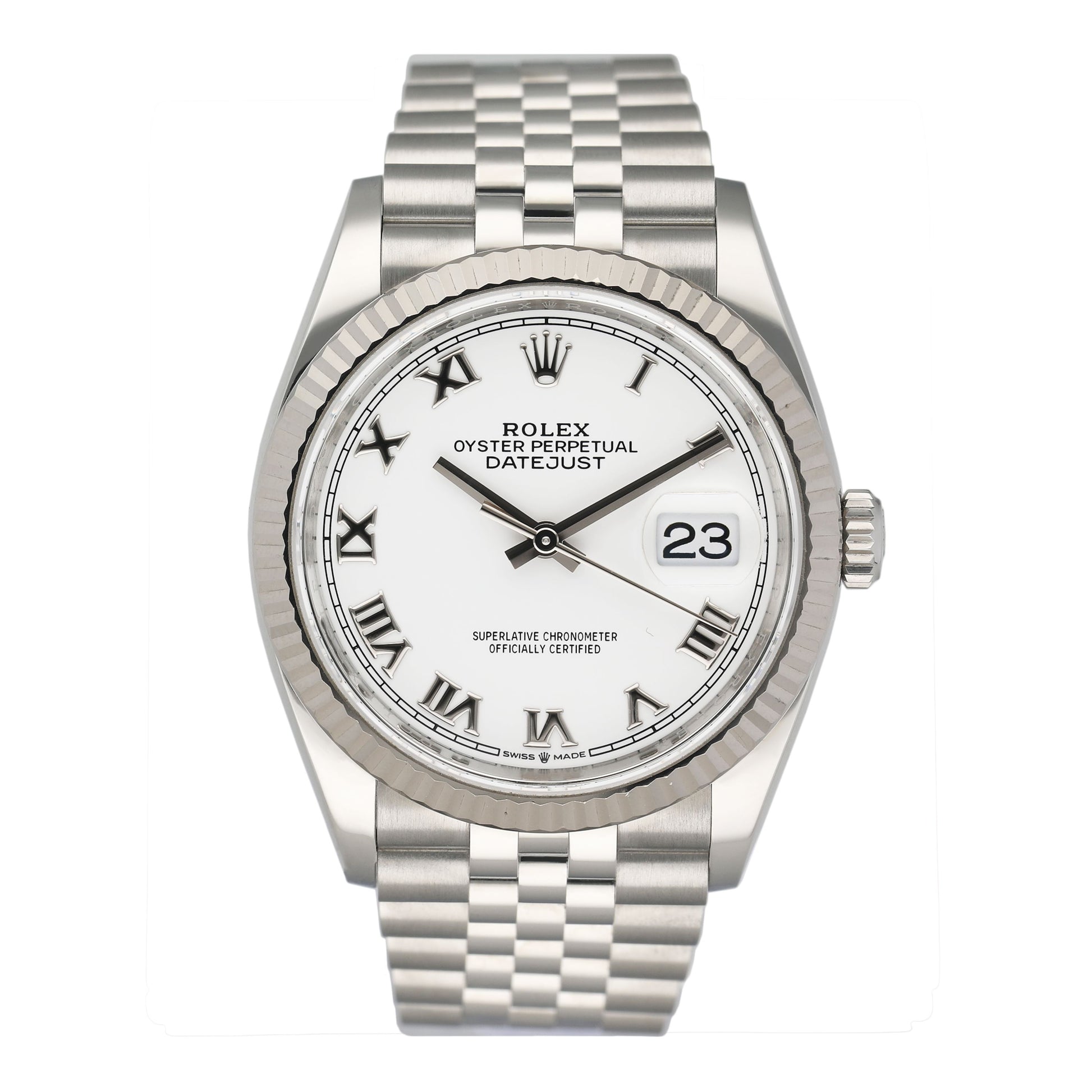 Rolex Datejust 36 126234 Mens Watch. 36mm stainless steel case with 18K White gold fluted bezel. White dial with silver-tone hands and Roman numeral hour marker. Date display at a 3 o'clock position. Stainless steel Jubilee bracelet with fold over clasp. Will fit up to a 6.5-Inch wrist. Sapphire crystal. Stainless steel case back. Automatic-self winding movement. This watch comes with original Box and Papers.