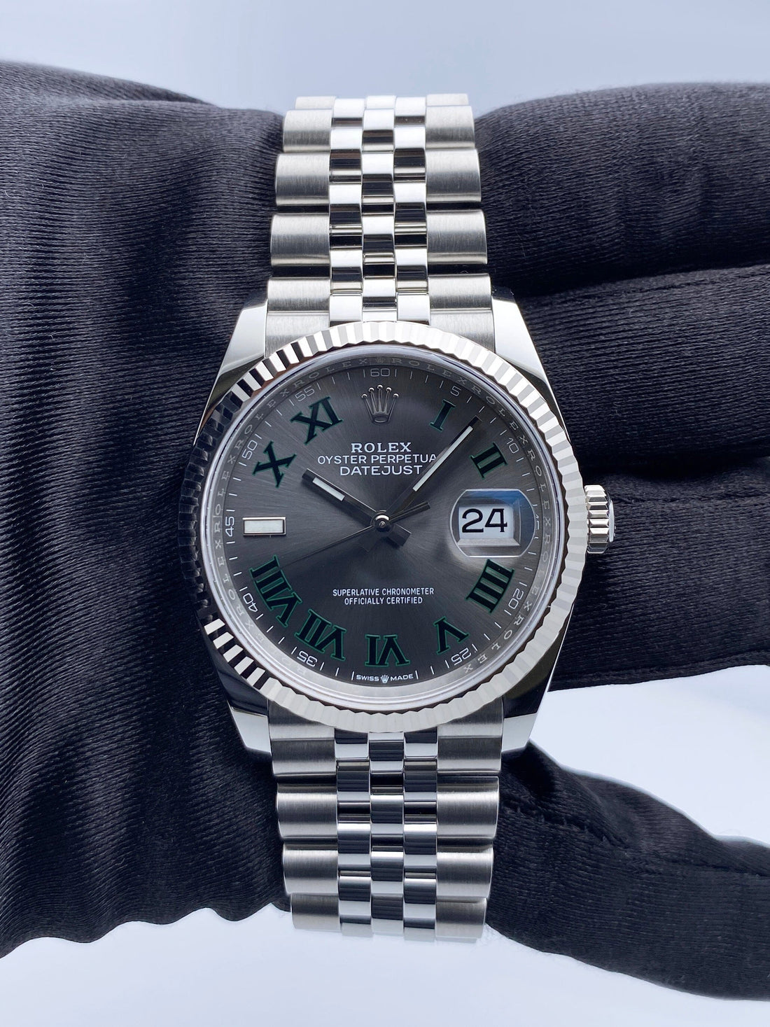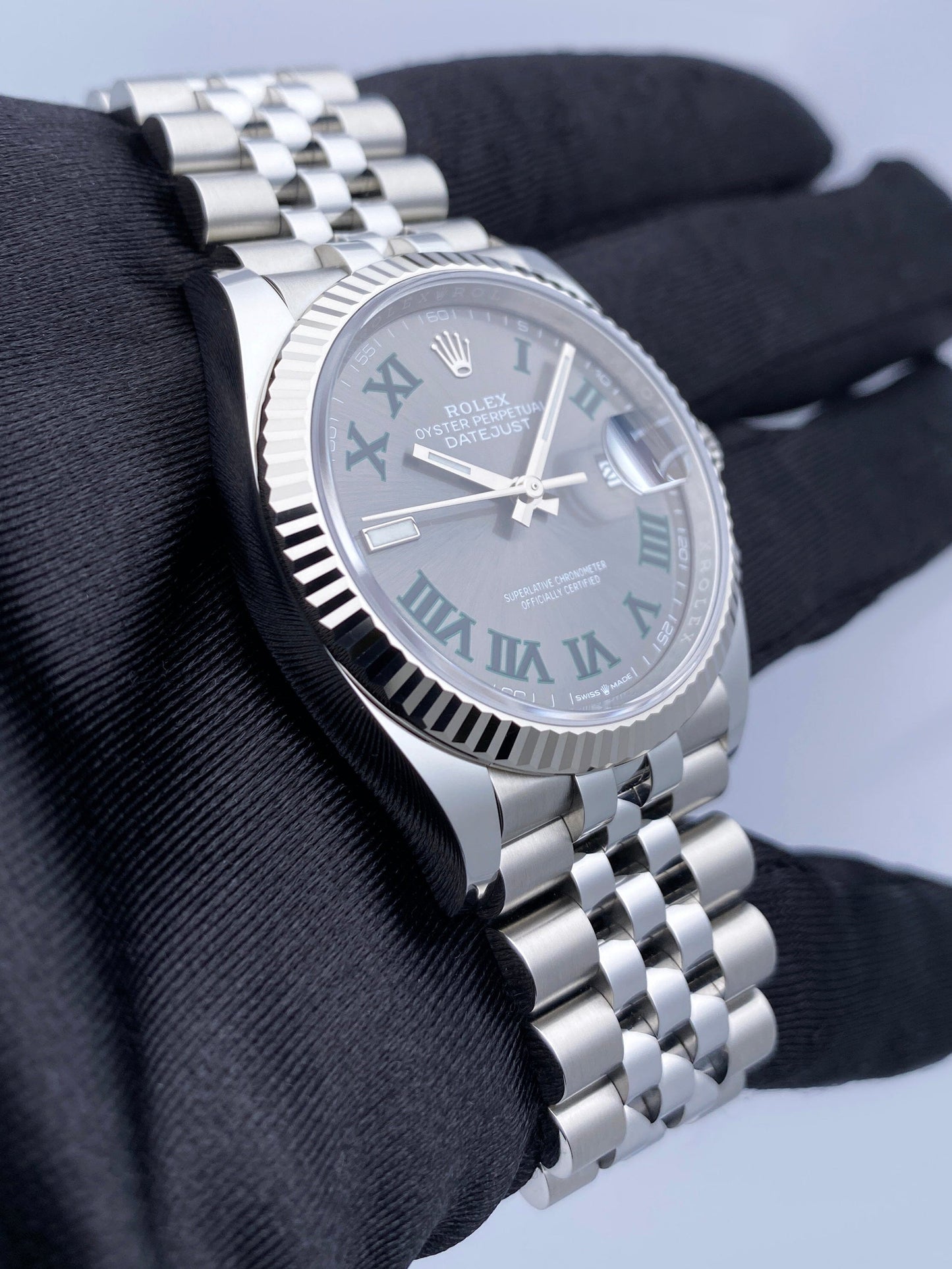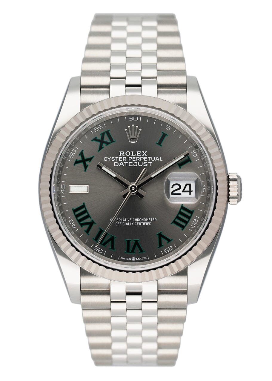 Rolex Datejust 36 126234 Mens Watch. 36mm stainless steel case with 18K White gold fluted bezel. Slate Wimbledon dial with luminous silver-tone hands and Roman numeral hour marker. Date display at a 3 o'clock position. Stainless steel Jubilee bracelet with fold over clasp. Will fit up to a 7.5-Inch wrist. Sapphire crystal. Stainless steel case back. Automatic-self winding movement. This watch comes with original Box and Papers.