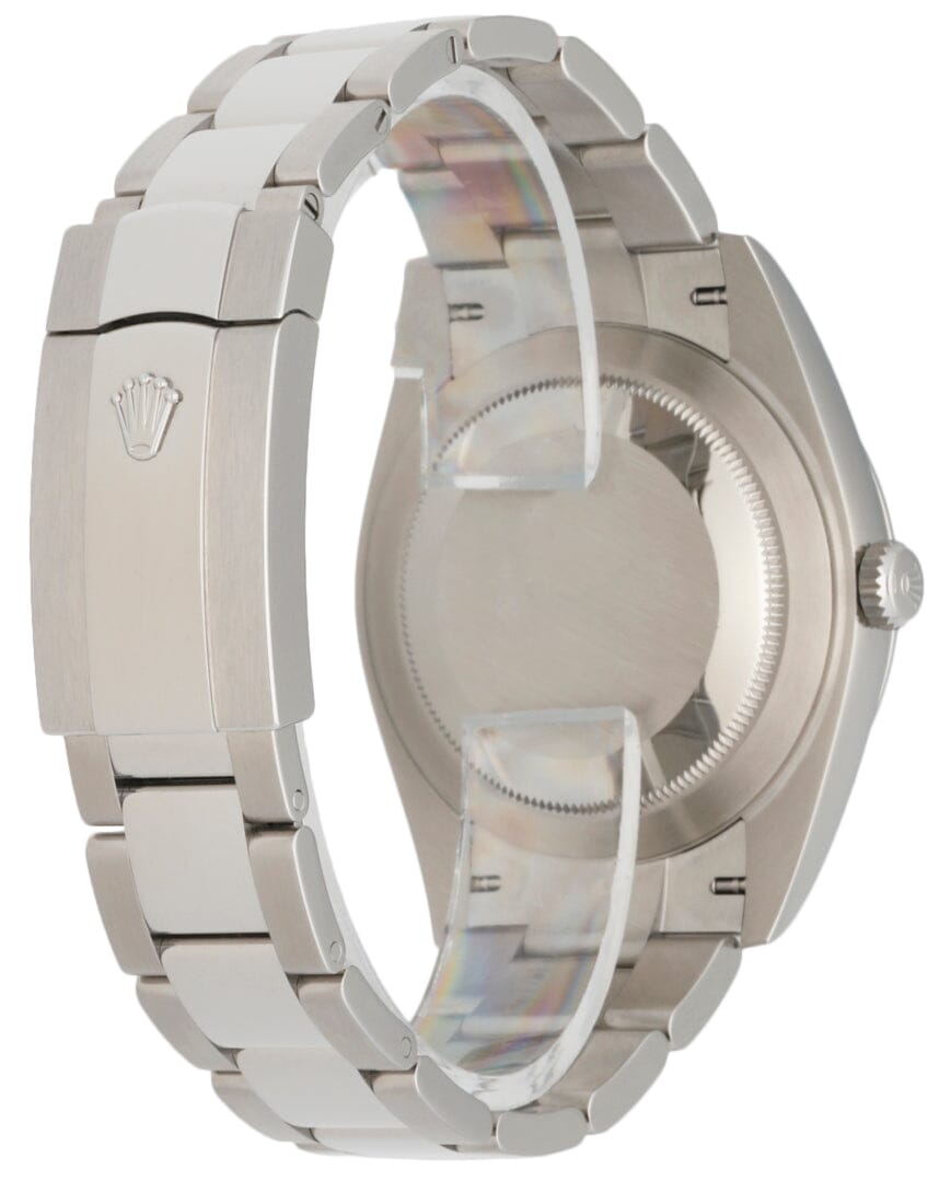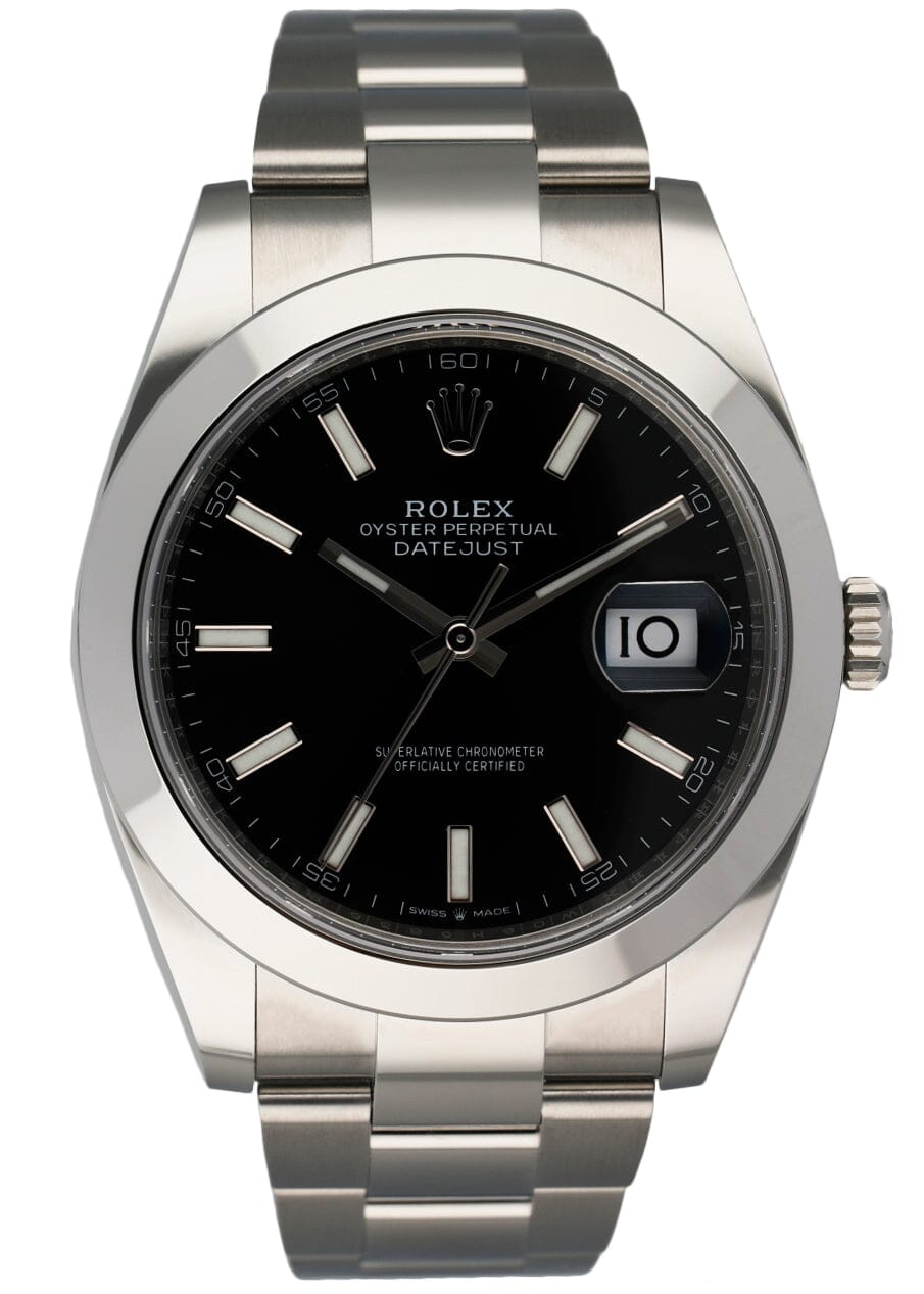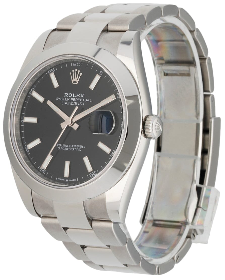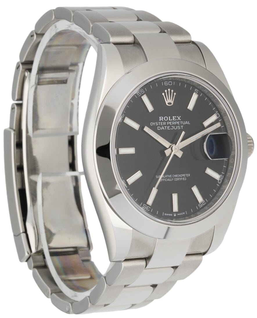 Rolex Datejust 41 126300 Mens Watch. 41mm stainless steel case with smooth stainless steel bezel. Black dial with luminous steel hands and index hour marker. Engraved serial rehaut. Date display at the 3 o'clock position. Stainless steel Oyster bracelet with fold over clasp. Will fit up to 7.5-Inch wrist. Sapphire crystal. Stainless steel case back. Automatic self-winding movement. This watch comes with original Box and Papers.