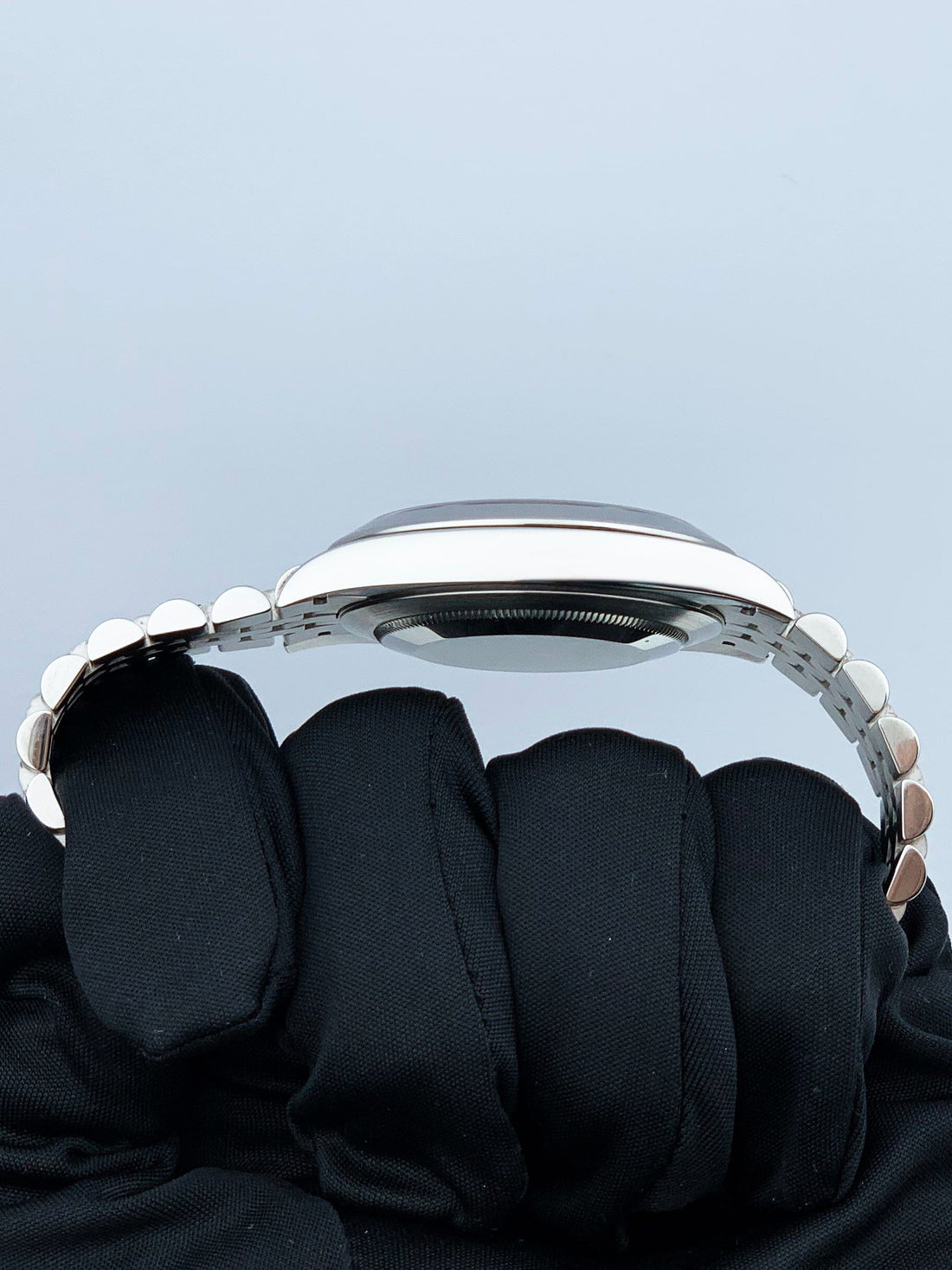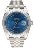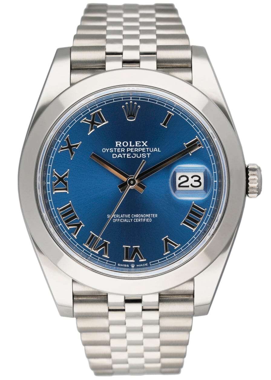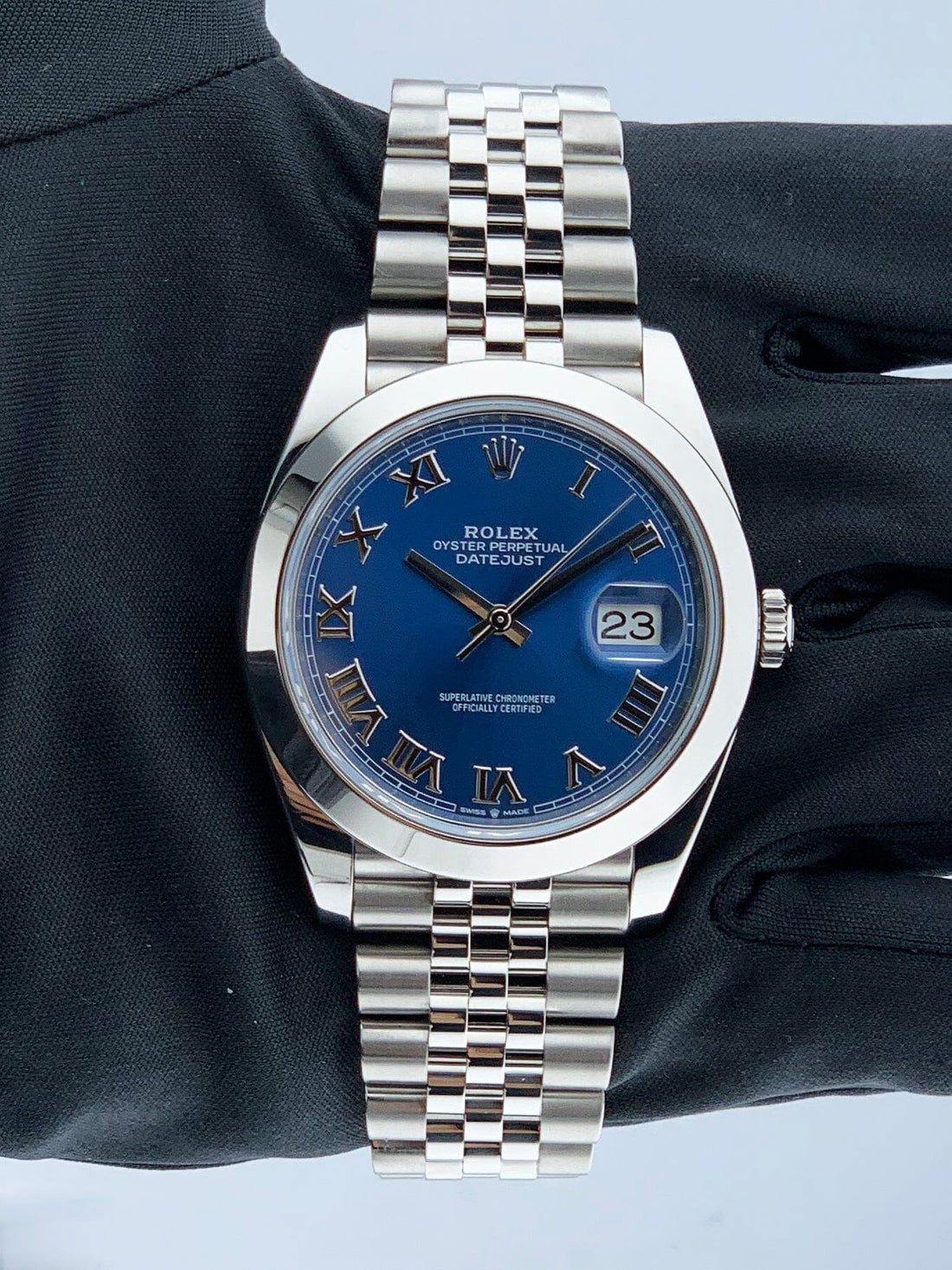 Rolex Datejust 41 126300 mens watch. 41mm stainless steel case with smooth stainless steel bezel. Blue dial with steel hands and Roman numeral hour marker. Date display at the 3 o'clock position. Stainless steel bracelet with Fold-Over clasp. Will fit up to 7.5-Inch wrist. Sapphire crystal. Stainless steel case back. Automatic self-winding movement. This will come with Box and Papers.