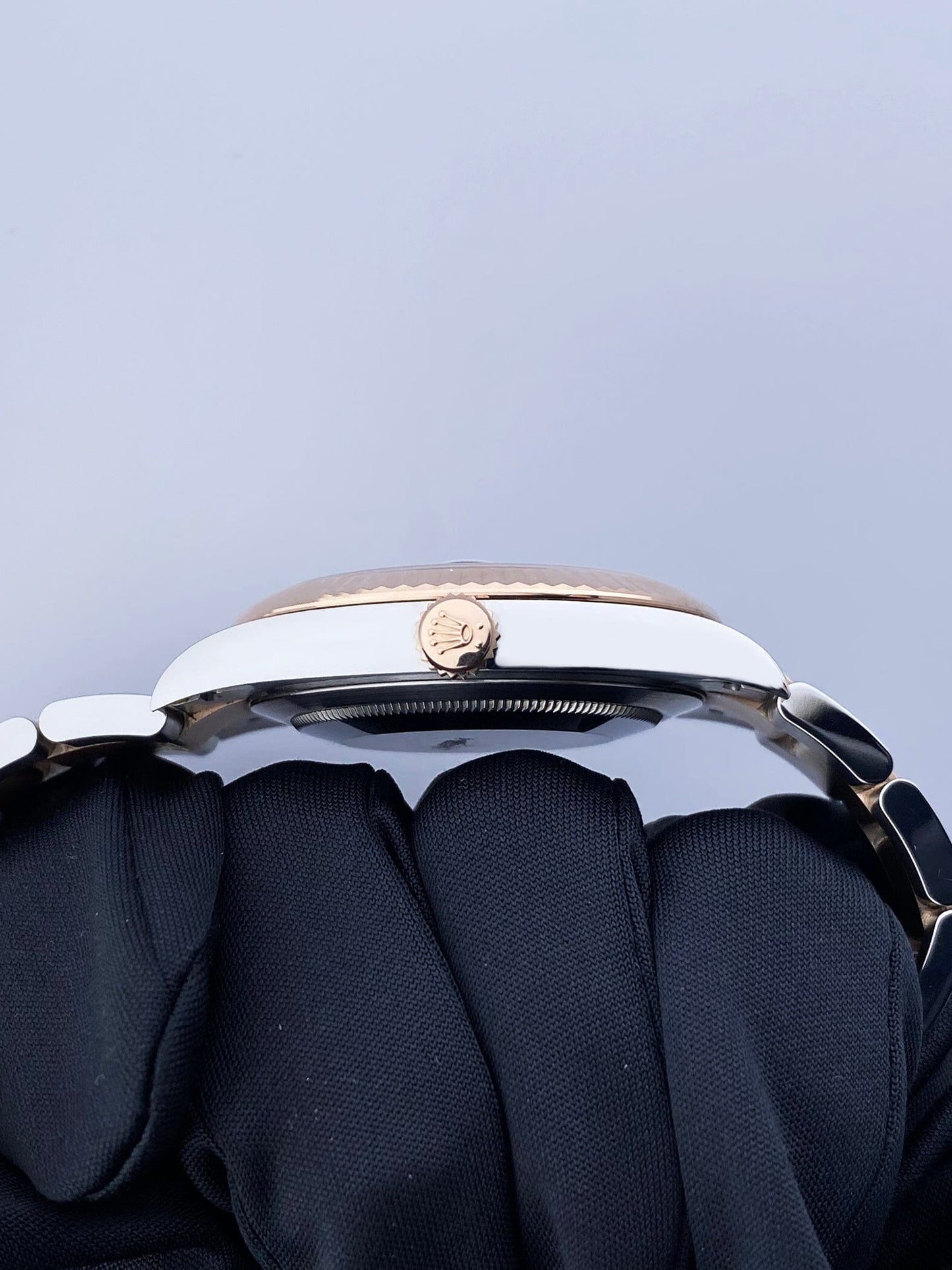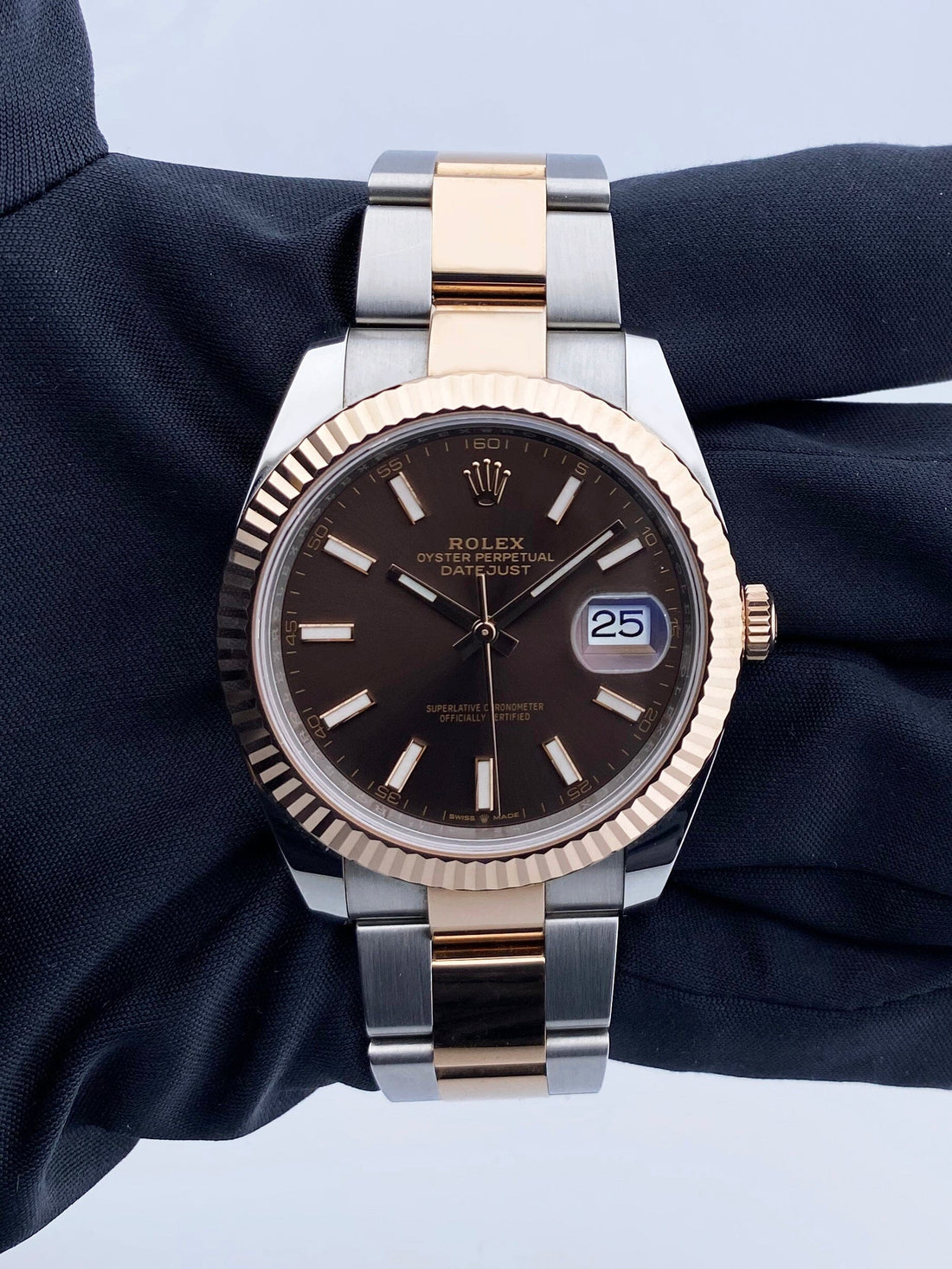 Rolex Oyster Perpetual Datejust 41 126331 Mens Watch. 41mm stainless steel case with 18K rose gold fluted bezel. Chocolate dial with luminous rose gold hands and luminous index hour marker. Date display at the 3 o'clock position. Stainless steel & 18K rose gold Oyster bracelet with fold-over clasp. Will fit up to 7.5-Inch wrist. Sapphire crystal. Stainless steel case back. Calibre 3235 automatic self-winding movement. This will come with Box and Papers.