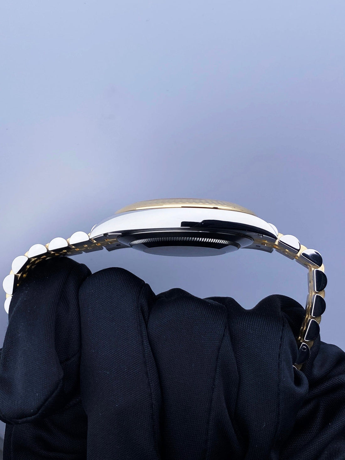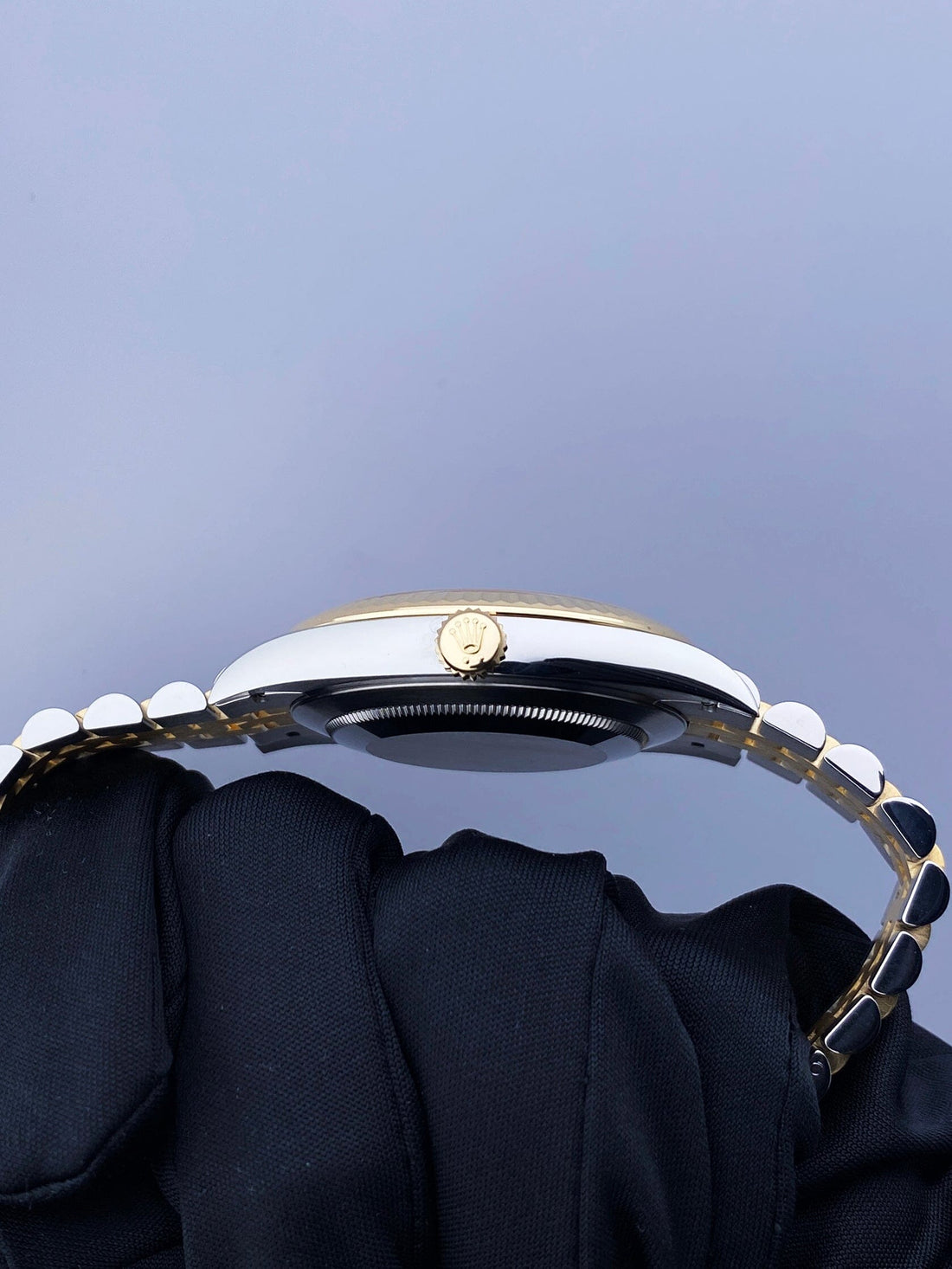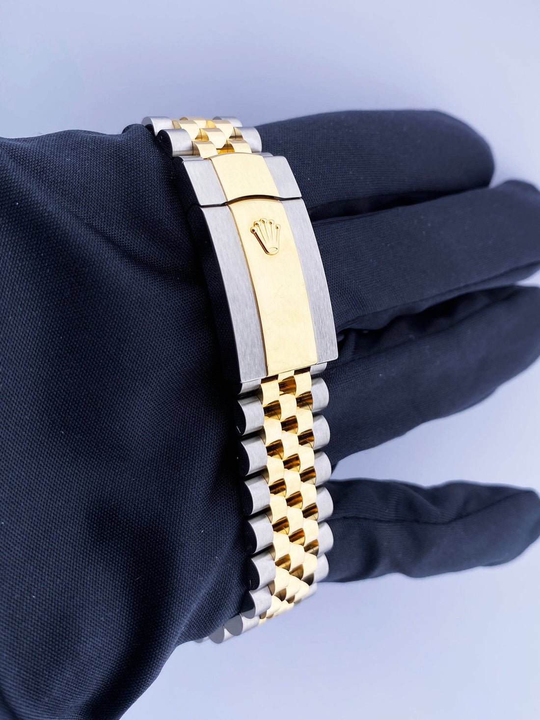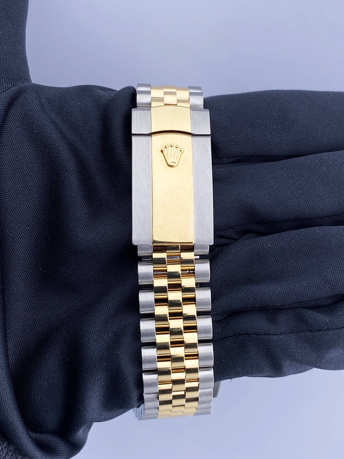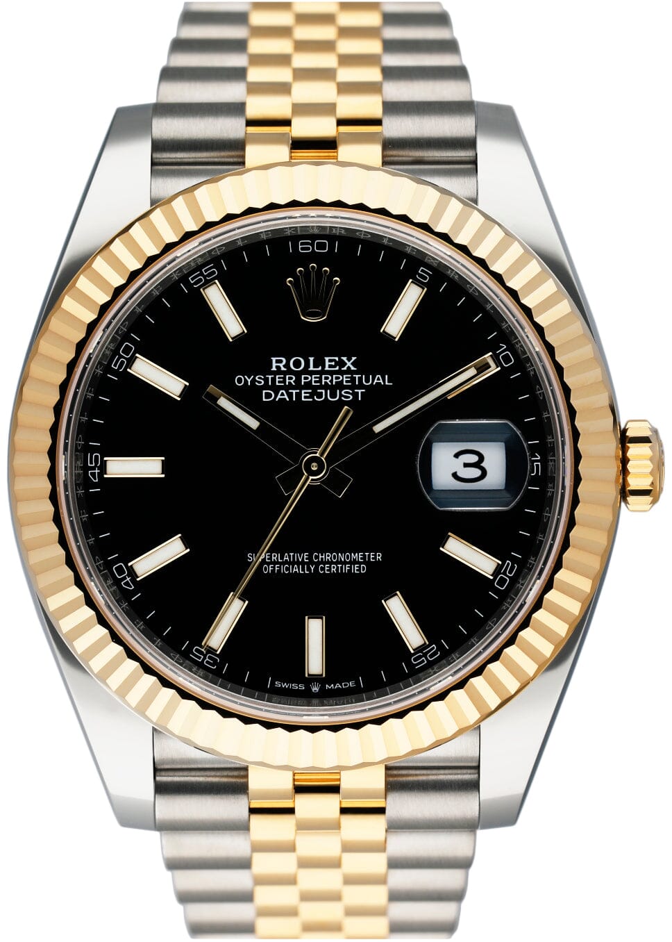 Rolex Datejust 41 126333 Mens Watch. 41mm stainless steel case with 18K yellow gold fluted bezel. Black dial with gold hands and index hour index marker. Engraved rehaut. Date display at the 3 o'clock position. Minute markers on the outer dial. 18K yellow gold & stainless steel Jubilee bracelet with fold over clasp. Will fit up to 7-inch wrist. Sapphire crystal. Stainless steel case back. Automatic self-winding movement. This watch comes with original Box and Papers.