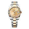 Rolex Datejust 41 126333 Mens Watch. 41mm stainless steel case with 18K yellow gold fluted bezel. Champagne dial with gold hands and index hour index marker. Engraved rehaut. Date display at the 3 o'clock position. Minute markers on the outer dial. 18K yellow gold & stainless steel Oyster bracelet with fold over clasp. Will fit up to 7.5-inch wrist. Sapphire crystal. Stainless steel case back. Automatic self-winding movement. This watch comes with original Box and Papers.