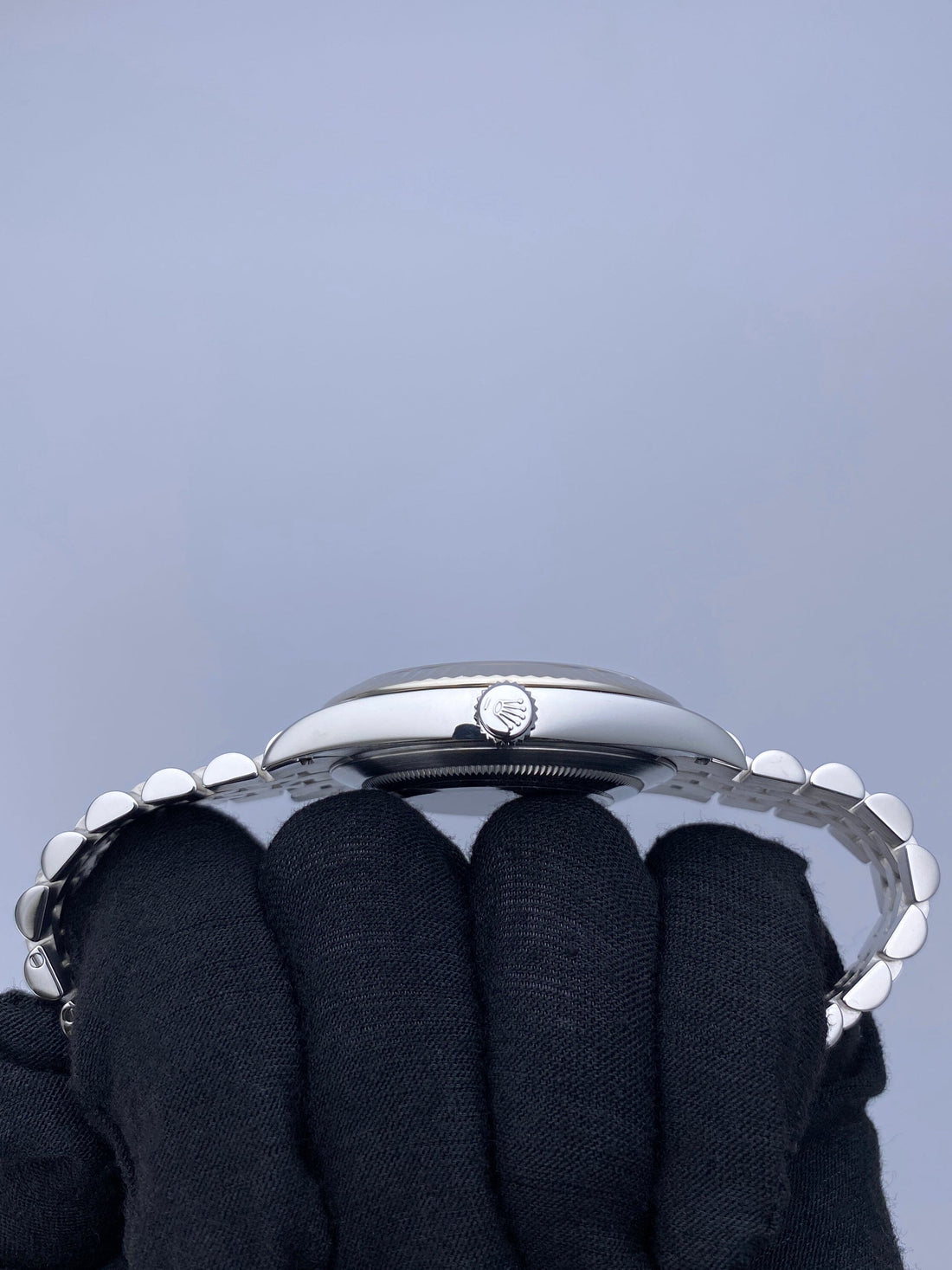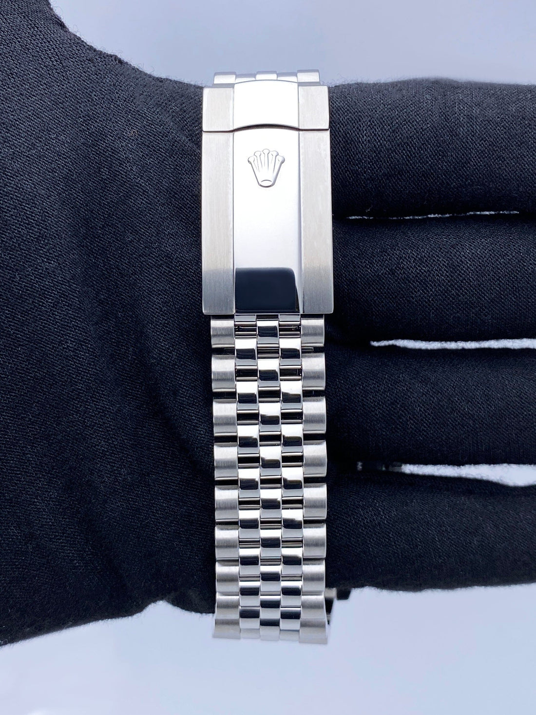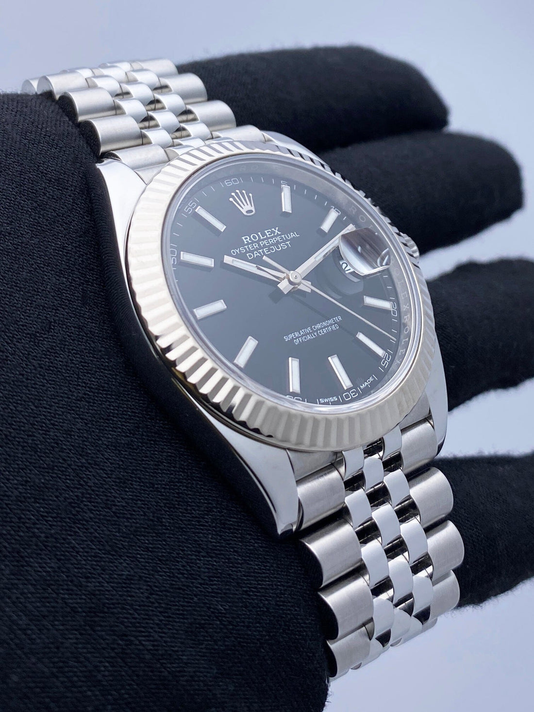 Rolex Datejust 41 126334 Mens Watch. 41mm stainless steel case with 18K white gold fluted bezel. Black dial with white gold luminous hands and luminous index hour marker. Date display at a 3 o'clock position. Stainless steel jubilee bracelet with fold over clasp. Will fit up to a 7.5-Inch wrist. Sapphire crystal. Stainless steel case back. Automatic-self winding movement.