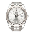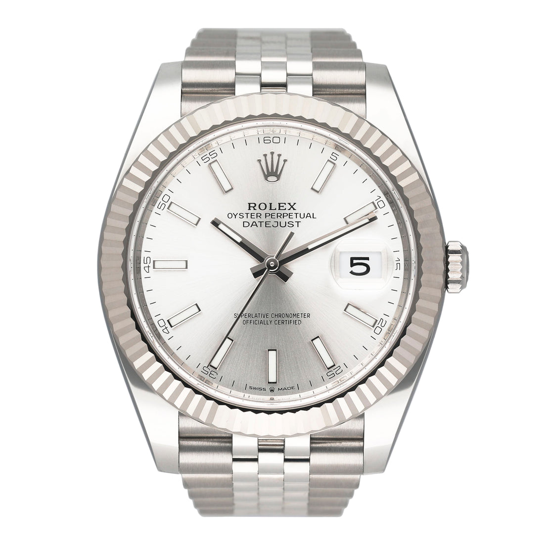 Rolex Datejust 41 126334 Mens Watch. 41mm stainless steel case with 18K White gold fluted bezel. Silver dial with white gold luminous hands and luminous index hour marker. Date display at a 3 o'clock position. Stainless steel Jubilee bracelet with fold over clasp. Will fit up to a 7.5-Inch wrist. Sapphire crystal. Stainless steel case back. Automatic-self winding movement. This watch comes with original Box and Papers.
