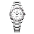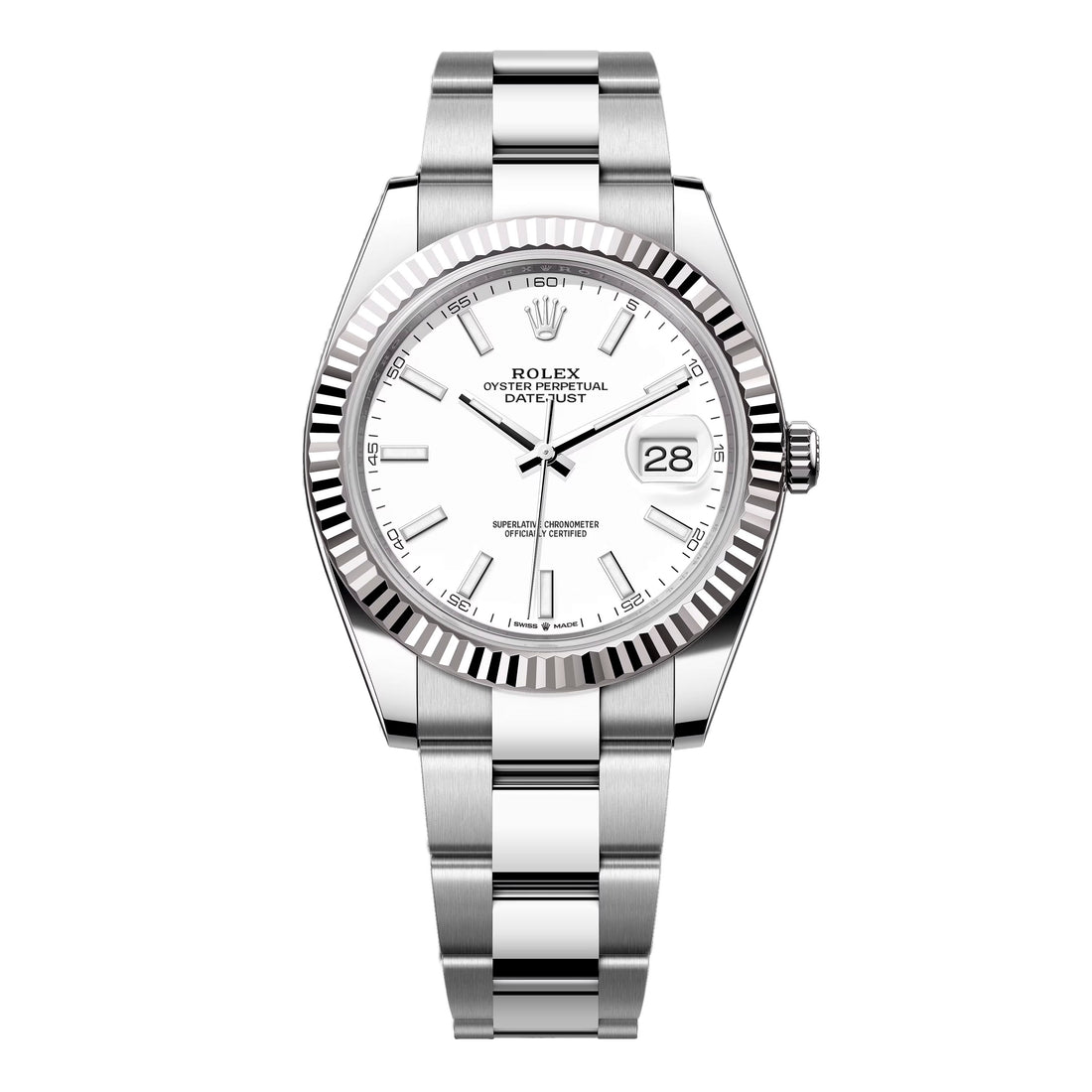 Rolex Datejust 41 126334 Mens Watch. 41mm stainless steel case with 18K White gold fluted bezel. White dial with white gold luminous hands and luminous index hour marker. Date display at a 3 o'clock position. Stainless steel Oyster bracelet with fold over clasp. Will fit up to a 7.5-Inch wrist. Sapphire crystal. Stainless steel case back. Automatic-self winding movement. This watch comes with original Box and Papers.