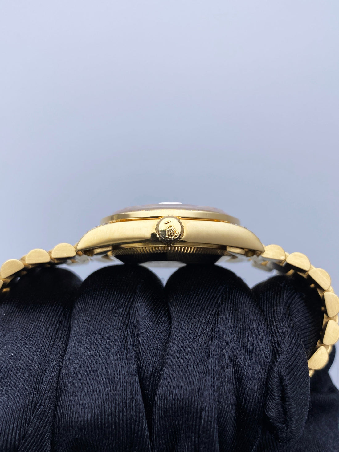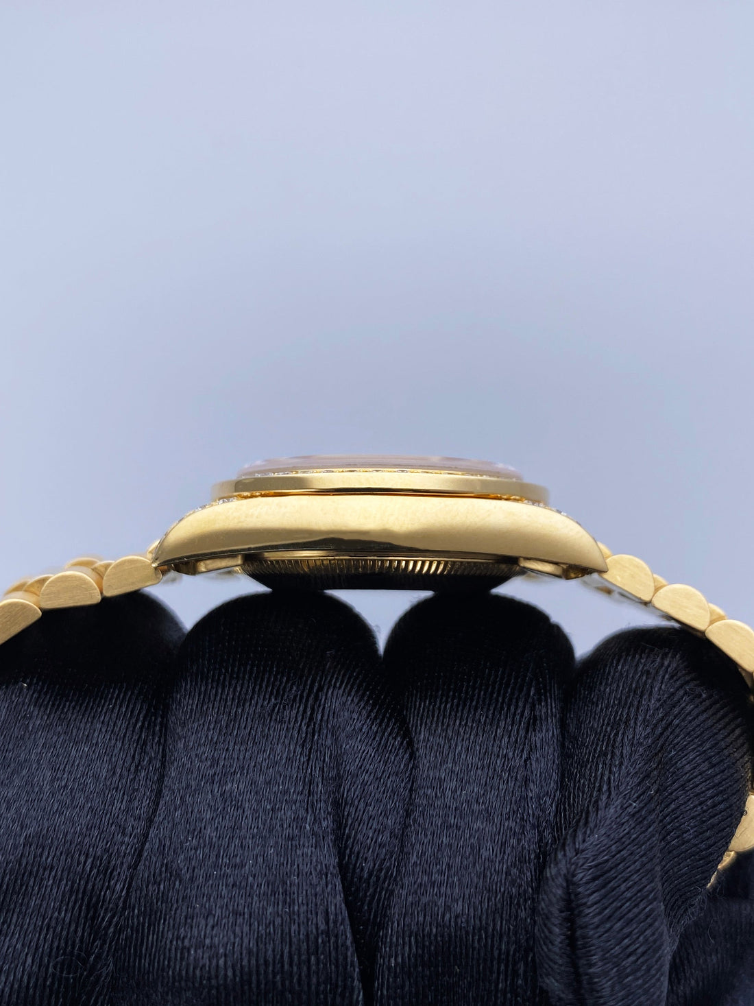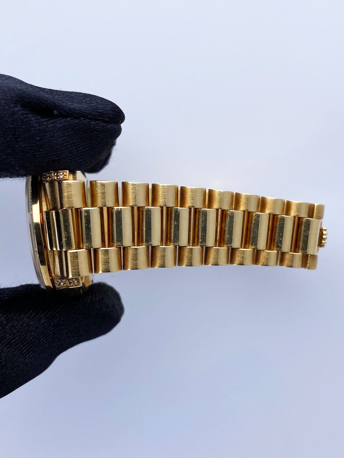 Rolex Datejust 68158 Ladies Watch. 31mm 18K yellow gold case. 18K yellow gold bezel with original factory diamond set and engraved "Rolex" below 6 o'clock position. Silver anniversary dial with gold hands and original factory diamond set hour marker. Date display at a 3 o'clock position. 18K yellow gold President bracelet with hidden fold-over clasp. Will fit up to a 5.5-Inch wrist. Sapphire crystal. 18K yellow gold case back. Automatic self-winding movement.