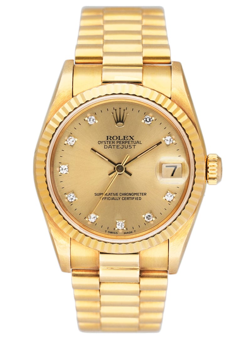 Rolex Oyster Perpetual Datejust 68278 Ladies Watch. 31mm 18k yellow gold case with 18K yellow gold fluted bezel. Champagne dial with gold hands and original factory diamond set hour marker. Date display at 3 o'clock position. 18K yellow gold President bracelet with a hidden fold over clasp. Will fit up to a 6-inch wrist. Sapphire crystal. 18K yellow gold case back. Automatic self-winding movement. This watch comes with original Box and Papers.