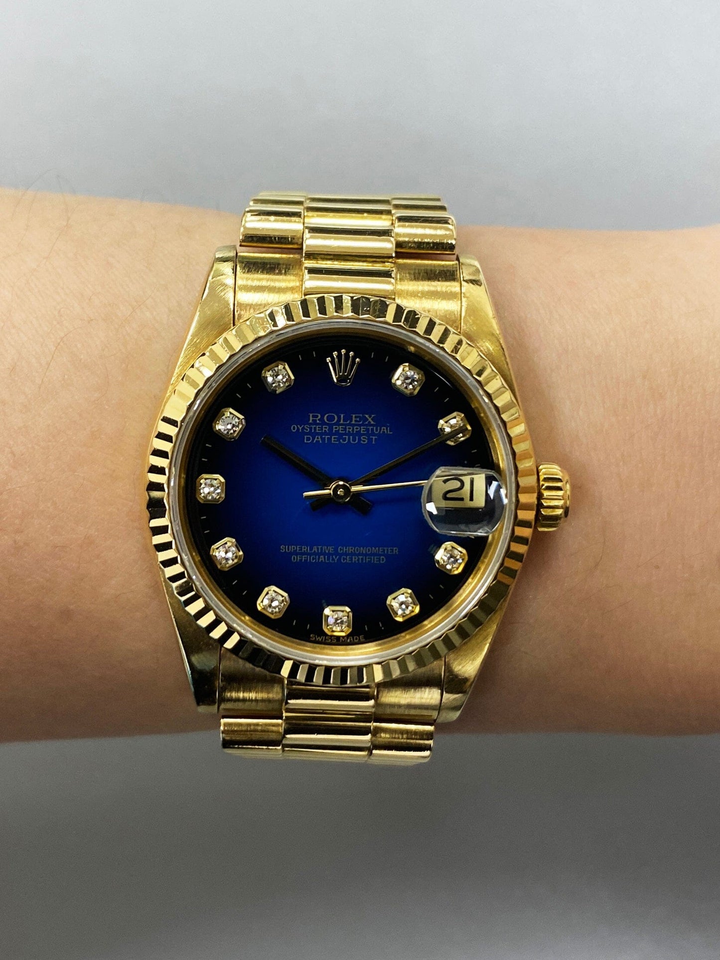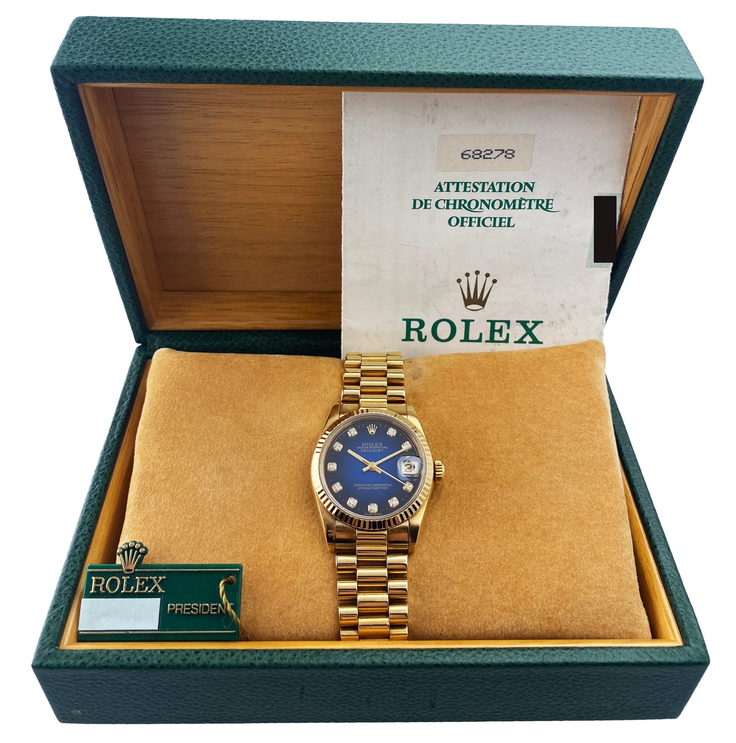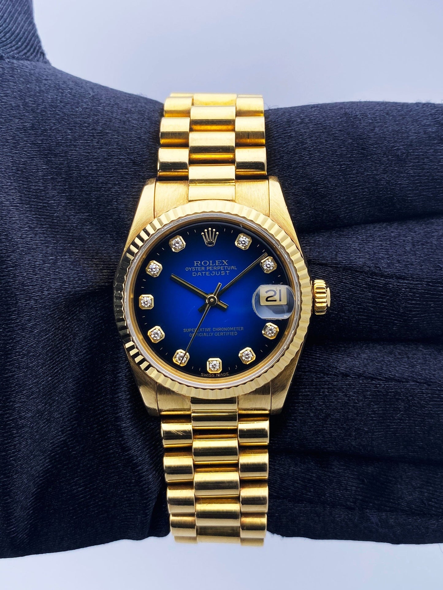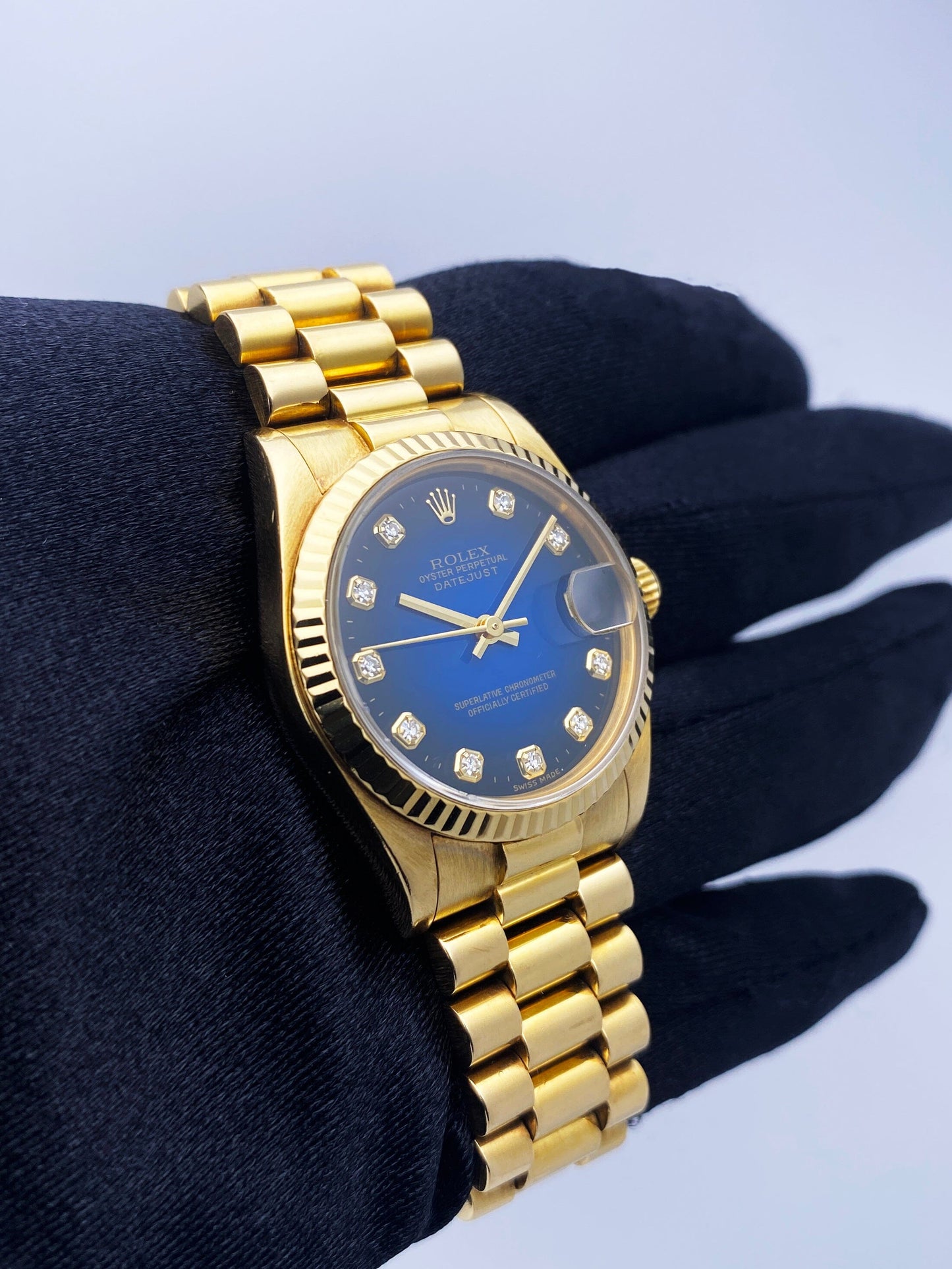Rolex Oyster Perpetual Datejust 68278 Ladies Watch. 31mm 18K yellow gold case with 18K yellow gold fluted bezel. Blue vignette dial with gold hands and original factory diamond set hour markers. Date display at 3 o'clock position. 18K yellow gold President bracelet with a hidden fold over clasp. Will fit up to a 6-inch wrist. Sapphire crystal. 18K yellow gold case back. Automatic self-winding movement. Circa: 1989. This watch comes with original Box and Papers.