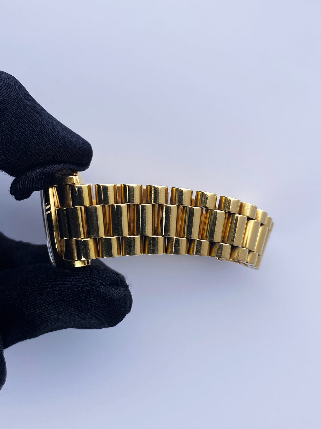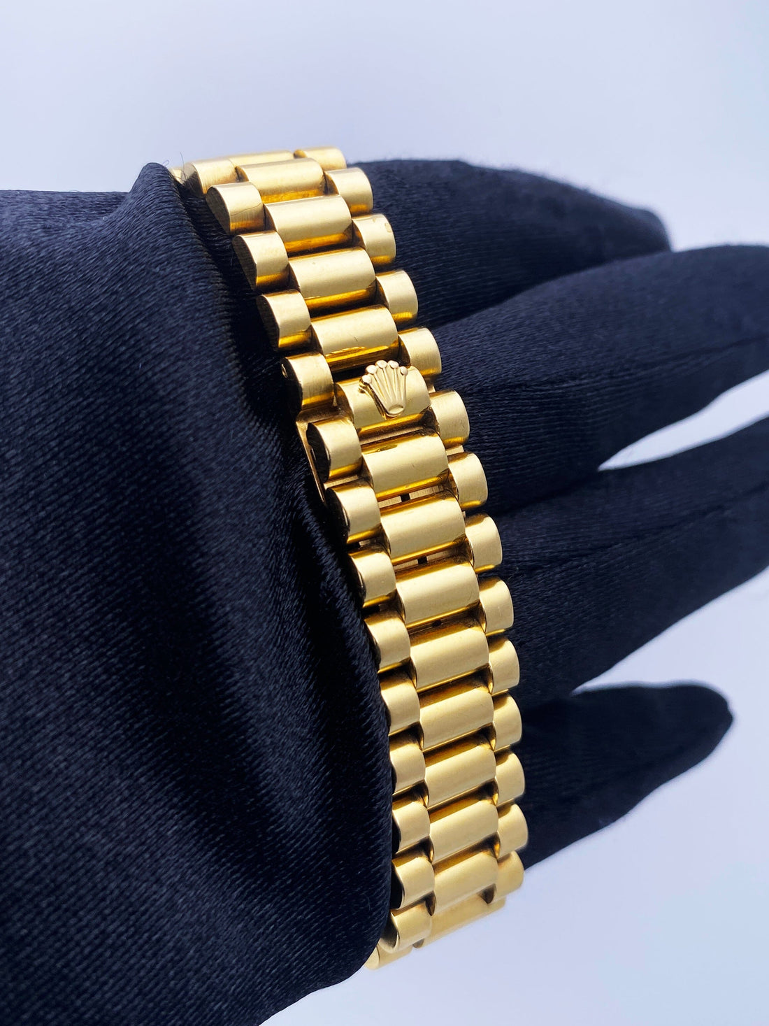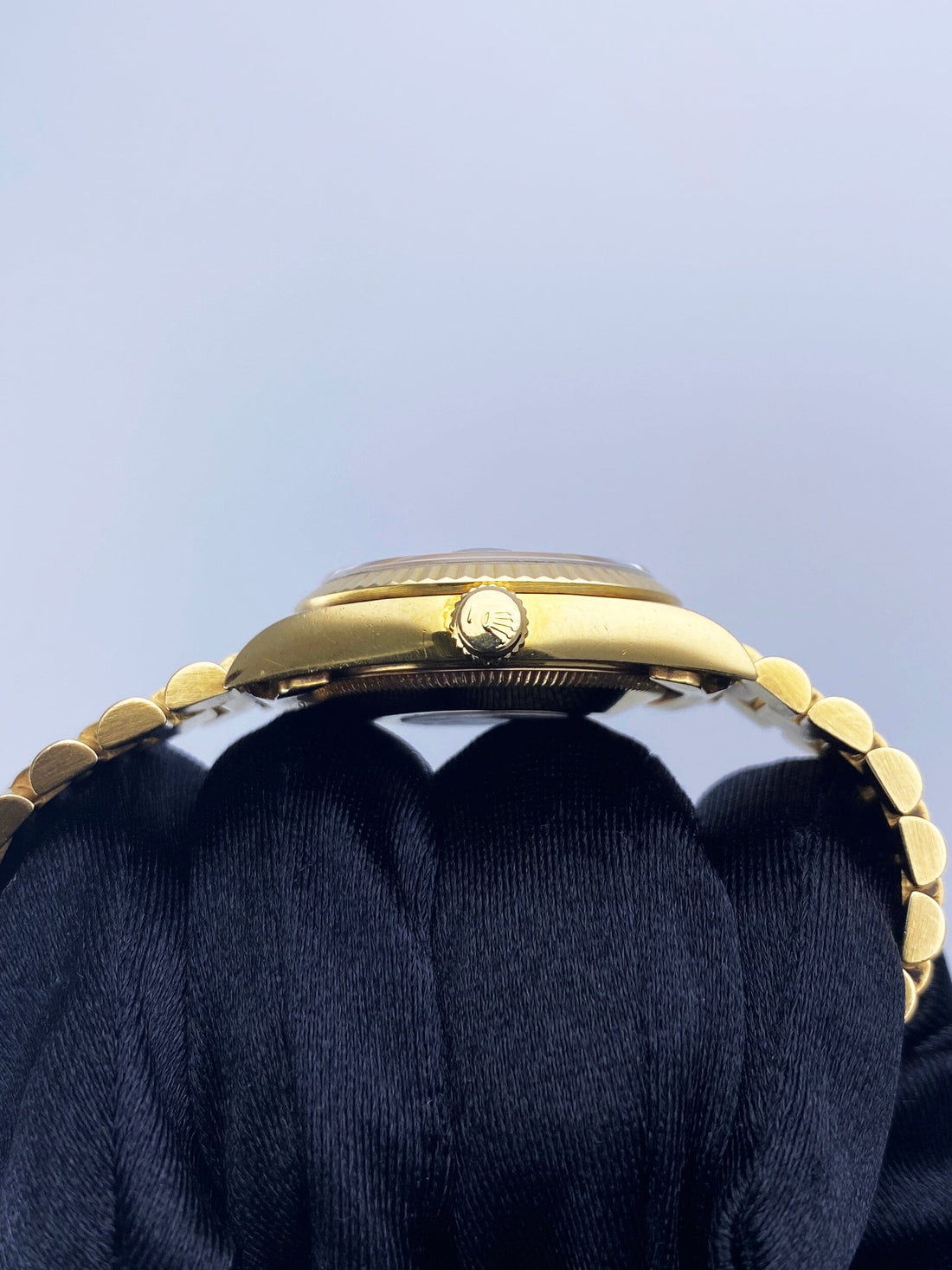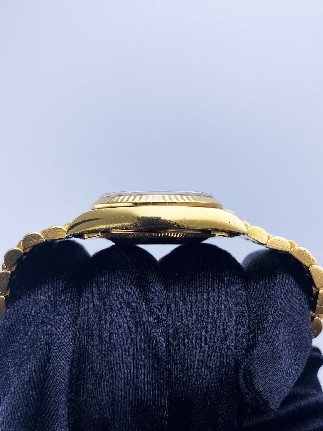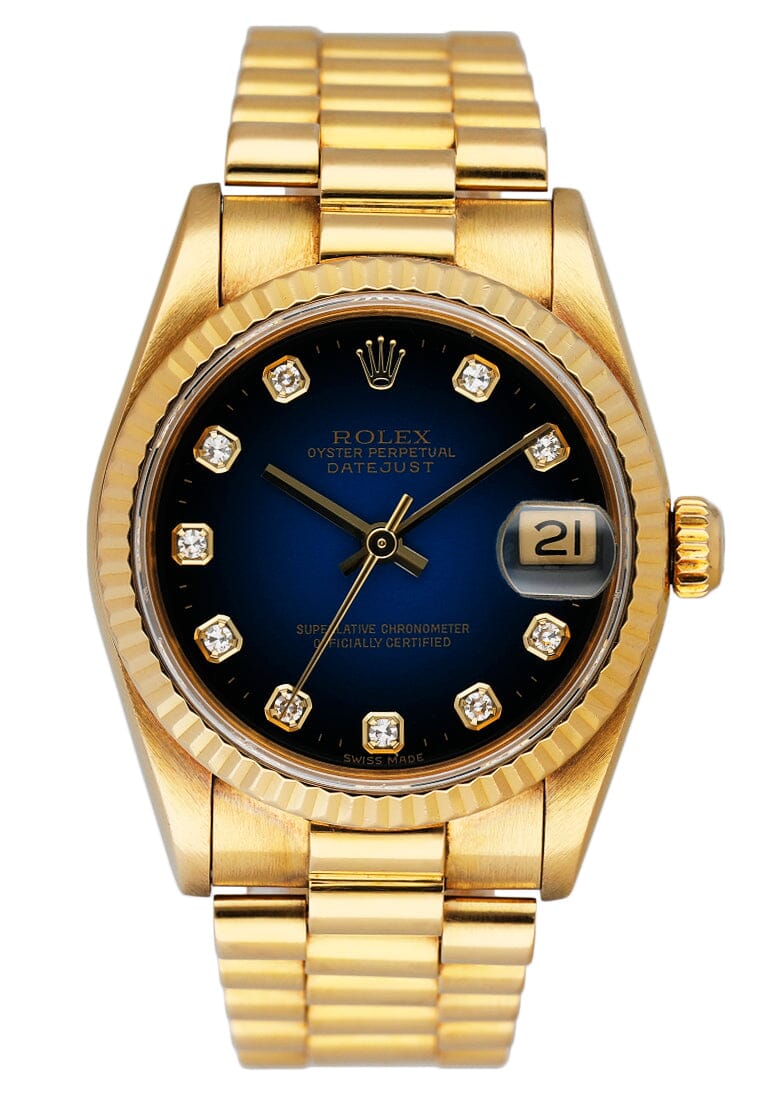 Rolex Oyster Perpetual Datejust 68278 Ladies Watch. 31mm 18K yellow gold case with 18K yellow gold fluted bezel. Blue vignette dial with gold hands and original factory diamond set hour markers. Date display at 3 o'clock position. 18K yellow gold President bracelet with a hidden fold over clasp. Will fit up to a 6-inch wrist. Sapphire crystal. 18K yellow gold case back. Automatic self-winding movement. Circa: 1989. This watch comes with original Box and Papers.