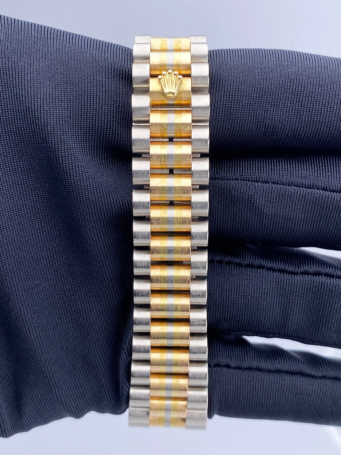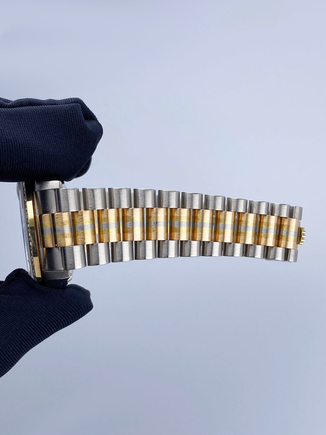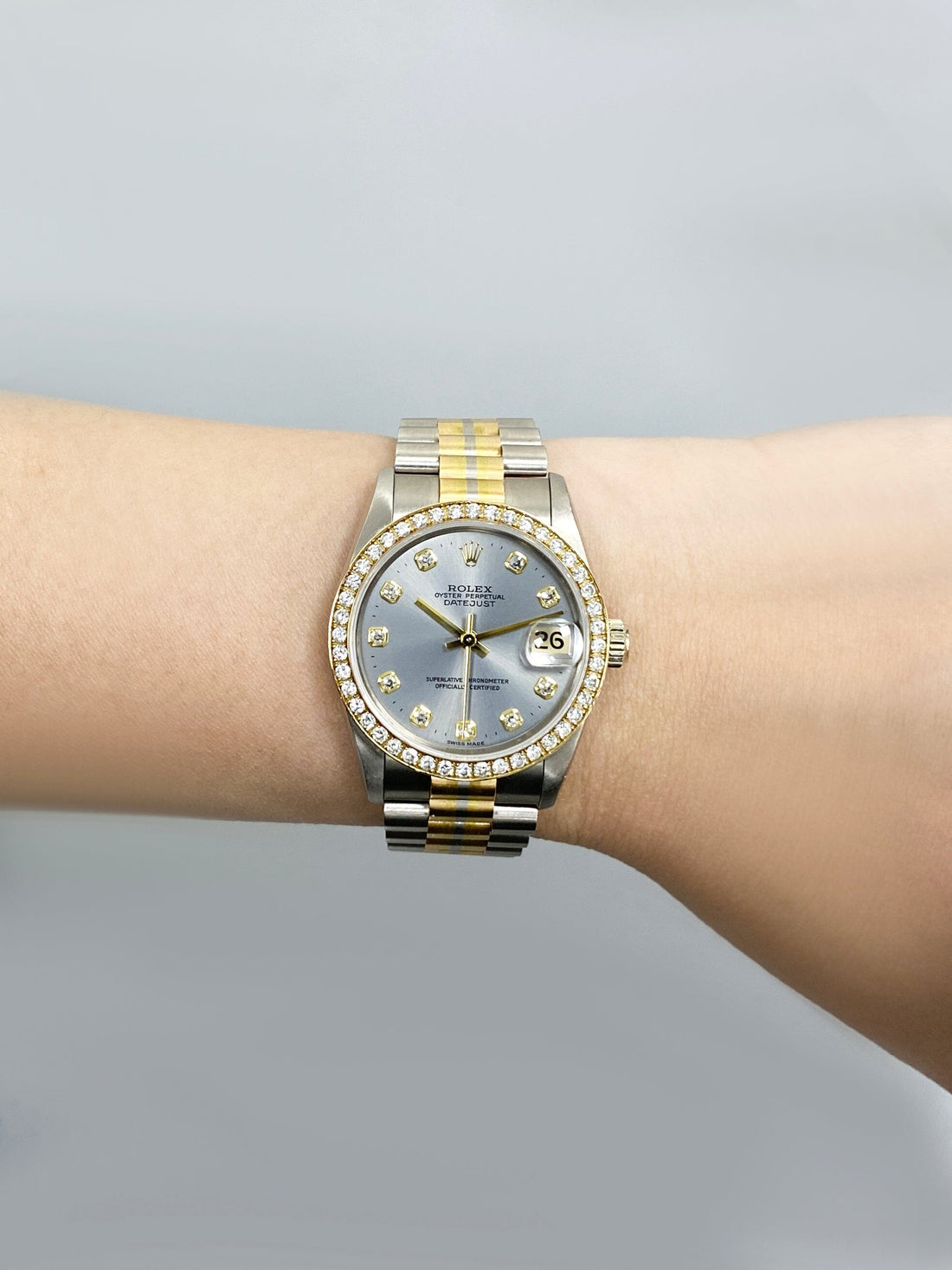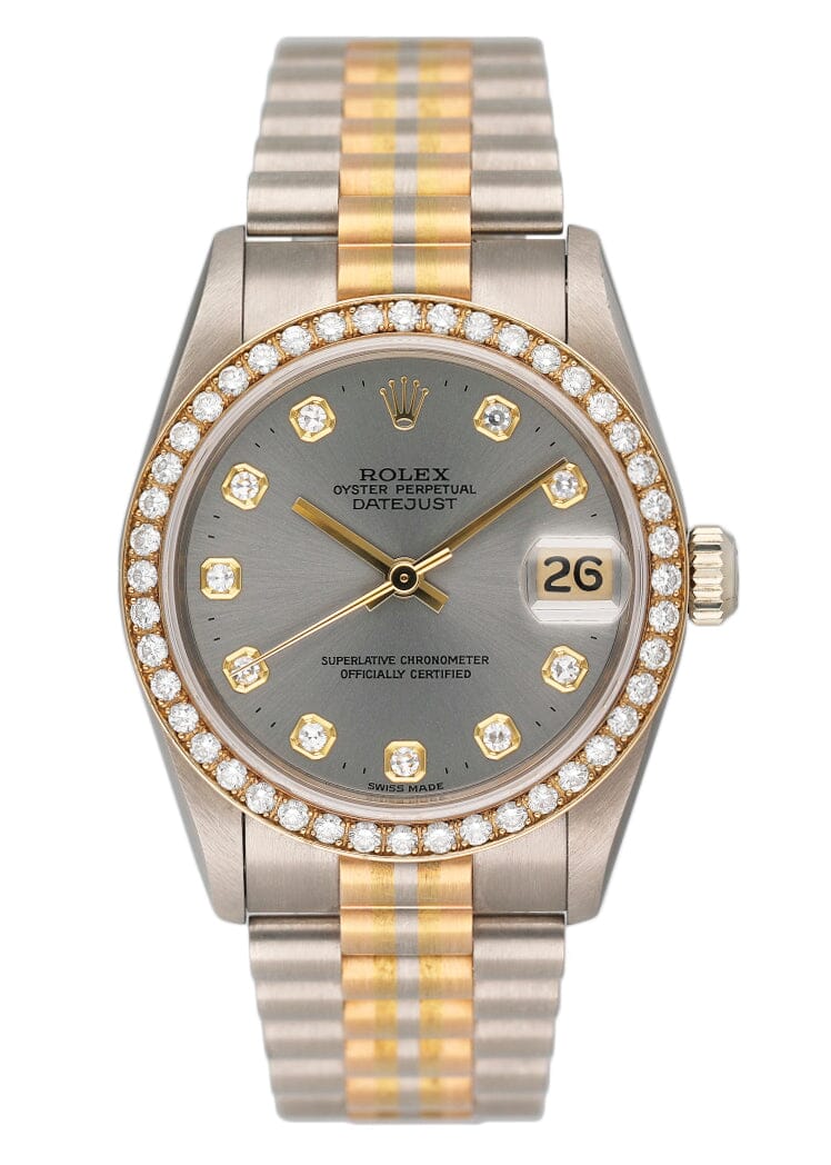 Rolex Datejust 68289 Ladies Watch. 31mm stainless steel case. 18K yellow gold fluted bezel with factory diamond. Gray dial with gold hands and factory diamond hour markers. Minute markers on the outer dial. Date display at the 3 o'clock position. Stainless steel & 18K yellow, white and rose gold President bracelet with fold over clasp. Will fit up to a 6.75-inch wrist. Sapphire crystal. Stainless steel case back. Automatic self-winding movement.