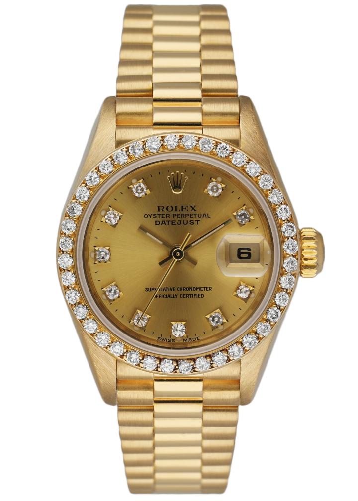 Rolex Datejust 69138 ladies watch. 26mm 18k Yellow Gold case. 18K yellow gold bezel with factory diamond set. Champagne dial with gold luminous hands and factory diamond hour markers. Minute markers on the outer dial. Date display at the 3 o'clock position. 18K yellow gold bracelet with hidden fold over clasp. Will fit up to a 6-inch wrist. Sapphire Crystal, and 18K yellow gold case back. Automatic self-winding chronometer movement. Circa:1984. Original box and papers included.