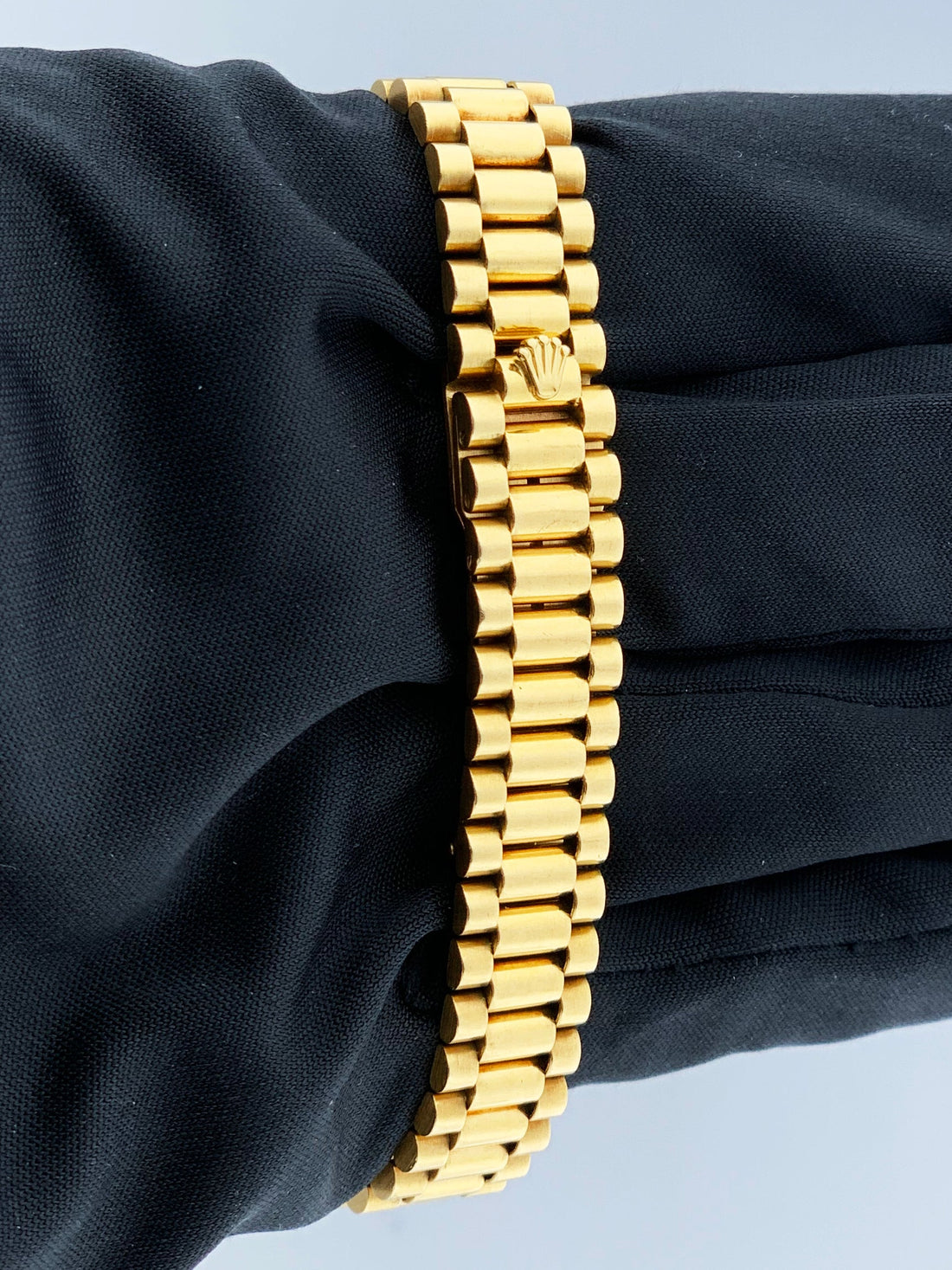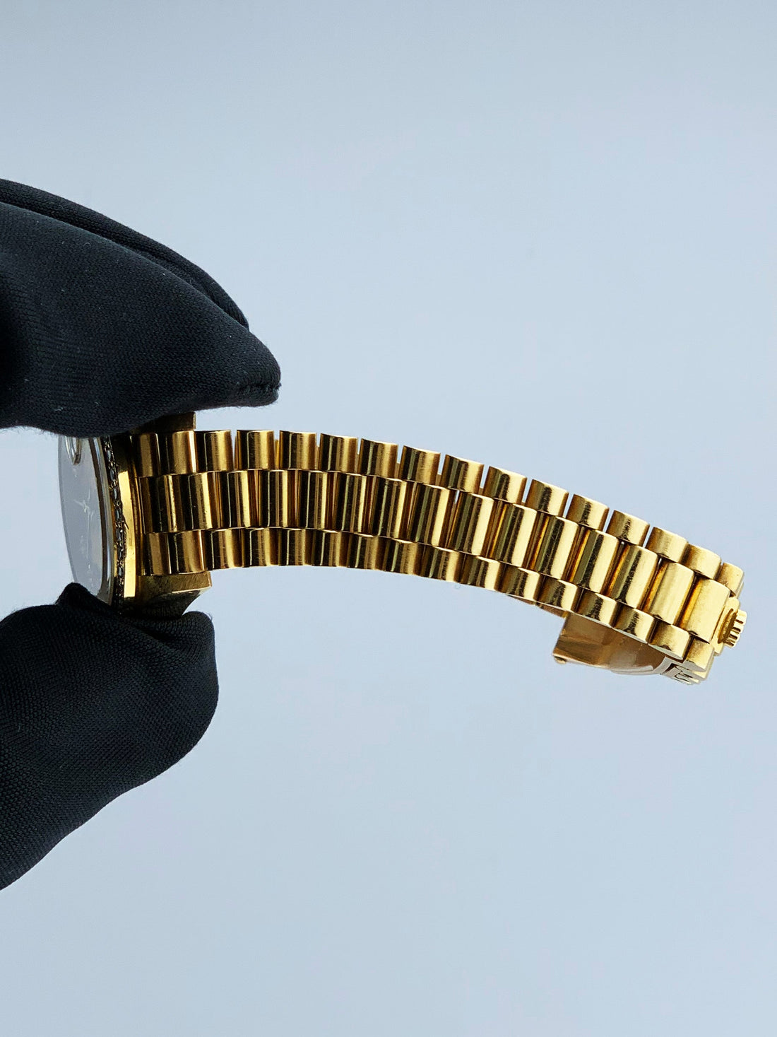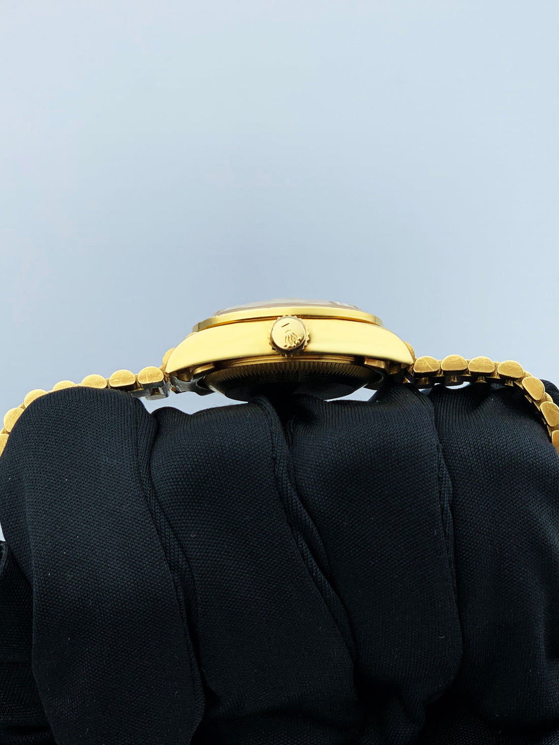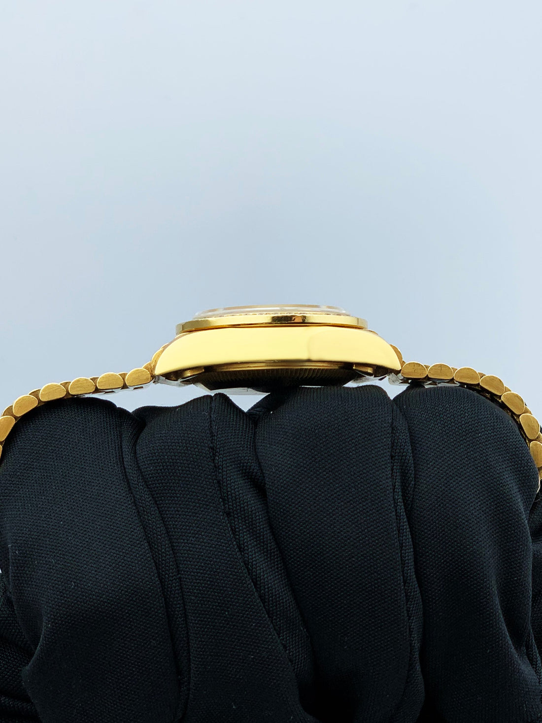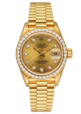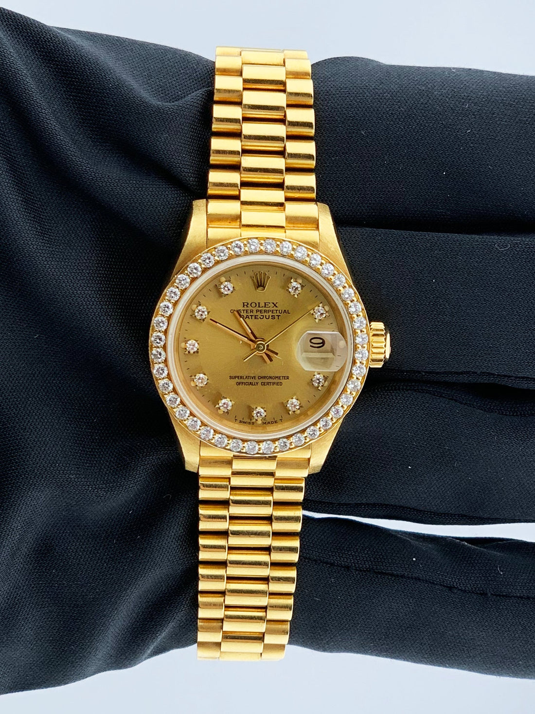 Rolex Datejust 69138 Ladies Watch. 26mm 18k Yellow Gold case. 18K yellow gold with original factory diamond set bezel. Champagne dial with gold luminous hands and original factory diamond set hour markers. Minute markers on the outer dial. Date display at the 3 o'clock position. 18K yellow gold president bracelet with 18K rose gold hidden fold over clasp. Will fit up to a 6-inch wrist. Sapphire crystal. 18K yellow gold case back. Automatic self-winding chronometer movement.