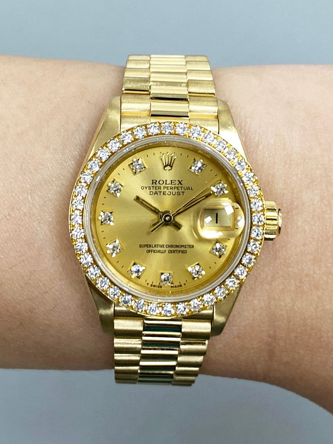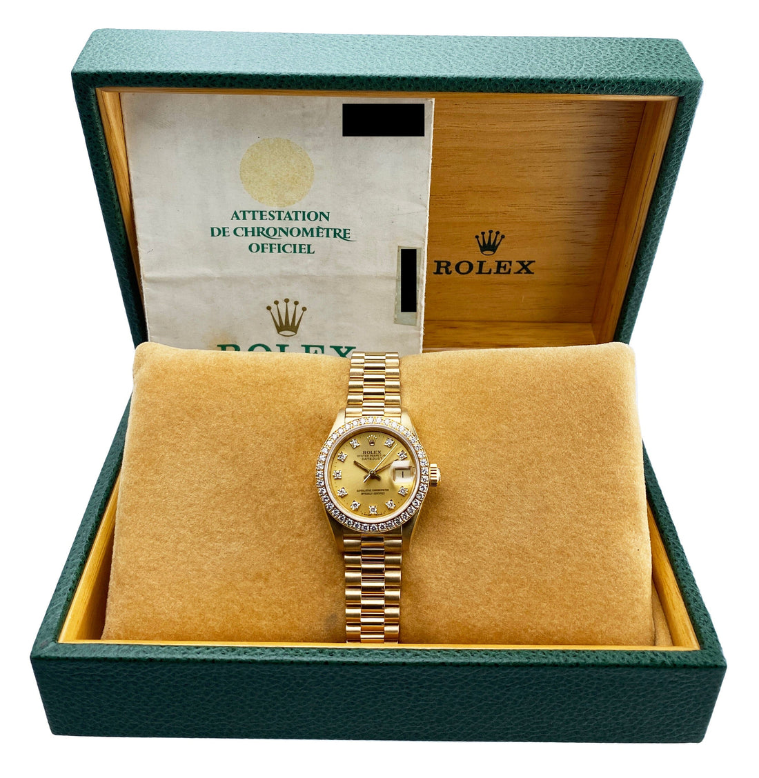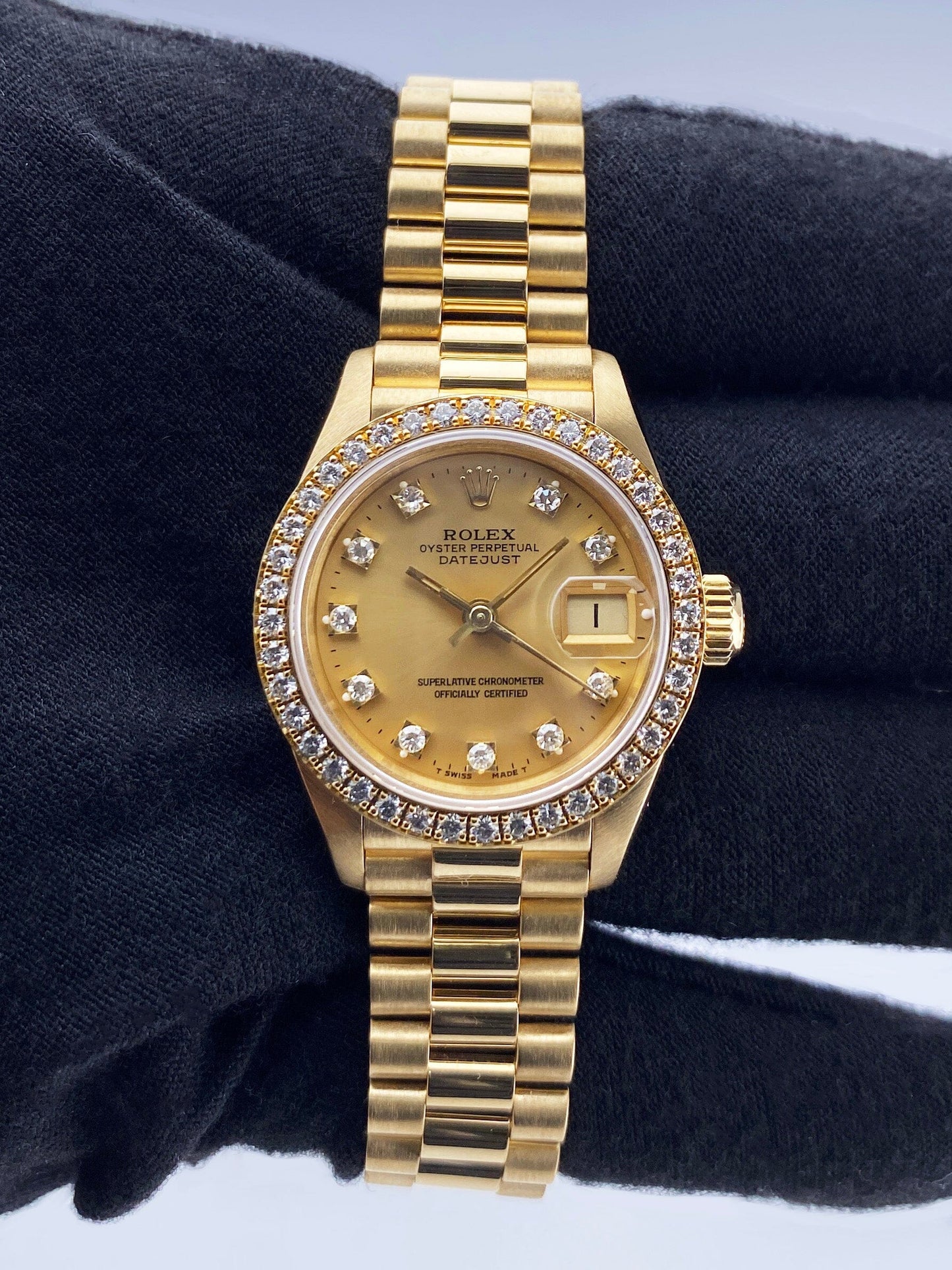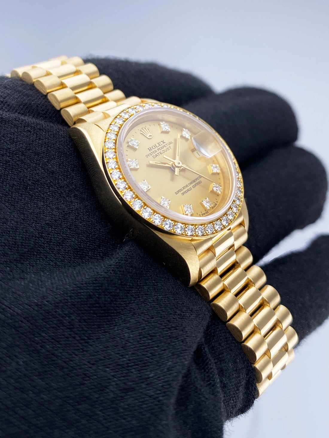 Rolex Datejust 69138 Ladies Watch. 26mm 18k Yellow Gold case. 18K yellow gold with original factory diamond set bezel. Champagne dial with gold luminous hands and original factory diamond set hour markers. Minute markers on the outer dial. Date display at the 3 o'clock position. 18K yellow gold president bracelet with 18K rose gold hidden fold over clasp. Will fit up to a 6-inch wrist. Sapphire crystal. 18K yellow gold case back. Automatic self-winding chronometer movement. This watch comes with Box and Papers.