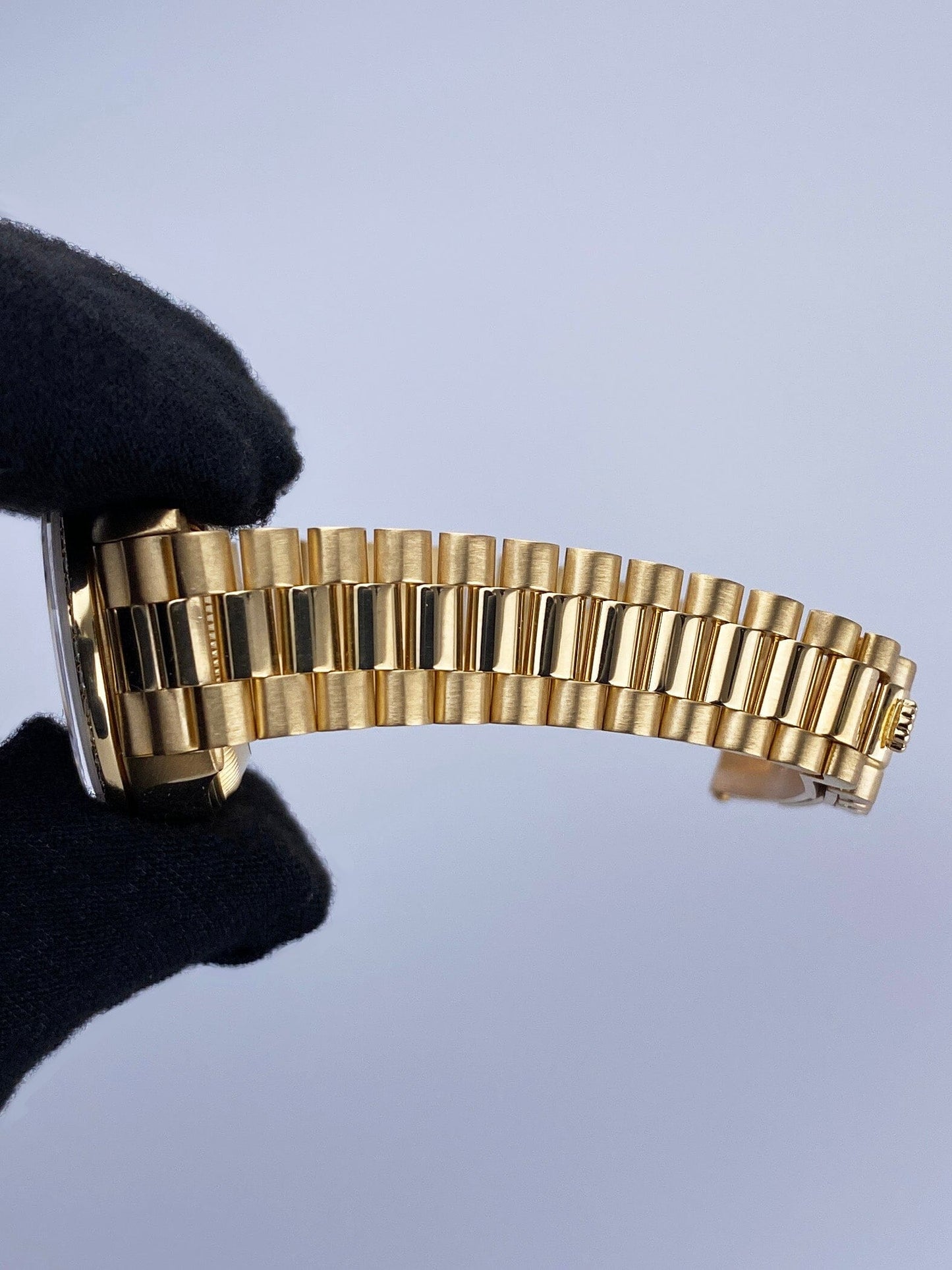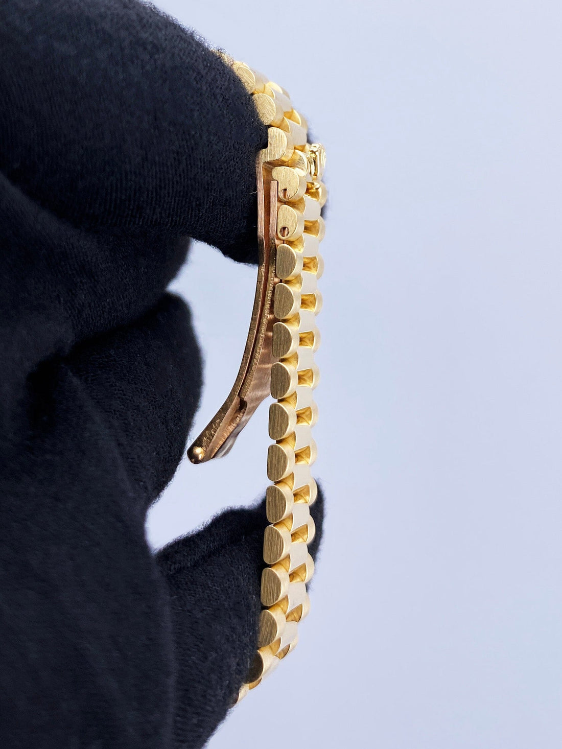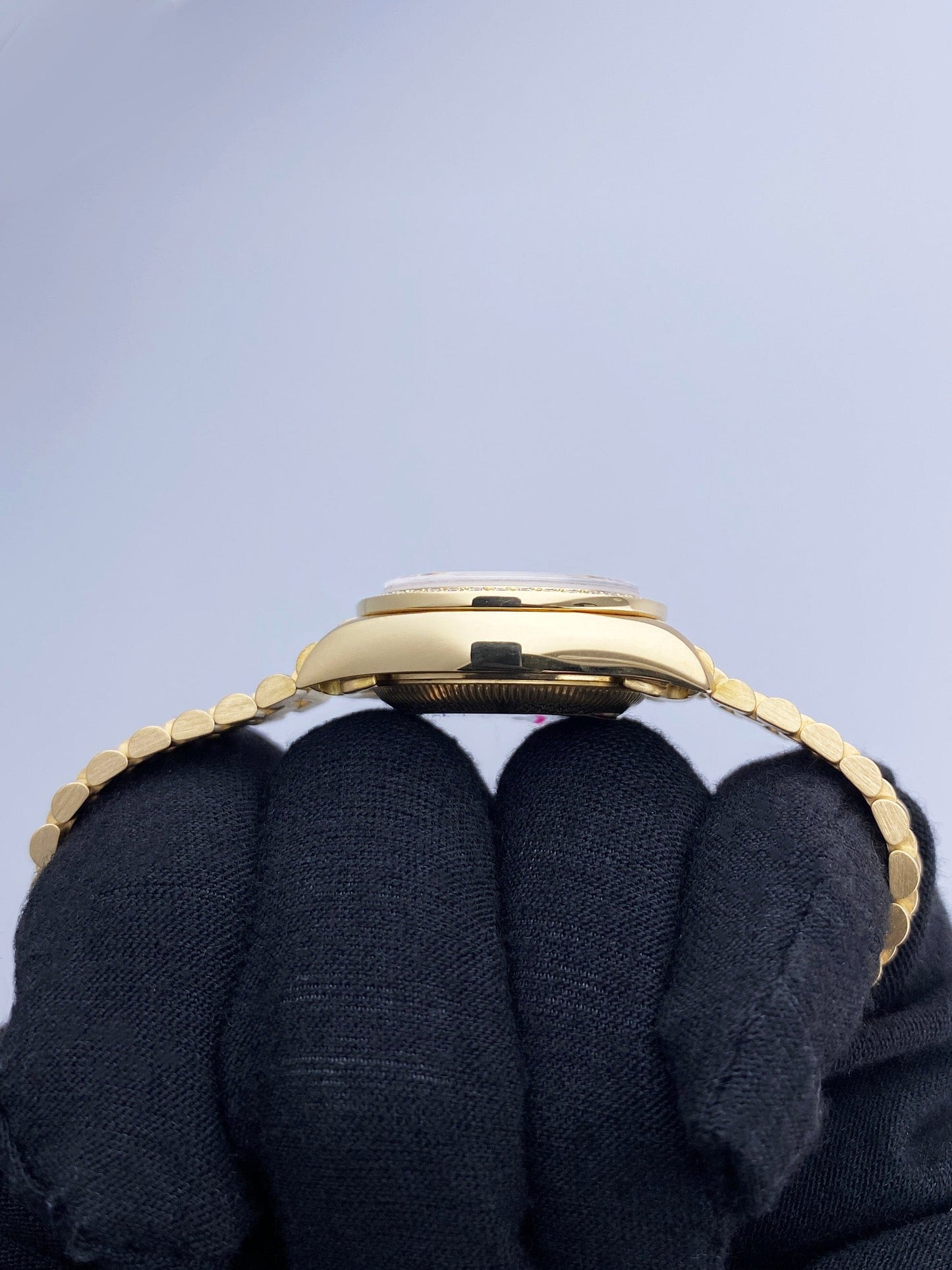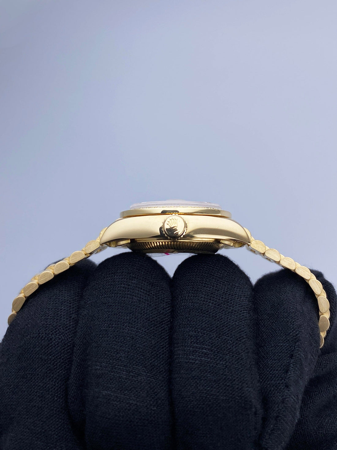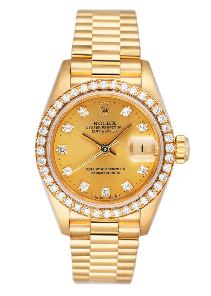 Rolex Datejust 69138 Ladies Watch. 26mm 18k Yellow Gold case. 18K yellow gold with original factory diamond set bezel. Champagne dial with gold luminous hands and original factory diamond set hour markers. Minute markers on the outer dial. Date display at the 3 o'clock position. 18K yellow gold president bracelet with 18K rose gold hidden fold over clasp. Will fit up to a 6-inch wrist. Sapphire crystal. 18K yellow gold case back. Automatic self-winding chronometer movement. This watch comes with Box and Papers.