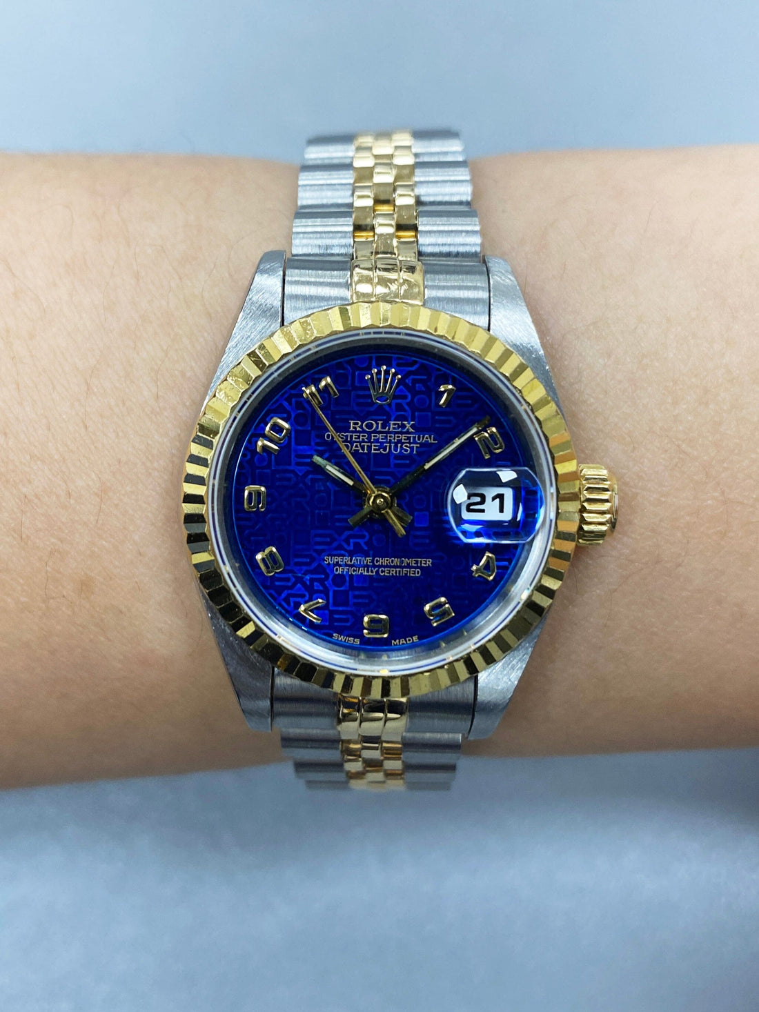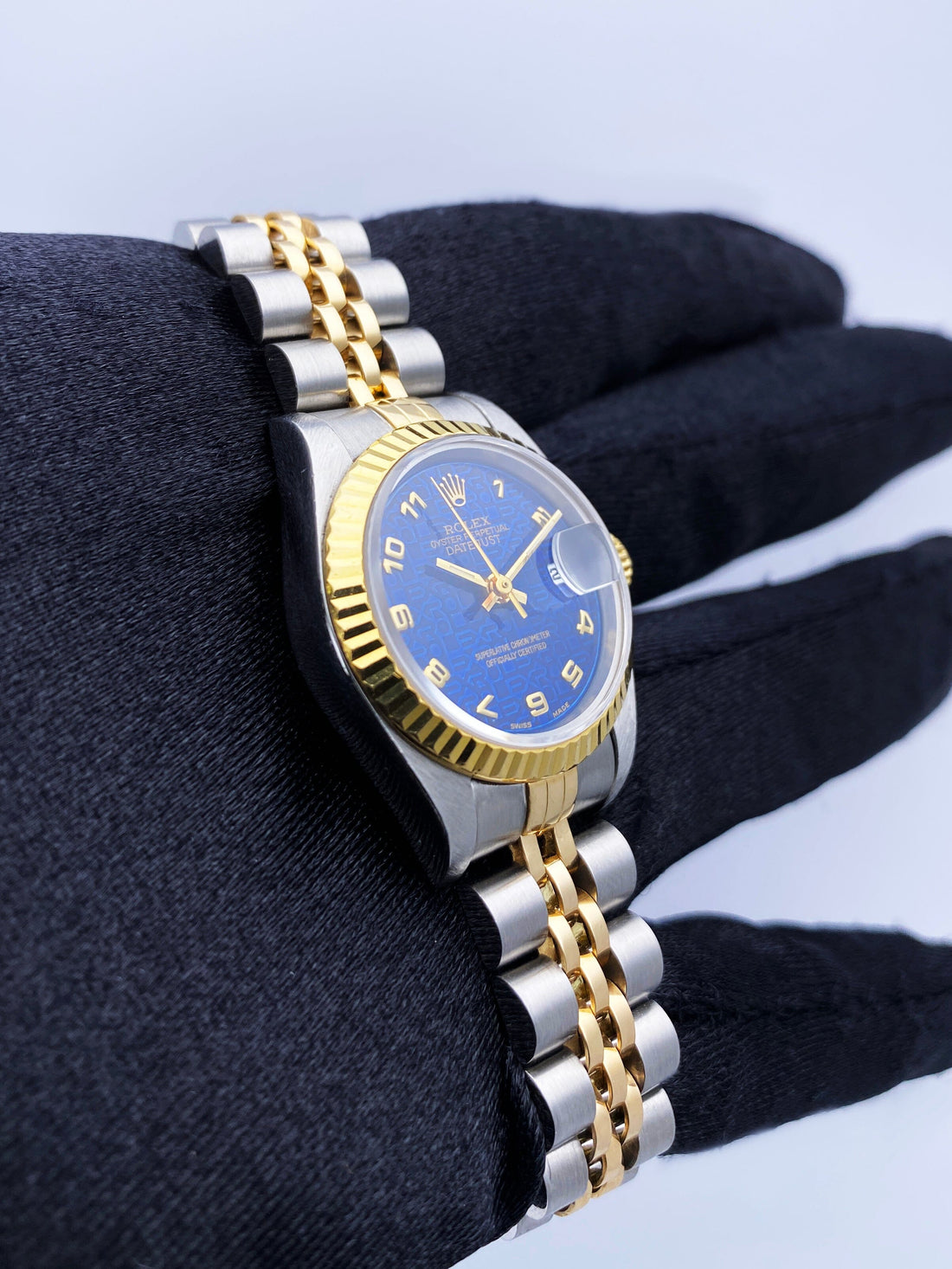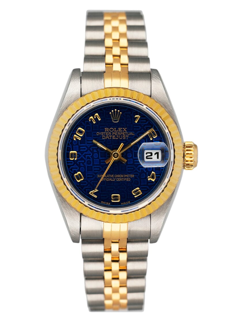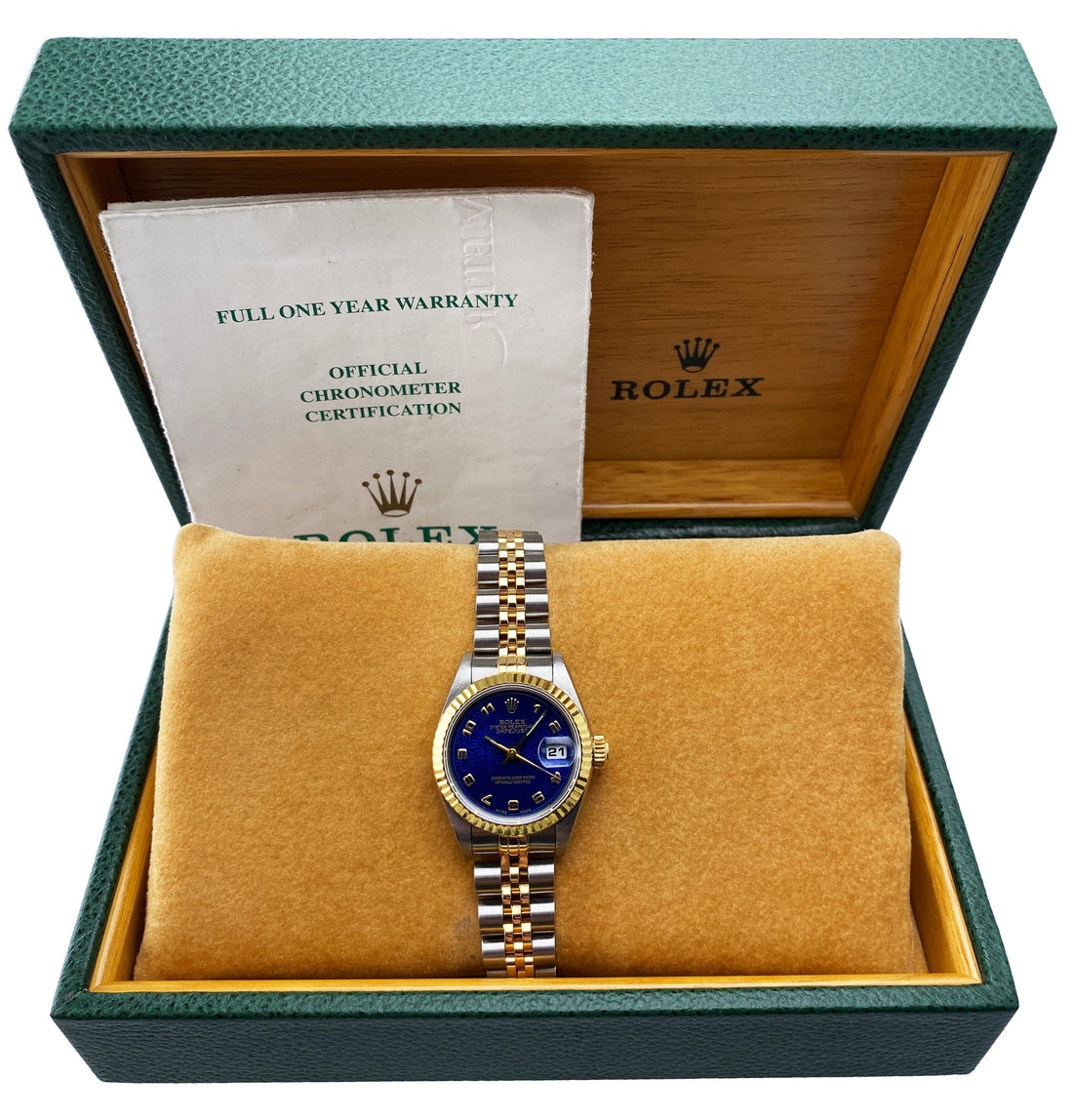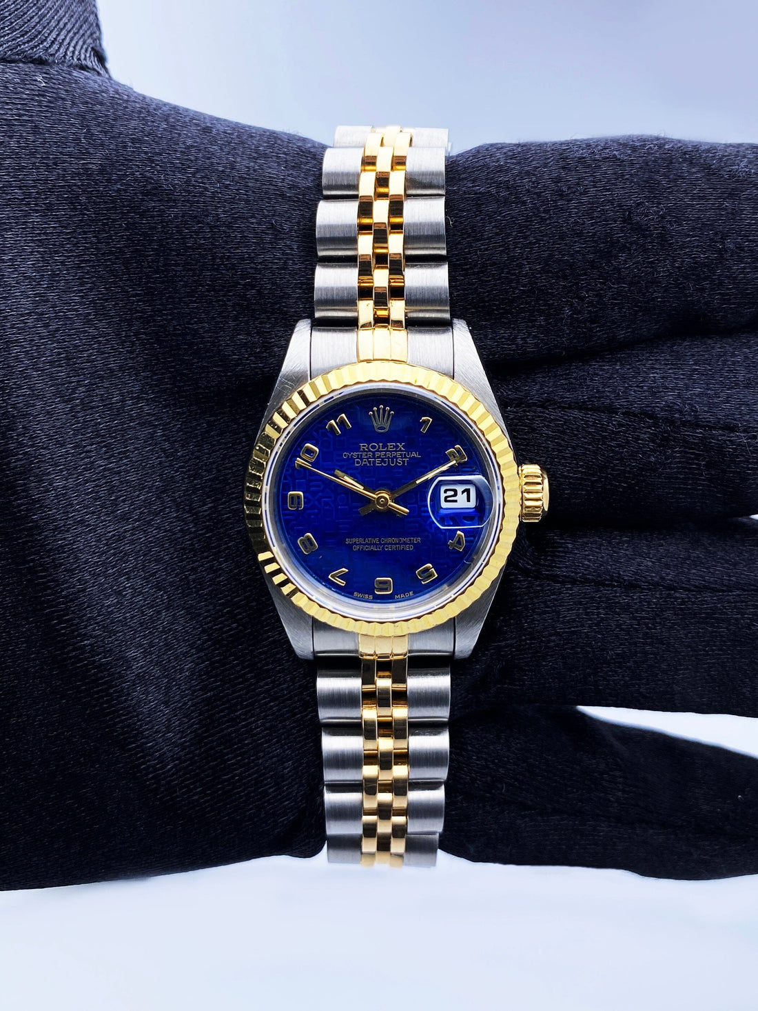 Rolex Datejust 69173 Ladies Watch. 26mm stainless steel case with 18K yellow gold fluted bezel. Blue Anniversary dial with gold hands and Arabic numeral hour markers. The date is displayed at the 3 o'clock position. Stainless steel & 18K yellow gold Jubilee bracelet with a fold-over clasp. Will fit up to a 6-inch wrist. Sapphire crystal. Stainless steel case back. Automatic self-winding chronometer movement. This watch comes with the original Box and Papers. Circa: 1996.