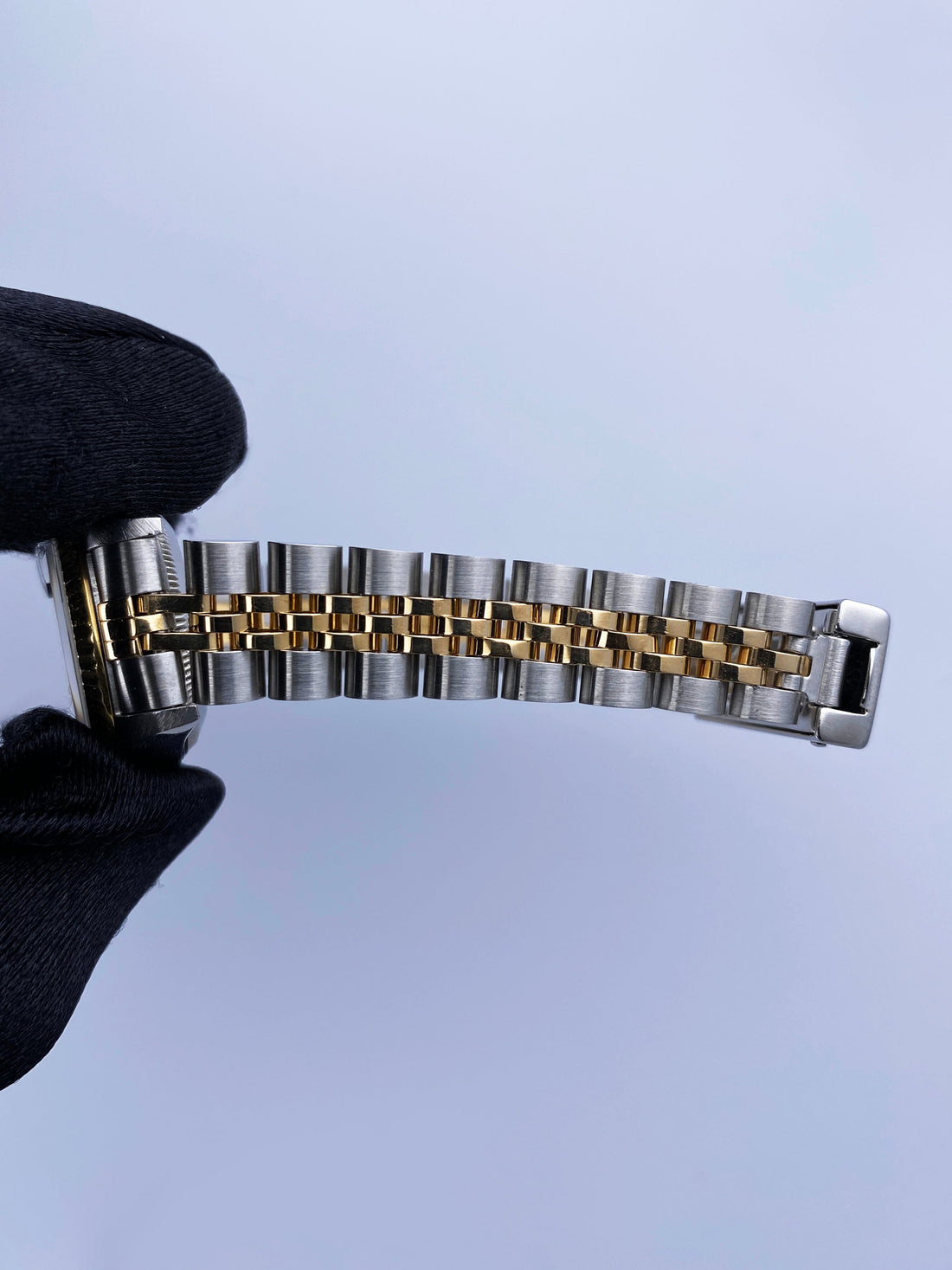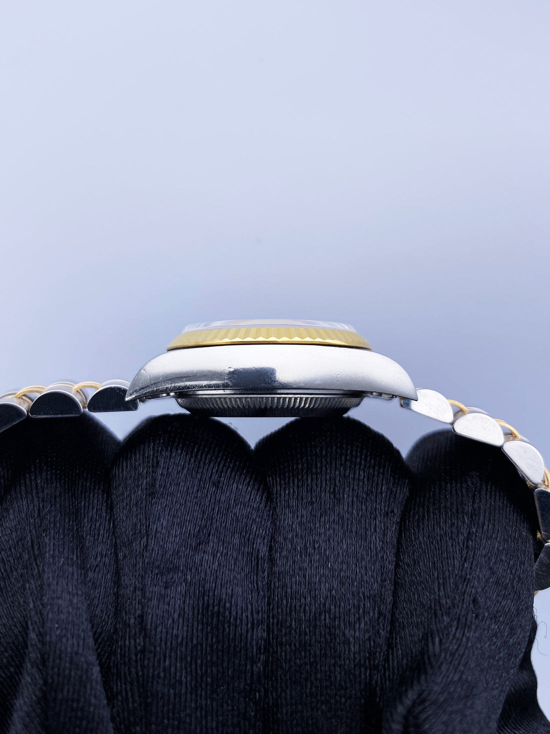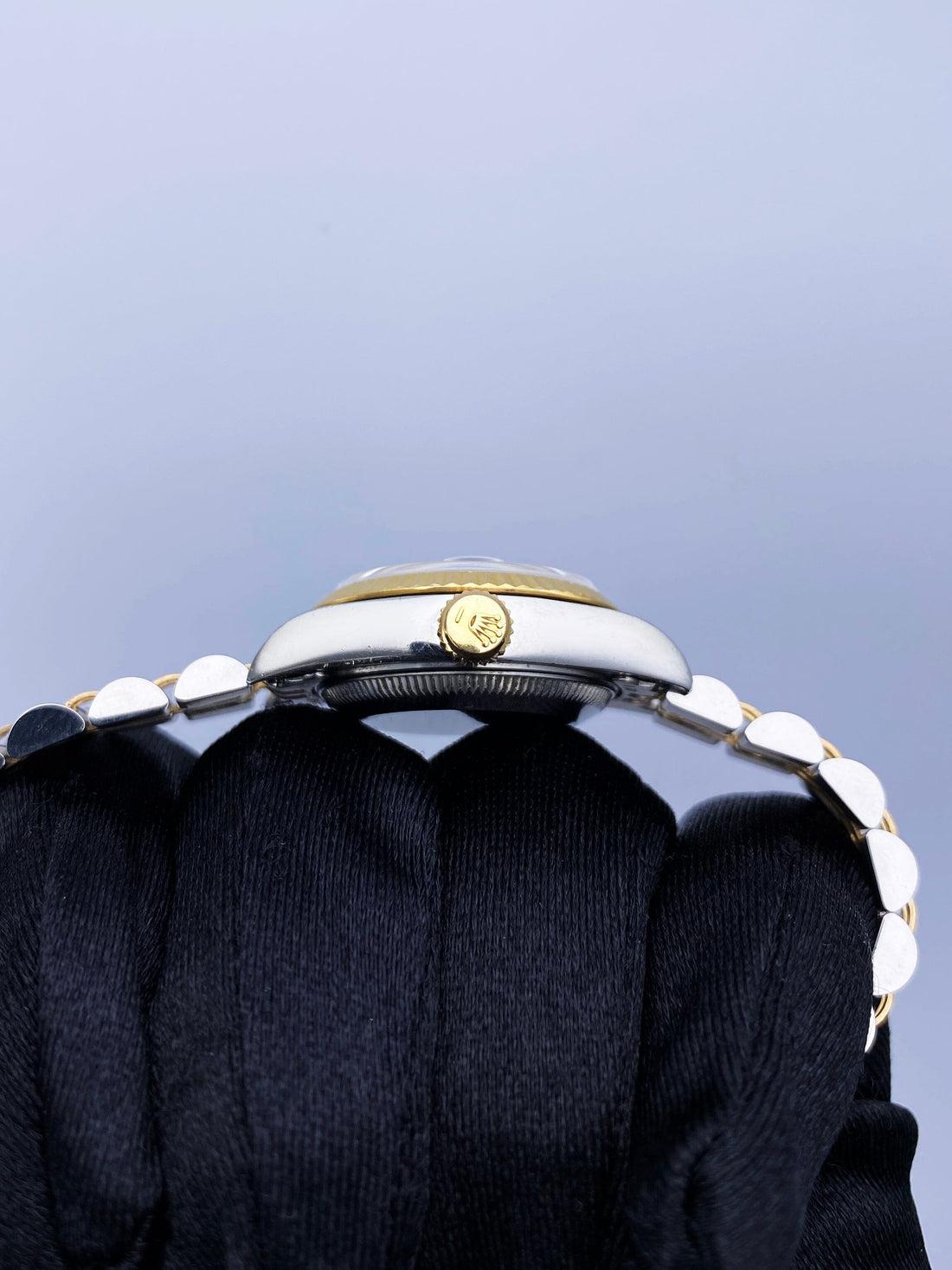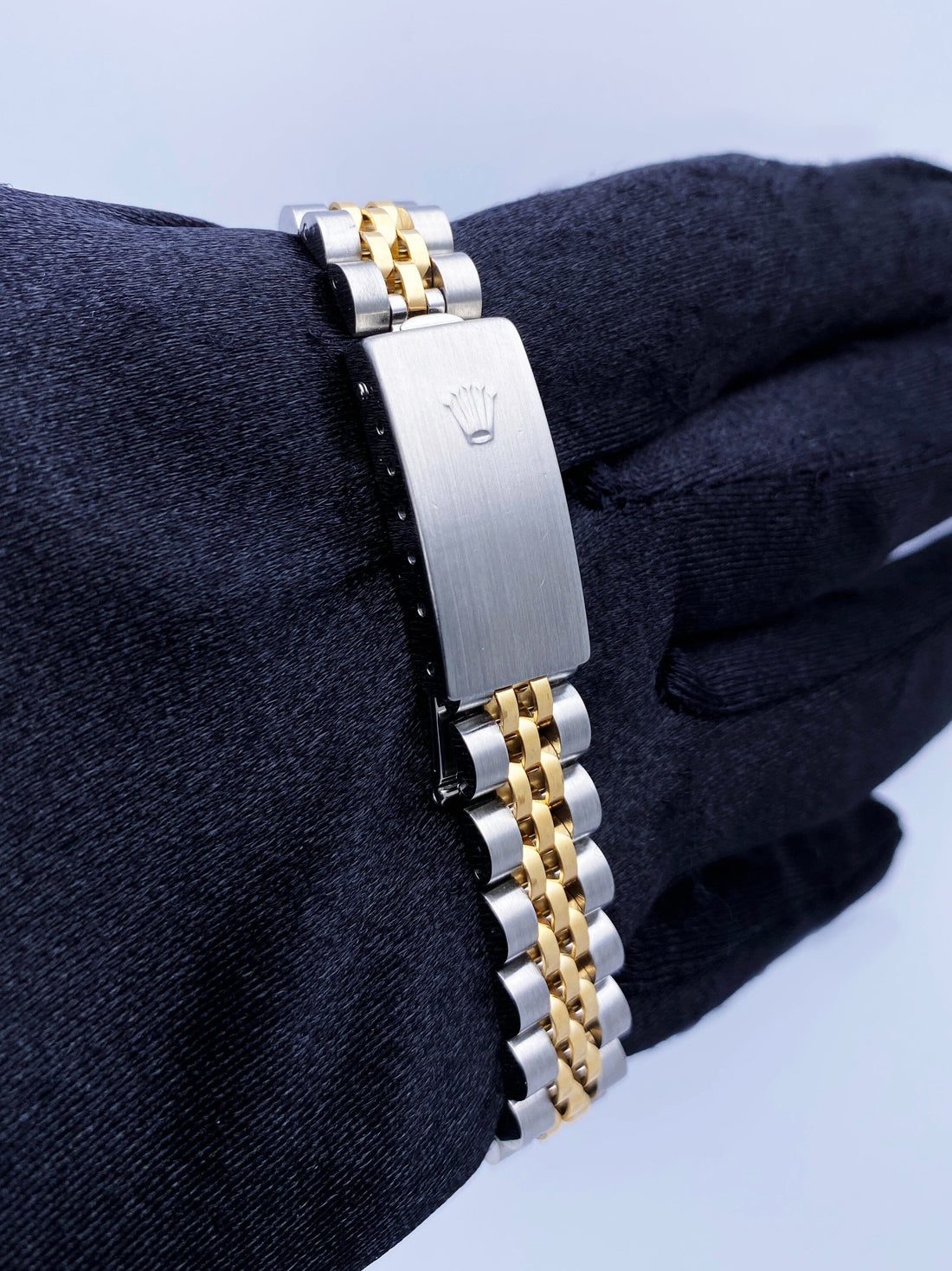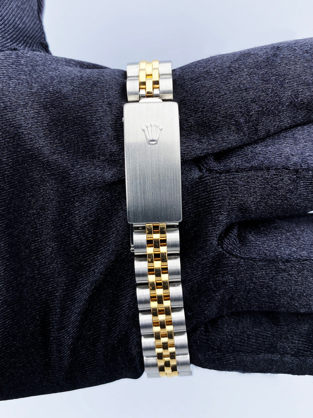 Rolex Datejust 69173 Ladies Watch. 26mm stainless steel case with 18K yellow gold fluted bezel. Blue Anniversary dial with gold hands and Arabic numeral hour markers. The date is displayed at the 3 o'clock position. Stainless steel & 18K yellow gold Jubilee bracelet with a fold-over clasp. Will fit up to a 6-inch wrist. Sapphire crystal. Stainless steel case back. Automatic self-winding chronometer movement. This watch comes with the original Box and Papers. Circa: 1996.
