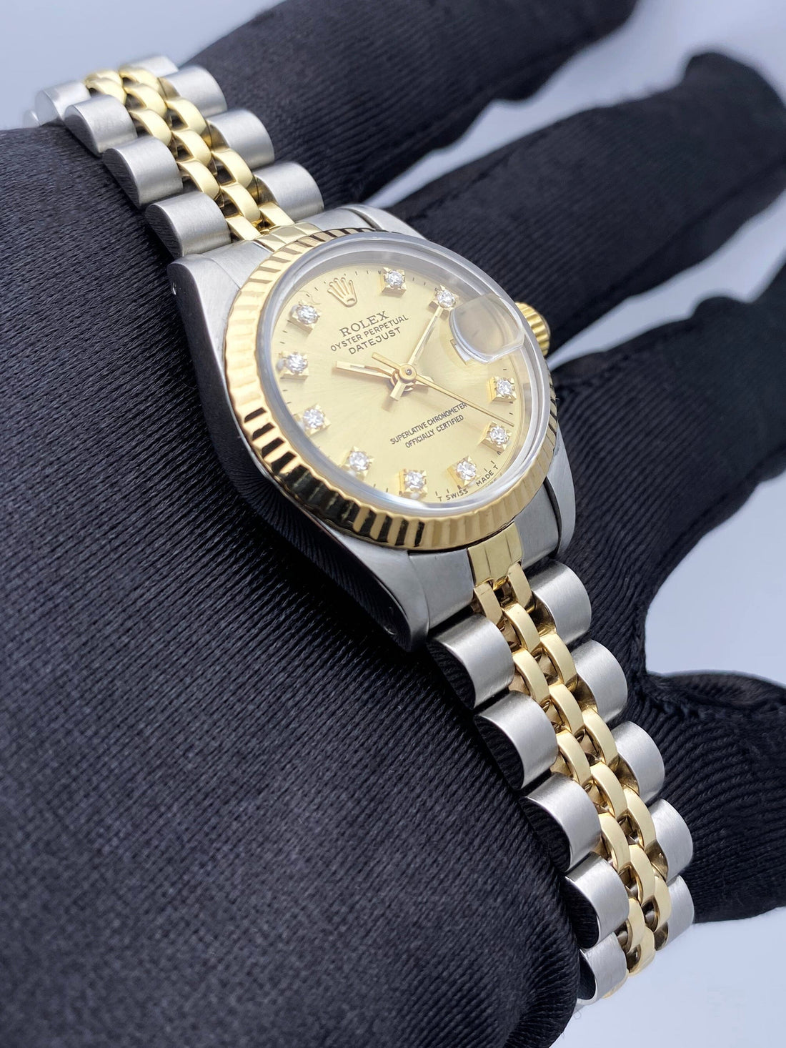 Rolex Datejust 69173 Ladies Watch. 26mm stainless steel case. 18K yellow gold fluted bezel. Champagne dial with gold hands and factory diamond hour markers. Minute markers on the outer dial. Date display at the 3 o'clock position. Stainless steel & 18K yellow gold Jubilee bracelet with fold over clasp. Will fit up to a 6-inch wrist. Sapphire crystal. Stainless steel case back. Automatic self-winding chronometer movement.