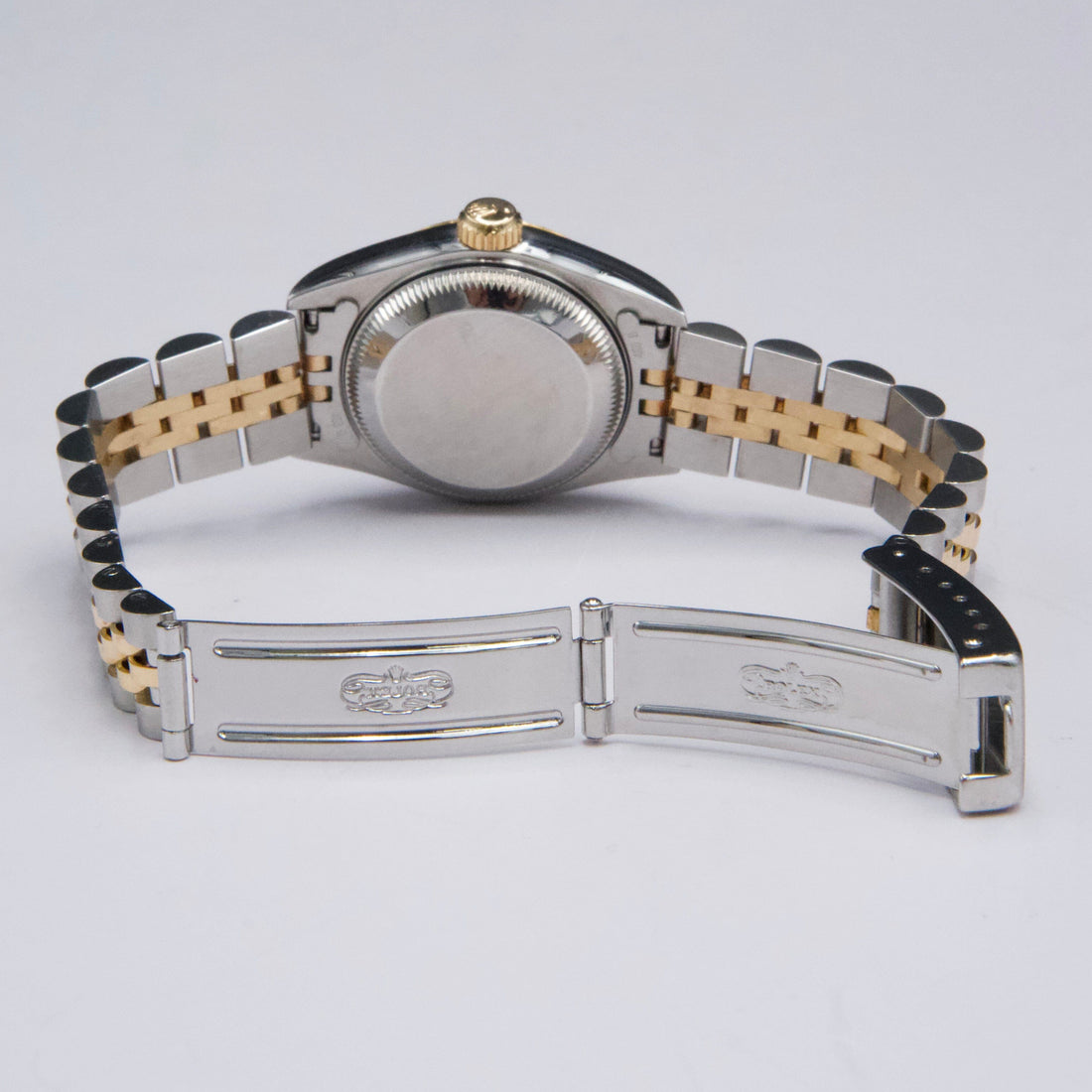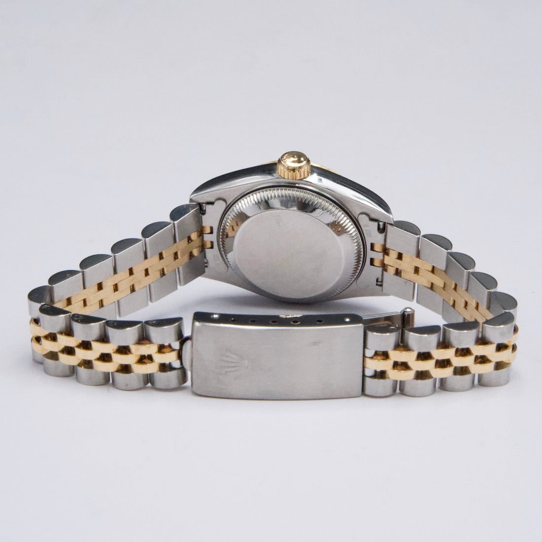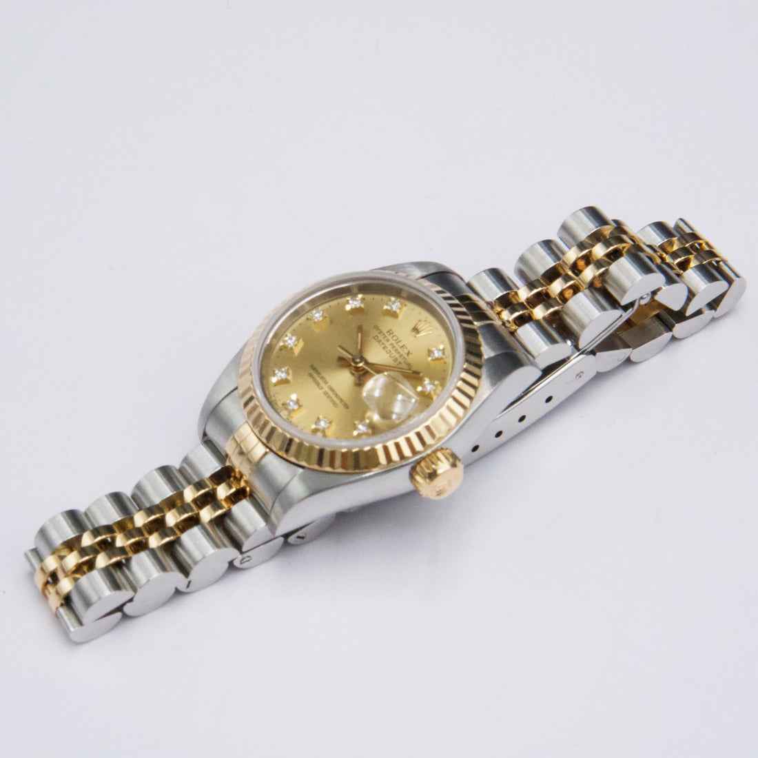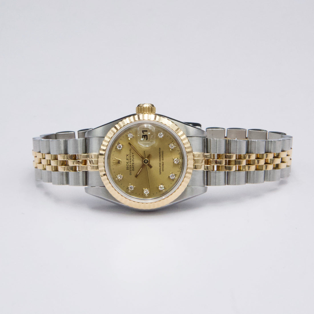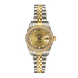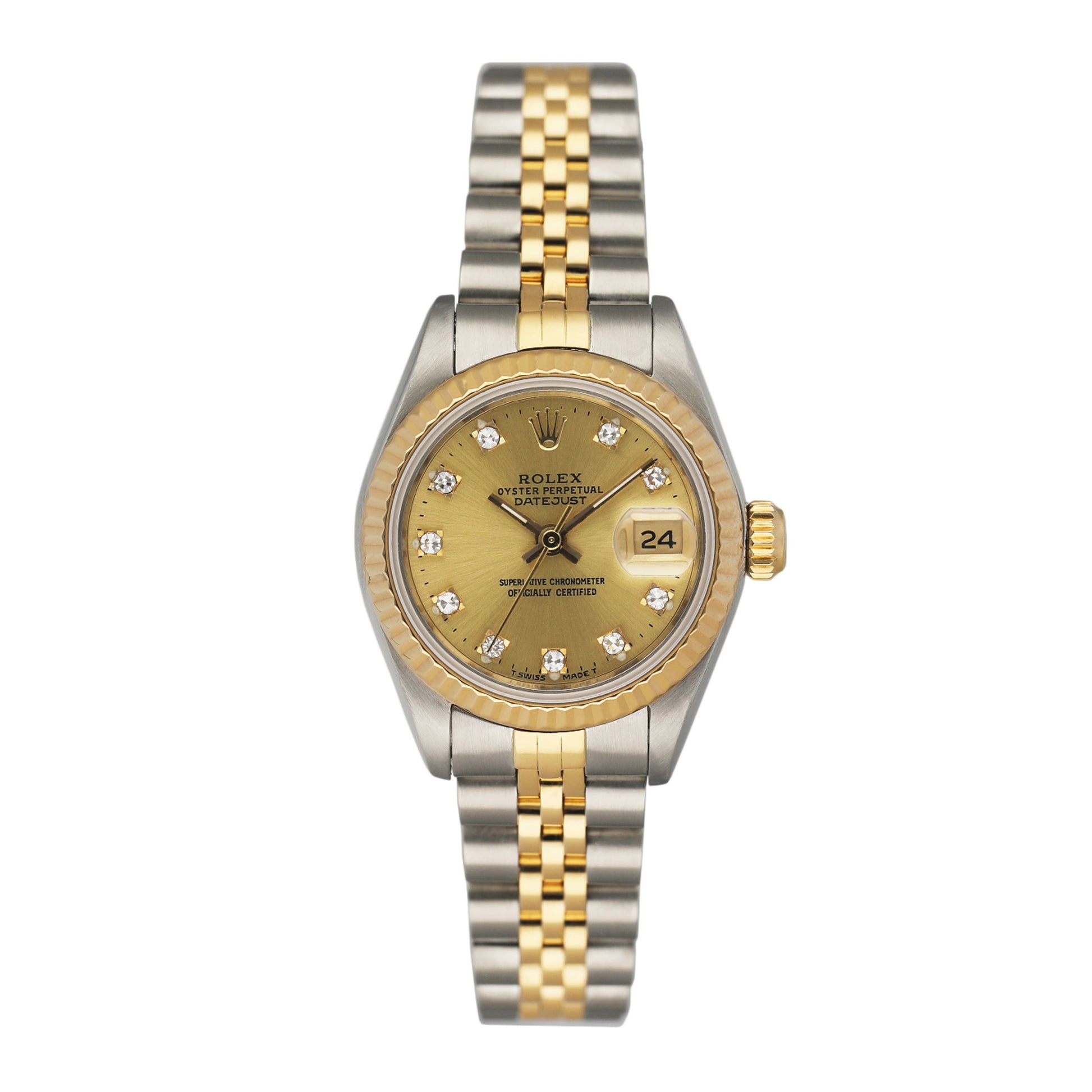 Rolex Datejust 69173 Ladies Watch. 26mm stainless steel case. 18K yellow gold fluted bezel. Champagne dial with gold hands and factory diamond hour markers. Minute markers on the outer dial. Date display at the 3 o'clock position. Stainless steel & 18K yellow gold Jubilee bracelet with fold over clasp. Will fit up to a 6-inch wrist. Sapphire crystal. Stainless steel case back. Automatic self-winding chronometer movement.This watch comes with original Box and Papers.