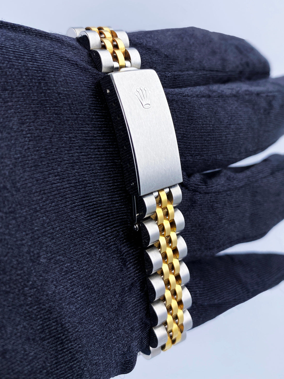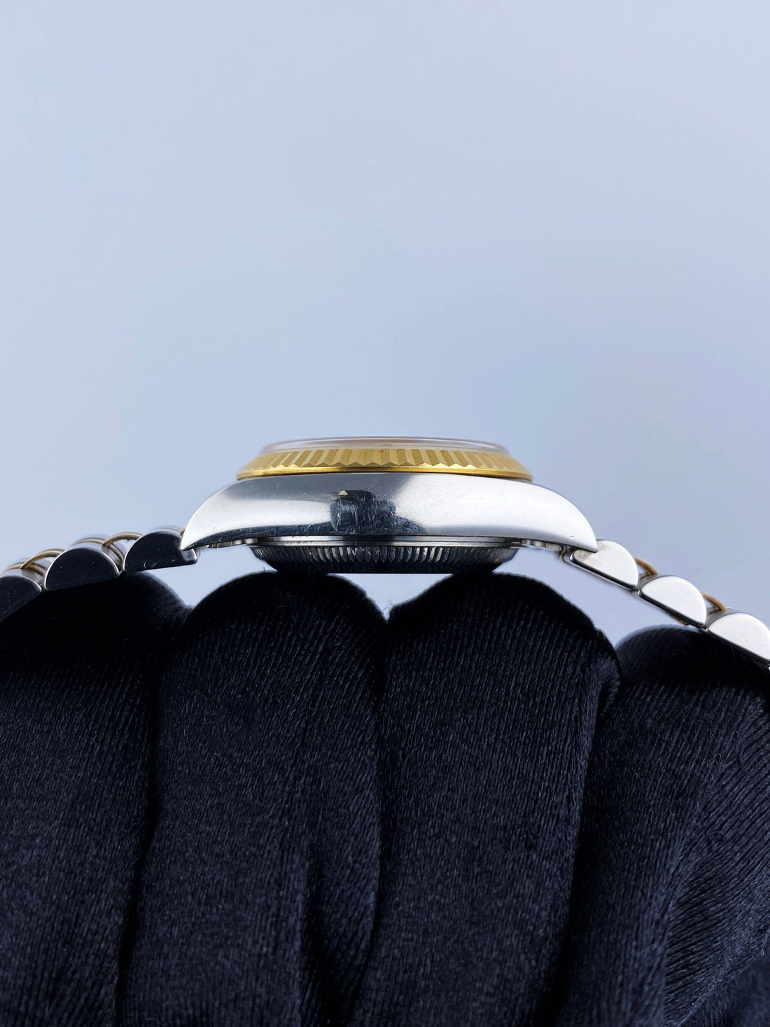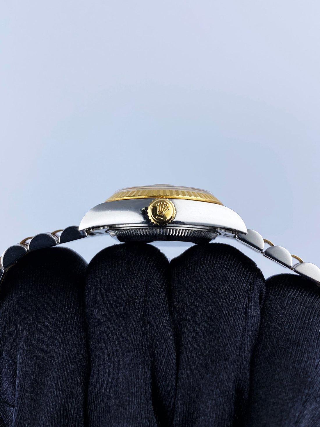 Rolex Datejust 69173 Ladies Watch. 26mm stainless steel case with 18K yellow gold fluted bezel. Champagne dial with gold hands and factory diamond hour markers. Minute markers on the outer dial. Date display at the 3 o'clock position. Stainless steel & 18K yellow gold Jubilee bracelet with fold over clasp. Will fit up to a 6-inch wrist. Sapphire crystal. Stainless steel case back. Automatic self-winding chronometer movement. This watch come with Box and Papers.
