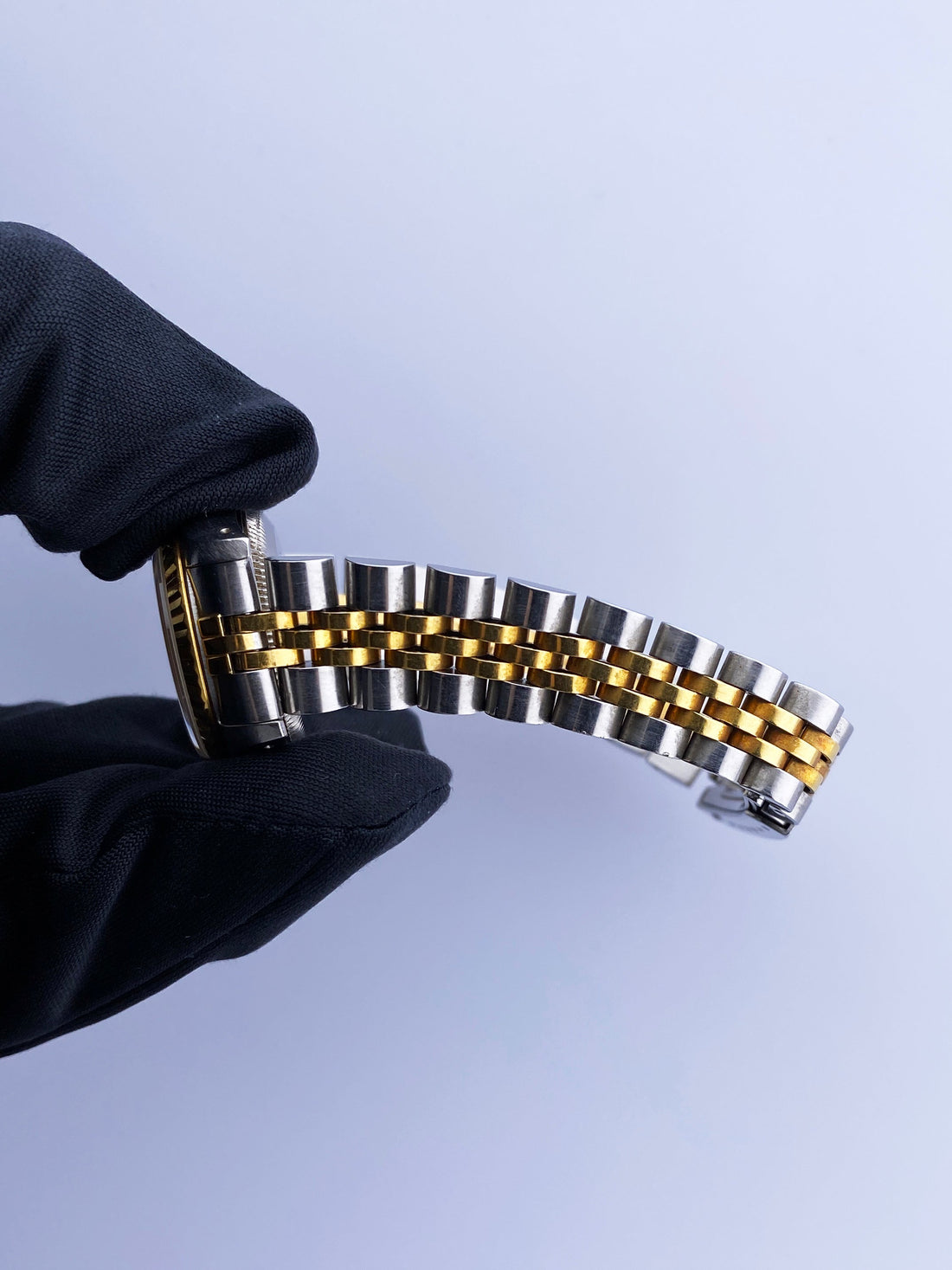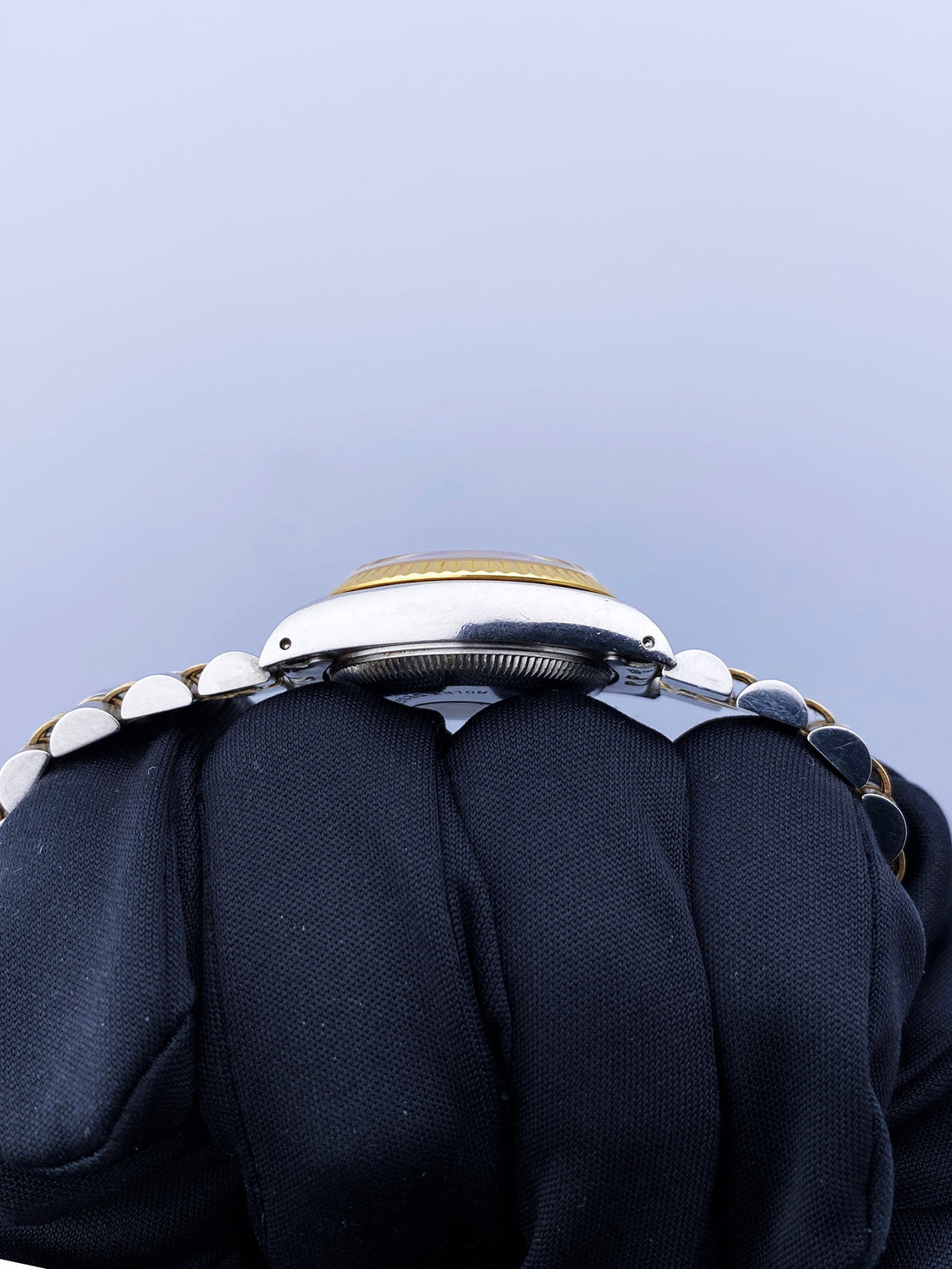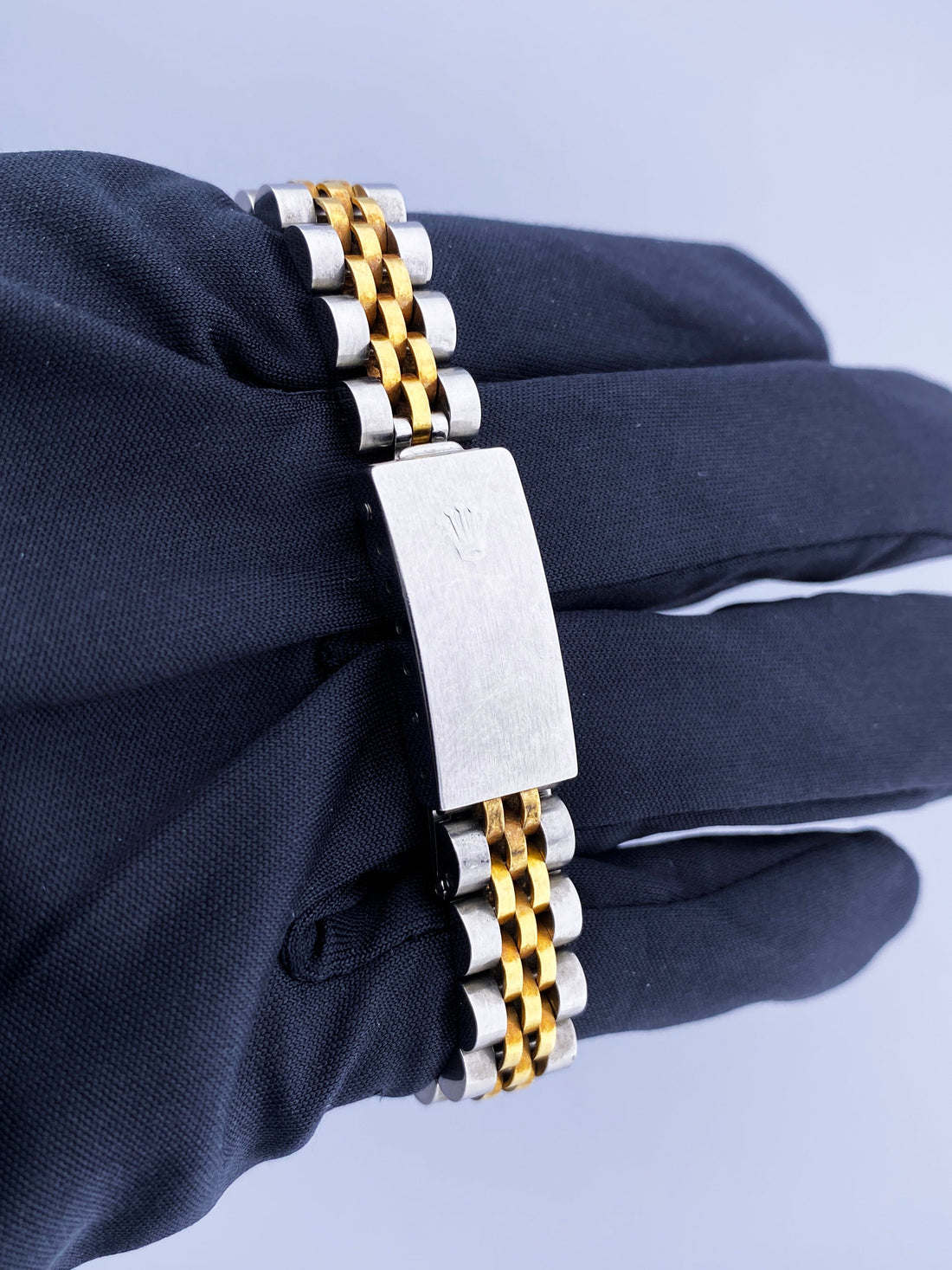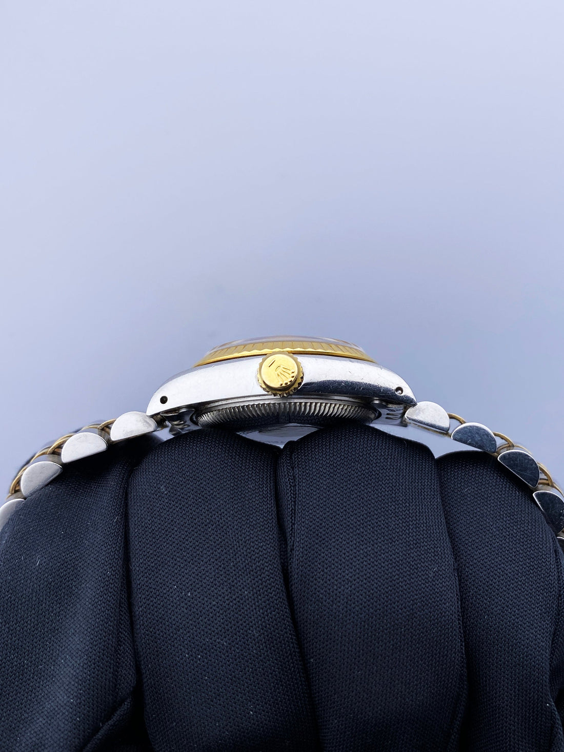 Rolex Datejust 69173 Ladies Watch. 26mm Stainless Steel case. 18K Yellow Gold fluted bezel. Champagne dial with gold hands and index hour markers. Minute markers on the outer dial. Date display at the 3 o'clock position. Stainless steel & 18K yellow gold jubilee bracelet with Fold Over Clasp. Will fit up to a 6-inch wrist. Sapphire Crystal, Stainless steel case back. Calibre 2135 Automatic self-winding chronometer movement with a 42-hour power reserve. This watch comes with original Box & Papers.