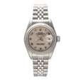 Rolex Datejust 69174 Ladies Watch. 26mm stainless steel case. 18K white gold fluted bezel. Anniversary dial with luminous steel hands and Arabic numeral hour markers. Minute markers on the outer dial. Date display at the 3 o'clock position. Stainless steel Jubilee bracelet with fold over clasp. Will fit up to a 6-inch wrist. Sapphire crystal. Stainless steel case back. Automatic self-winding movement. This watch comes with original Box and Papers.