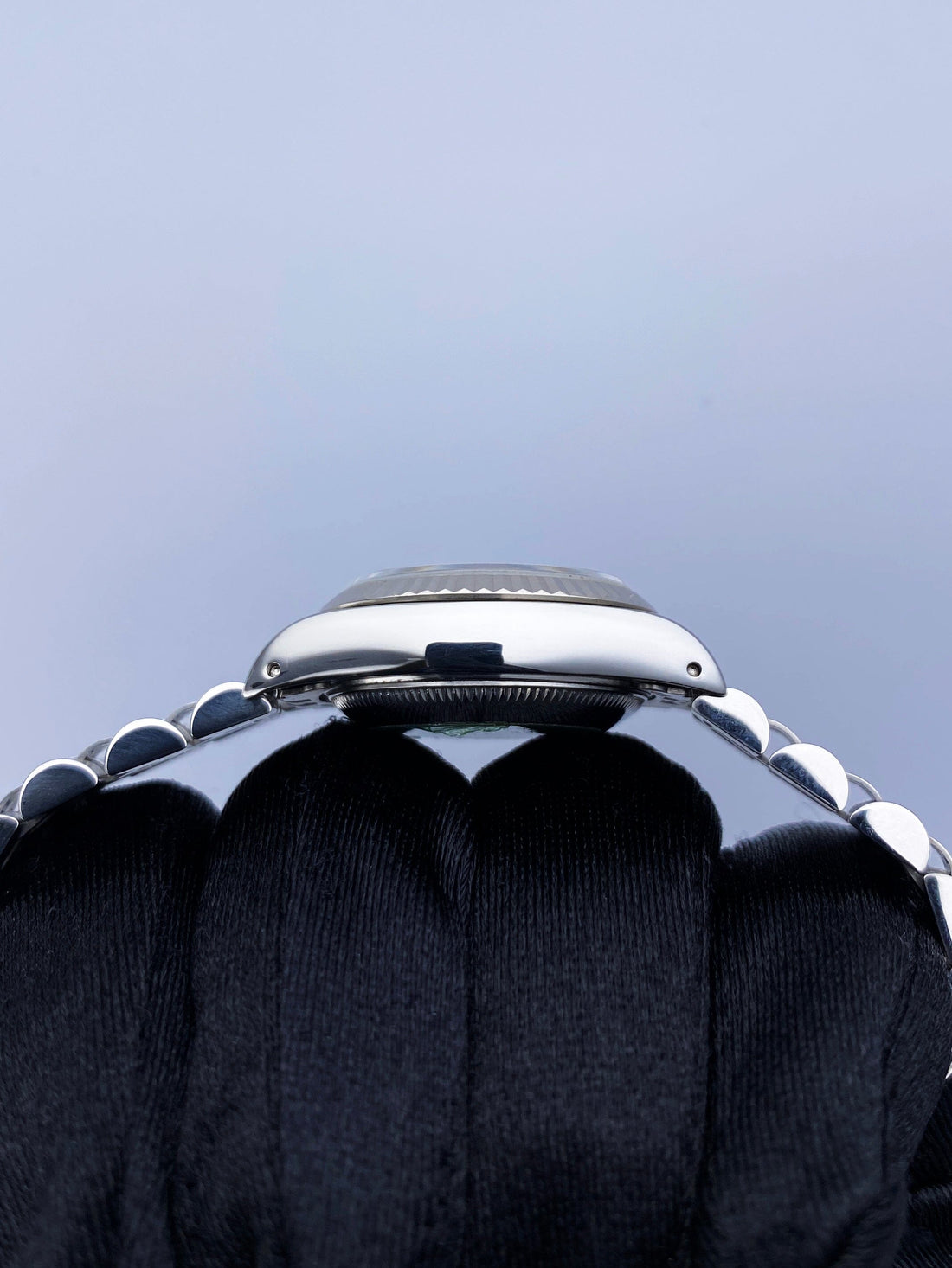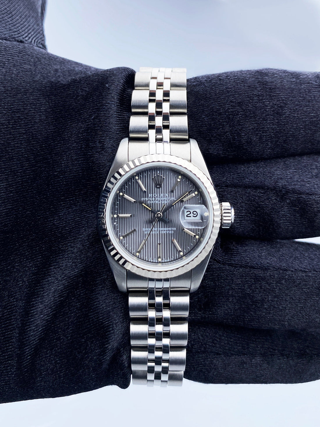 Rolex Datejust 69174 Ladies Watch. 26mm stainless steel case with 18K white gold fluted bezel. Grey linen dial with luminous steel hands and index hour markers. Minute markers on the outer dial. Date display at the 3 o'clock position. Stainless steel Jubilee bracelet with fold over clasp. Will fit up to a 6-inch wrist. Sapphire crystal. Stainless steel case back. Automatic self-winding movement.
