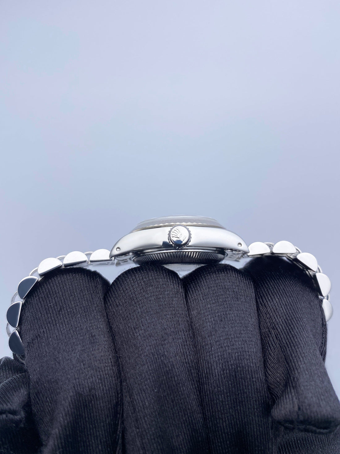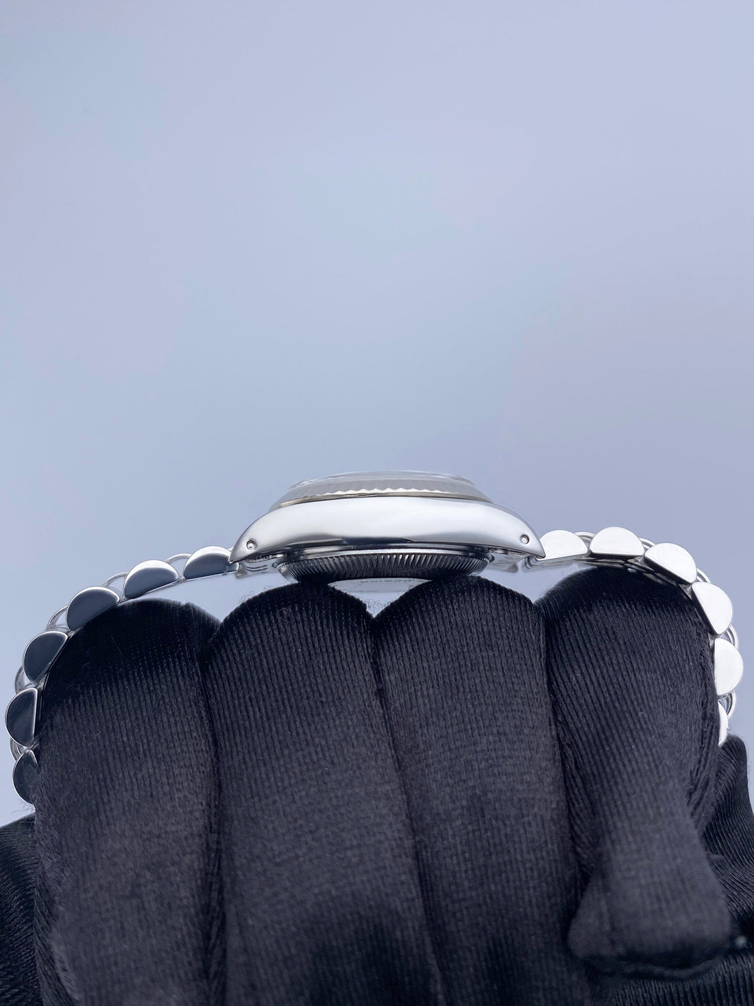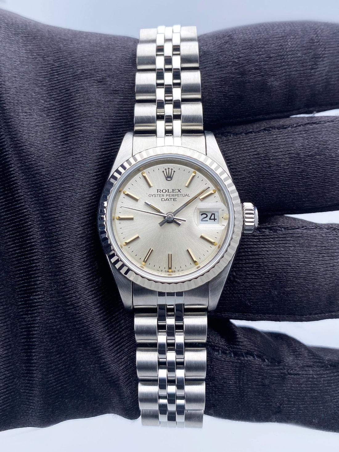 Rolex Datejust 69174 Ladies Watch. 26mm stainless steel case with 18K white gold fluted bezel. Silver dial with luminous steel hands and index hour markers. Minute markers on the outer dial. Date display at the 3 o'clock position. Stainless steel Jubilee bracelet with fold over clasp. Will fit up to a 6.25-inch wrist. Sapphire crystal. Stainless steel case back. Automatic self-winding movement.