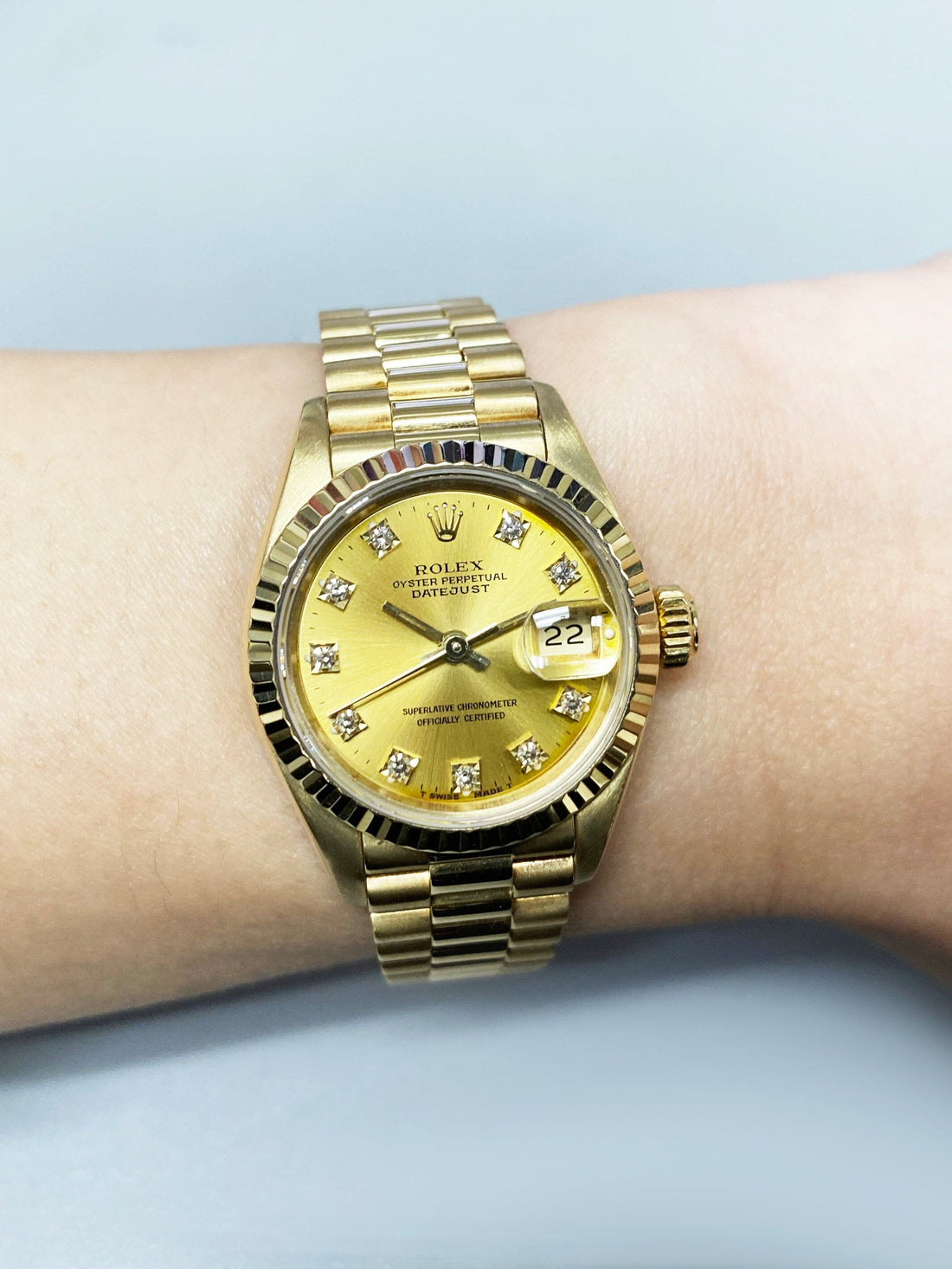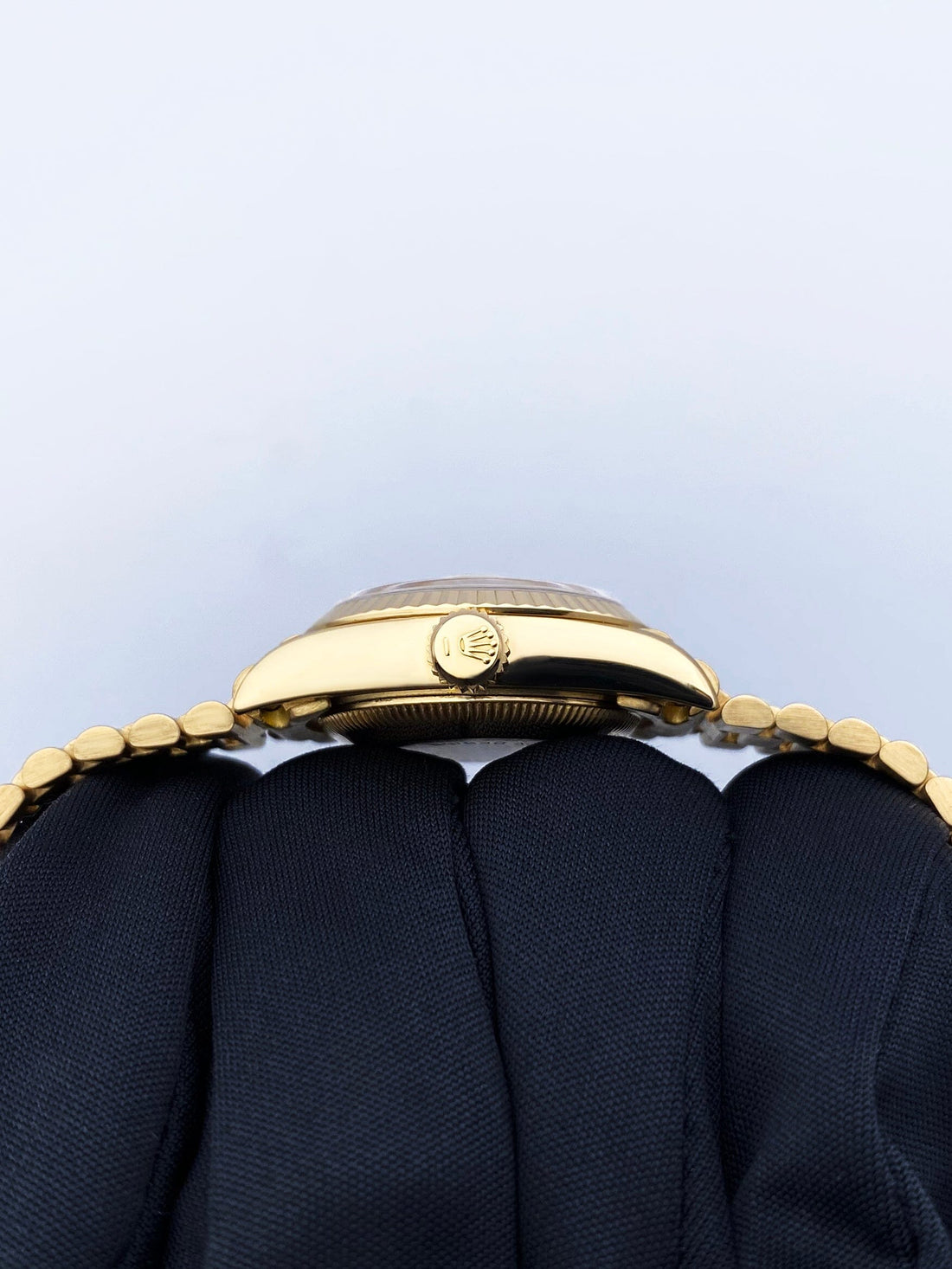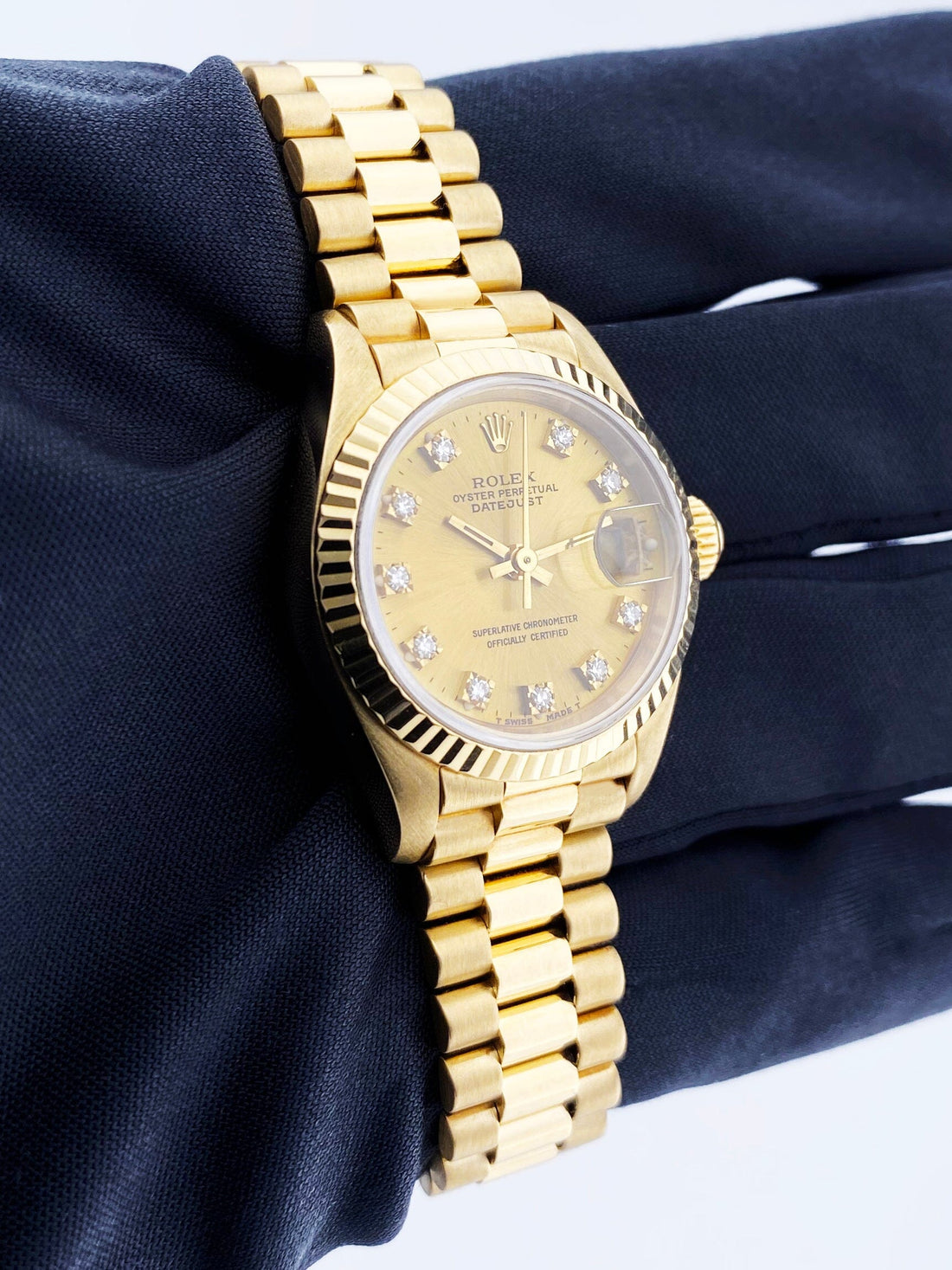 Rolex Oyster Perpetual Datejust 69178 Ladies Watch. 26mm 18K yellow gold case with a fluted bezel. Champagne dial with gold hands and original factory diamond set hour markers. Minute markers on the outer dial. Date display at the 3 o'clock position. 18K yellow gold President bracelet with 18K yellow gold hidden fold over clasp. Will fit up to 6-Inch wrist. Sapphire glass. 18K yellow gold case back. Automatic self-winding movement. This will come with Box and Papers.