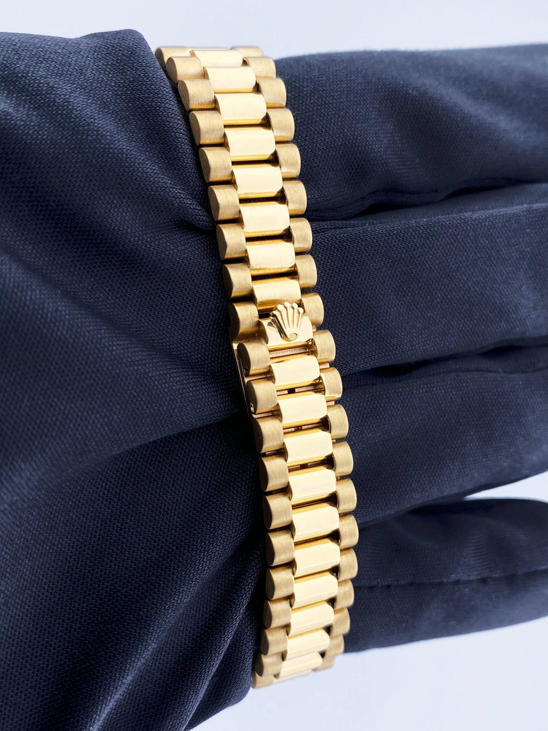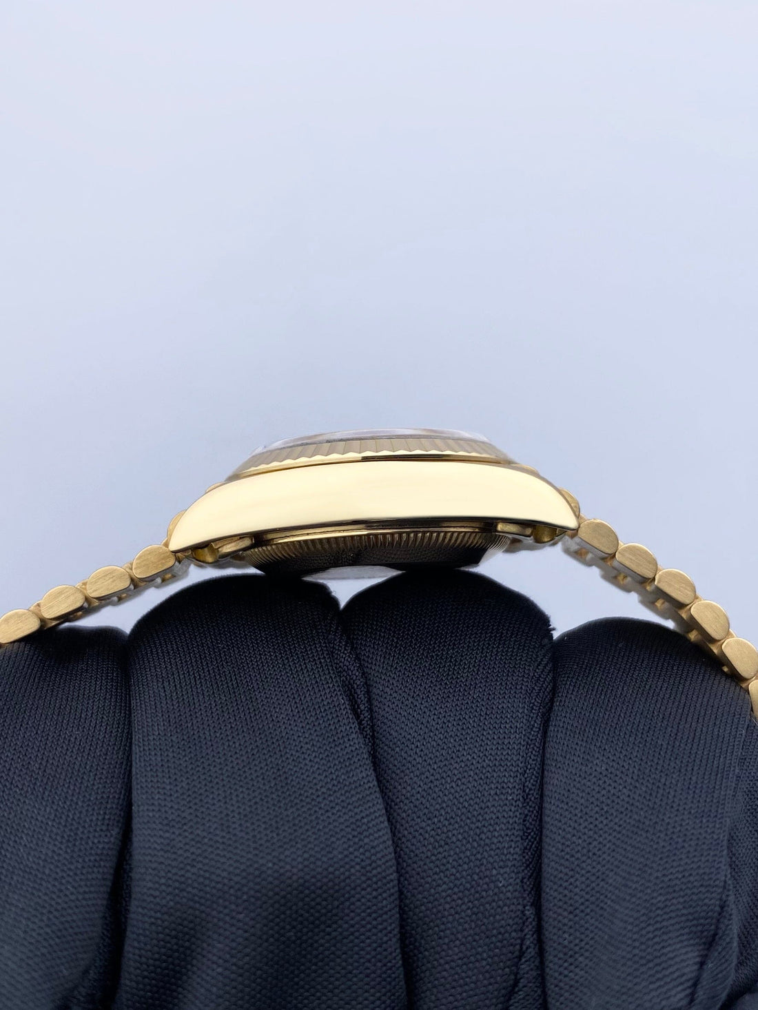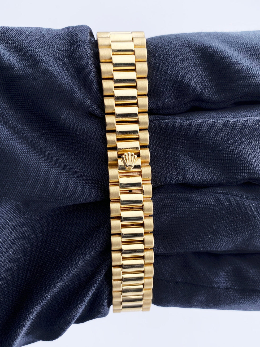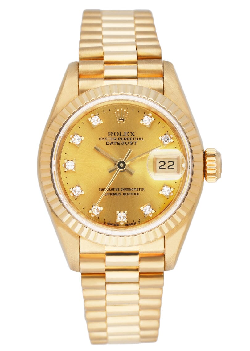 Rolex Oyster Perpetual Datejust 69178 Ladies Watch. 26mm 18K yellow gold case with a fluted bezel. Champagne dial with gold hands and original factory diamond set hour markers. Minute markers on the outer dial. Date display at the 3 o'clock position. 18K yellow gold President bracelet with 18K yellow gold hidden fold over clasp. Will fit up to 6-Inch wrist. Sapphire glass. 18K yellow gold case back. Automatic self-winding movement. This will come with Box and Papers.