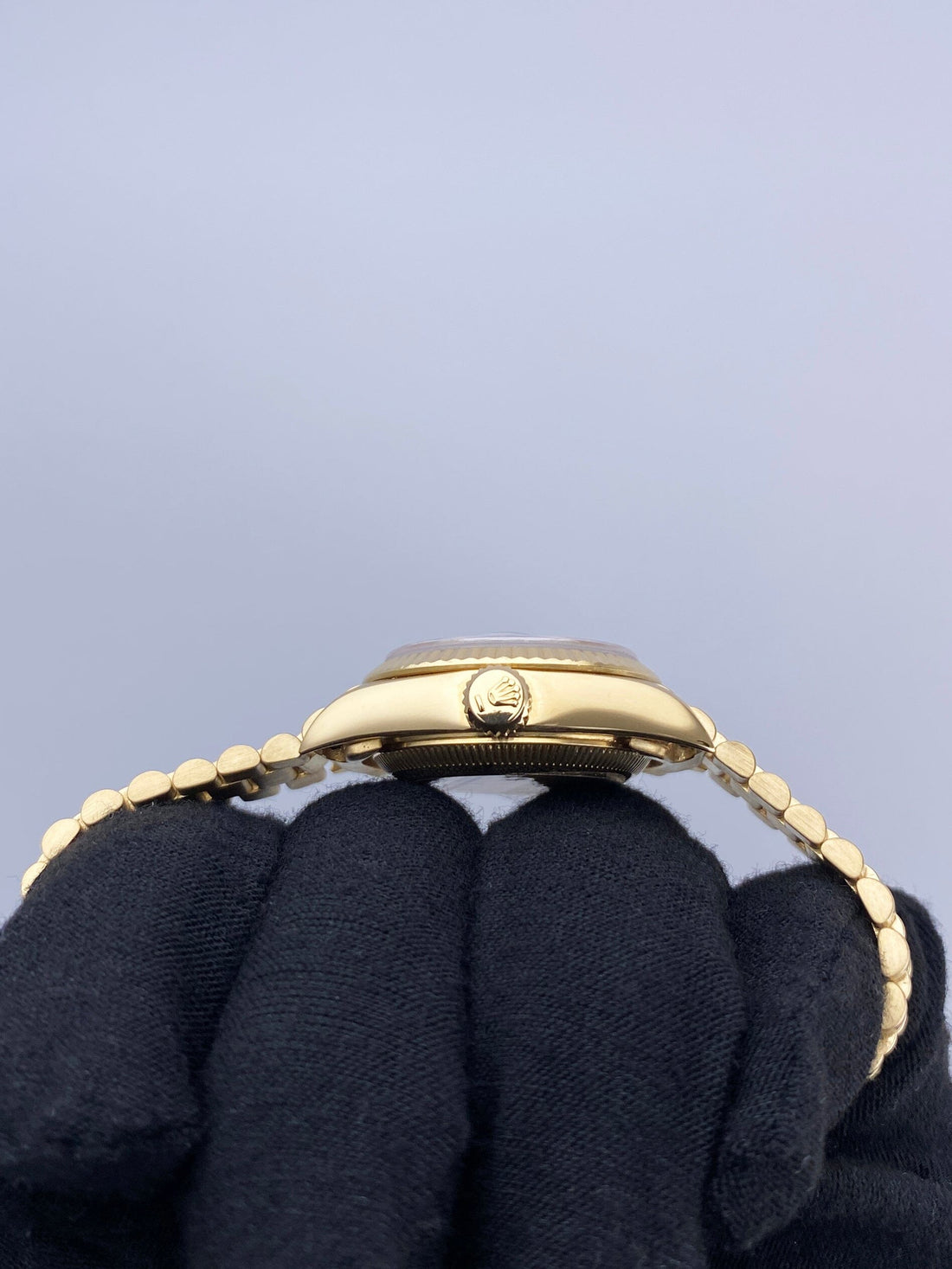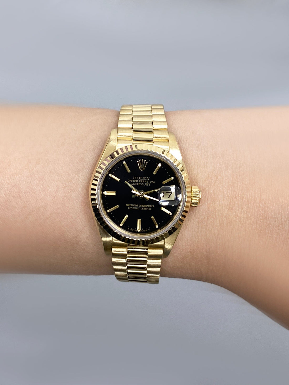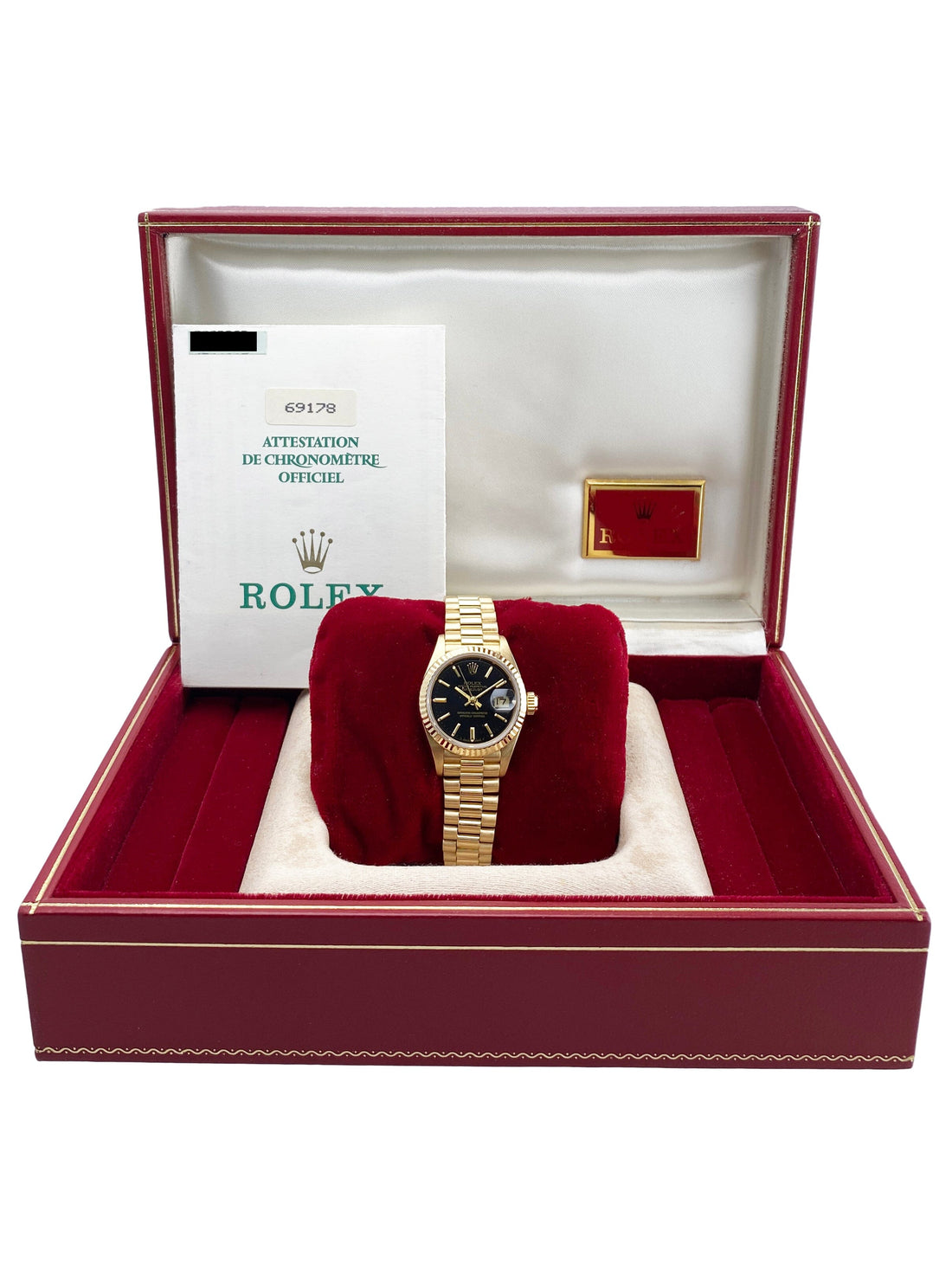 Rolex Oyster Perpetual Datejust 69178 Ladies Watch. 26mm 18K yellow gold case with a fluted bezel. Black dial with gold hands and index hour markers. Minute markers on the outer dial. Date display at the 3 o'clock position. 18K yellow gold President bracelet with 18K yellow gold hidden fold over clasp. Will fit up to 5.75-Inch wrist. Sapphire crystal. 18K yellow gold case back. Automatic self-winding movement. This watch comes with original Box and Papers.