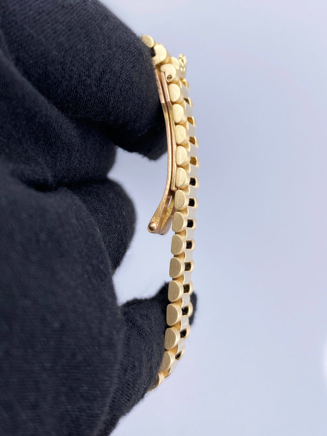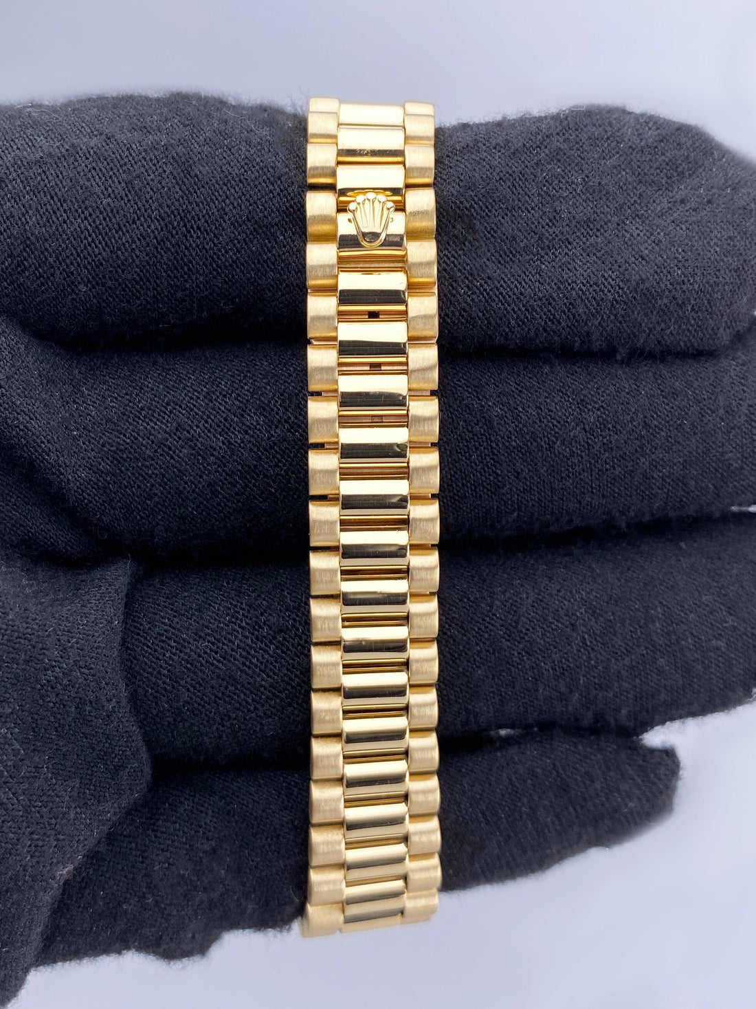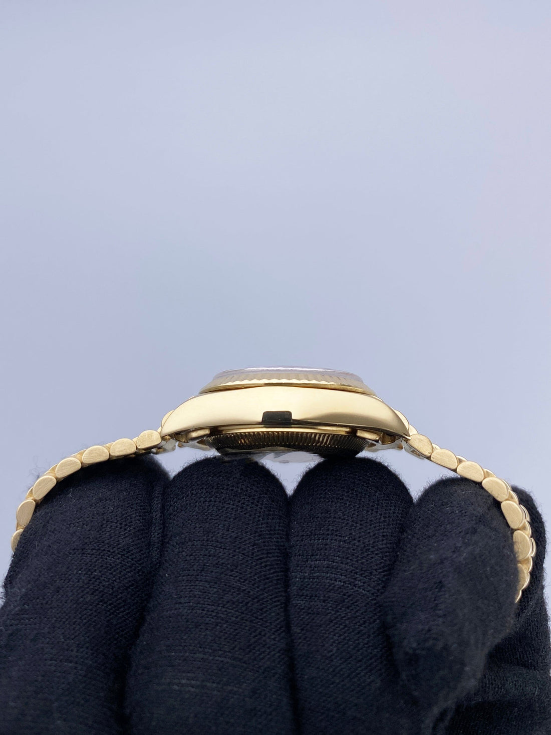 Rolex Oyster Perpetual Datejust 69178 Ladies Watch. 26mm 18K yellow gold case with a fluted bezel. Black dial with gold hands and index hour markers. Minute markers on the outer dial. Date display at the 3 o'clock position. 18K yellow gold President bracelet with 18K yellow gold hidden fold over clasp. Will fit up to 5.75-Inch wrist. Sapphire crystal. 18K yellow gold case back. Automatic self-winding movement. This watch comes with original Box and Papers.