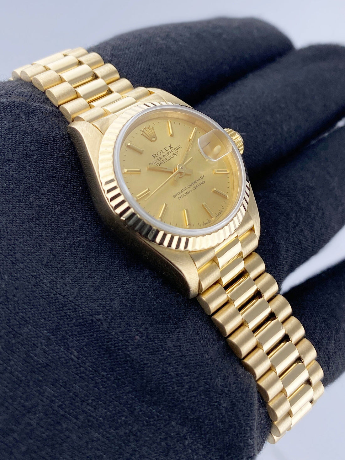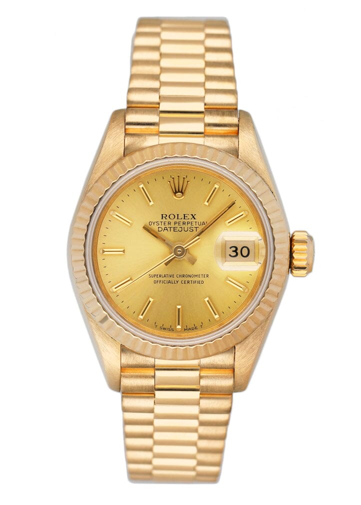 Rolex Oyster Perpetual Datejust 69178 Ladies Watch. 26mm 18K yellow gold case. 18K yellow gold bezel. Champagne dial with gold hands and index hour markers. Minute markers on the outer dial. Date display at the 3 o'clock position. 18K yellow gold President bracelet with 18K rose gold hidden fold over clasp. Will fit up to 5.75-Inch wrist. Sapphire crystal. 18K yellow gold case back. Automatic self-winding movement.