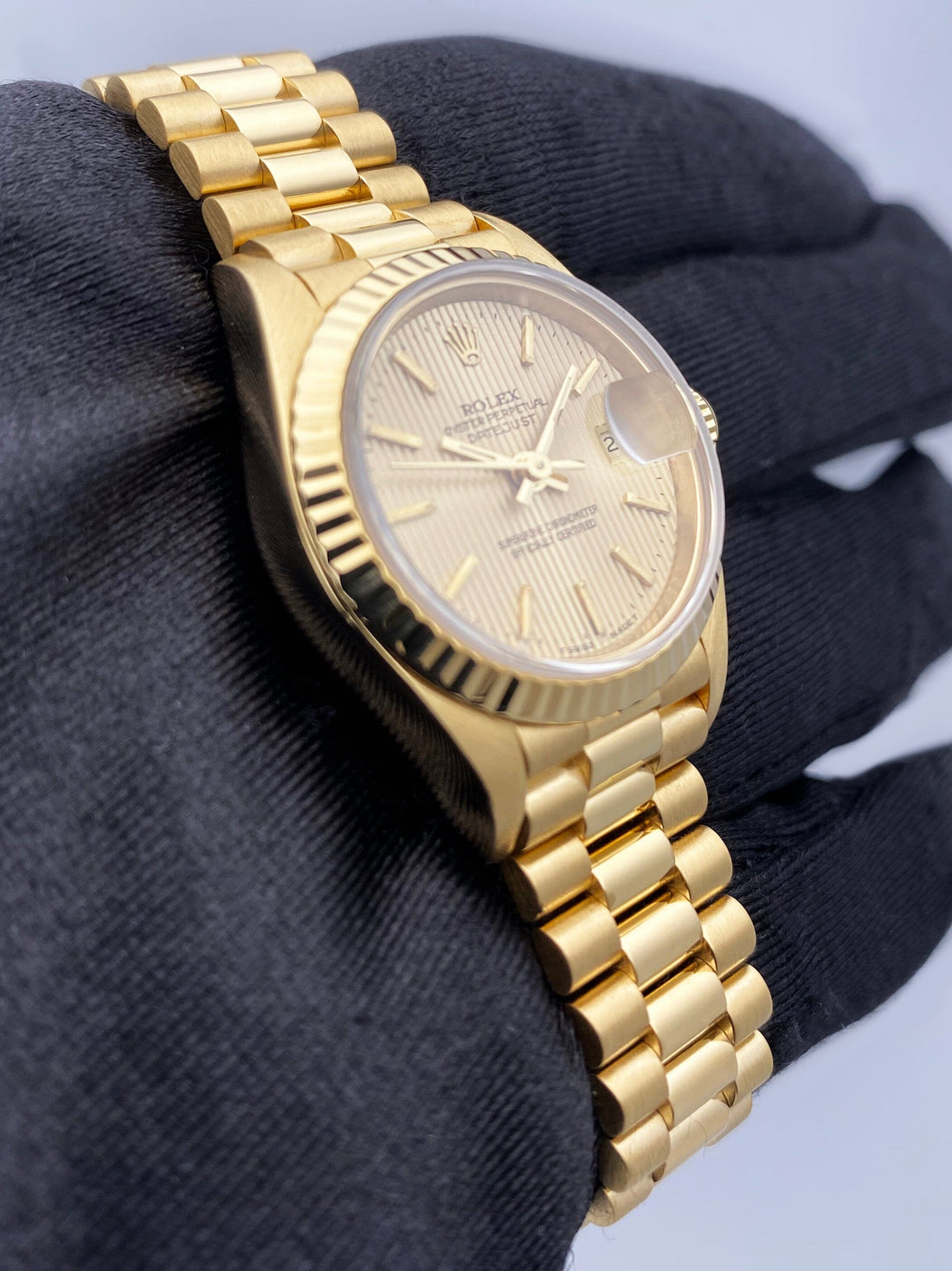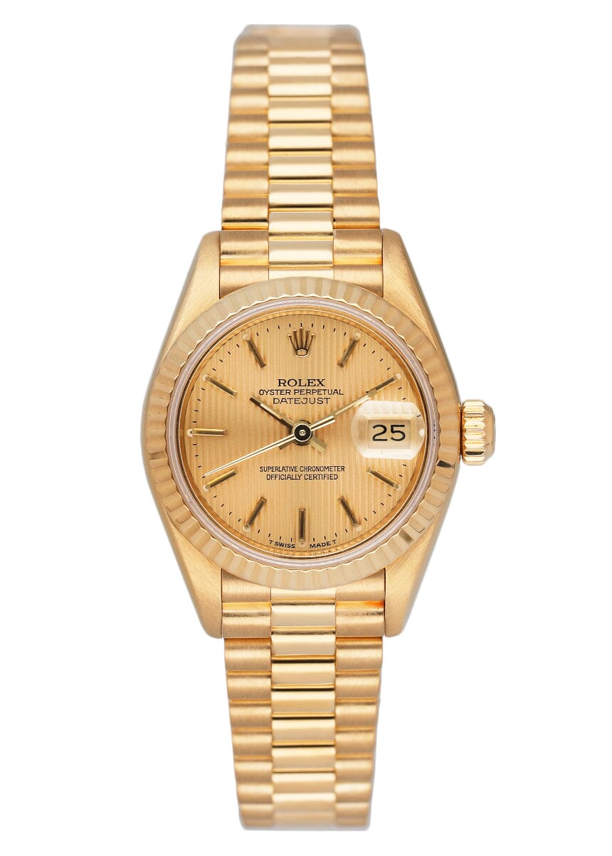 Rolex Oyster Perpetual Datejust 69178 Ladies Watch. 26mm 18K yellow gold case. 18K yellow gold bezel. Champagne Linen dial with gold hands and index hour markers. Minute markers on the outer dial. Date display at the 3 o'clock position. 18K yellow gold President bracelet with 18K rose gold hidden fold over clasp. Will fit up to 5.5-Inch wrist. Sapphire crystal. 18K yellow gold case back. Automatic self-winding movement.
