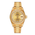 Rolex Oyster Perpetual Datejust 69178 Ladies Watch. 26mm 18K yellow gold case with a fluted bezel. Champagne dial with gold hands and factory diamond hour markers. Original factory diamond set around the outer dial. Date display at the 3 o'clock position. 18K yellow gold President bracelet with 18K yellow gold hidden fold over clasp. Will fit up to 5.75-Inch wrist. Sapphire crystal. 18K yellow gold case back. Automatic self-winding movement.