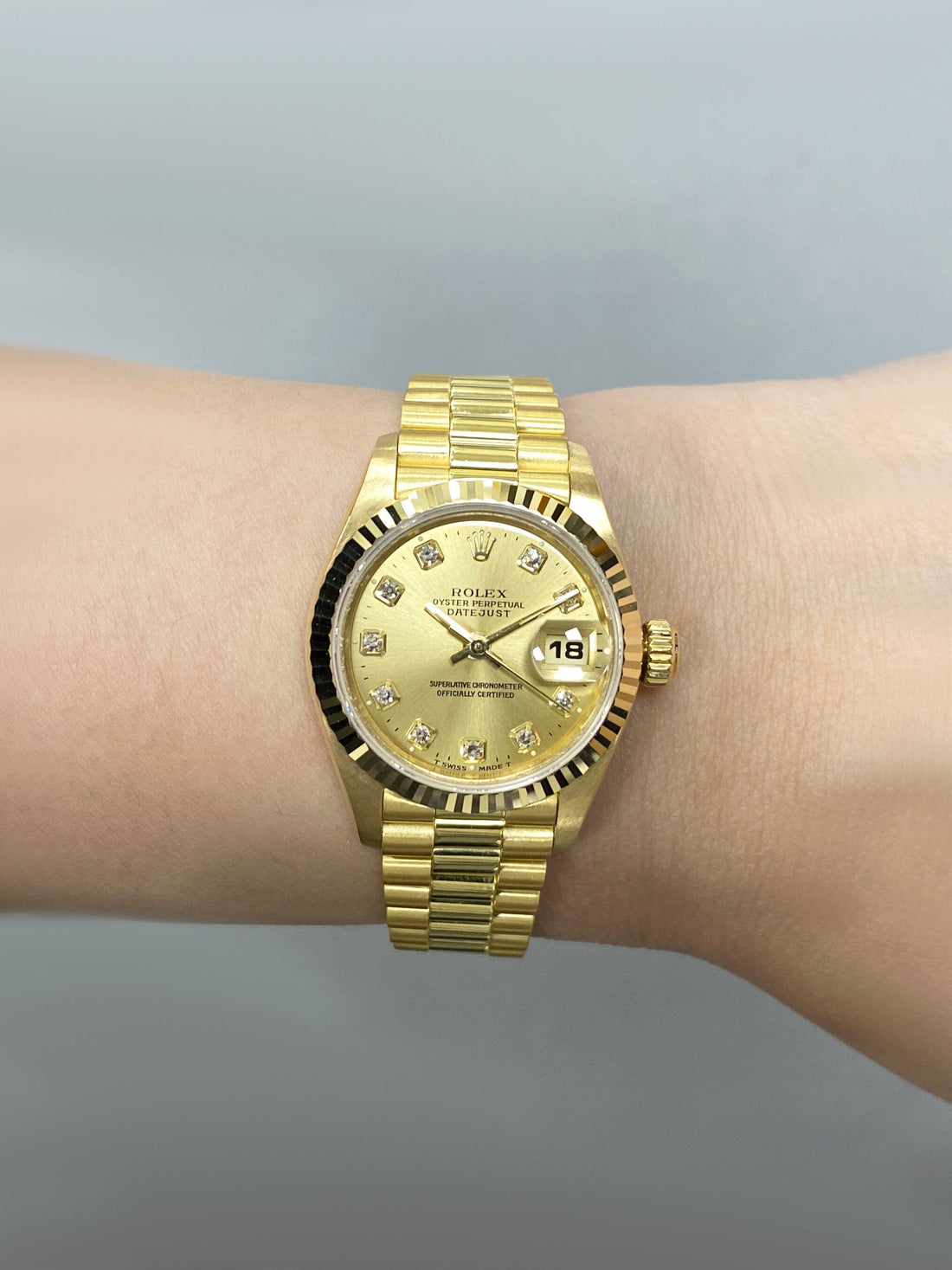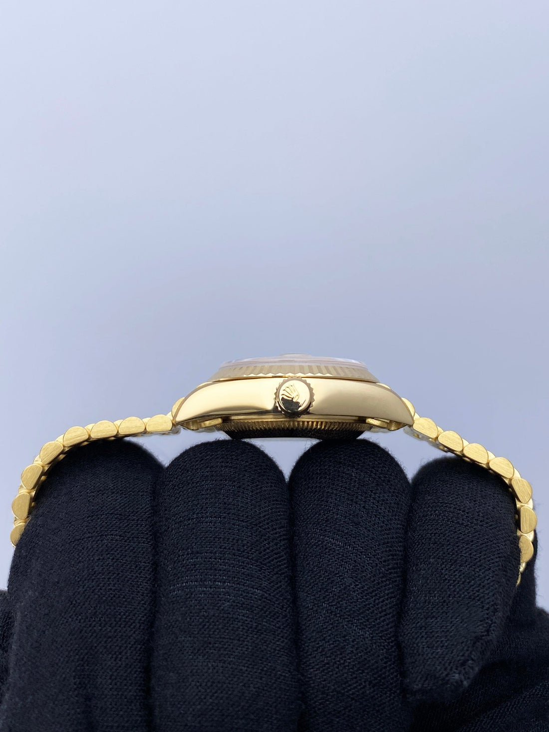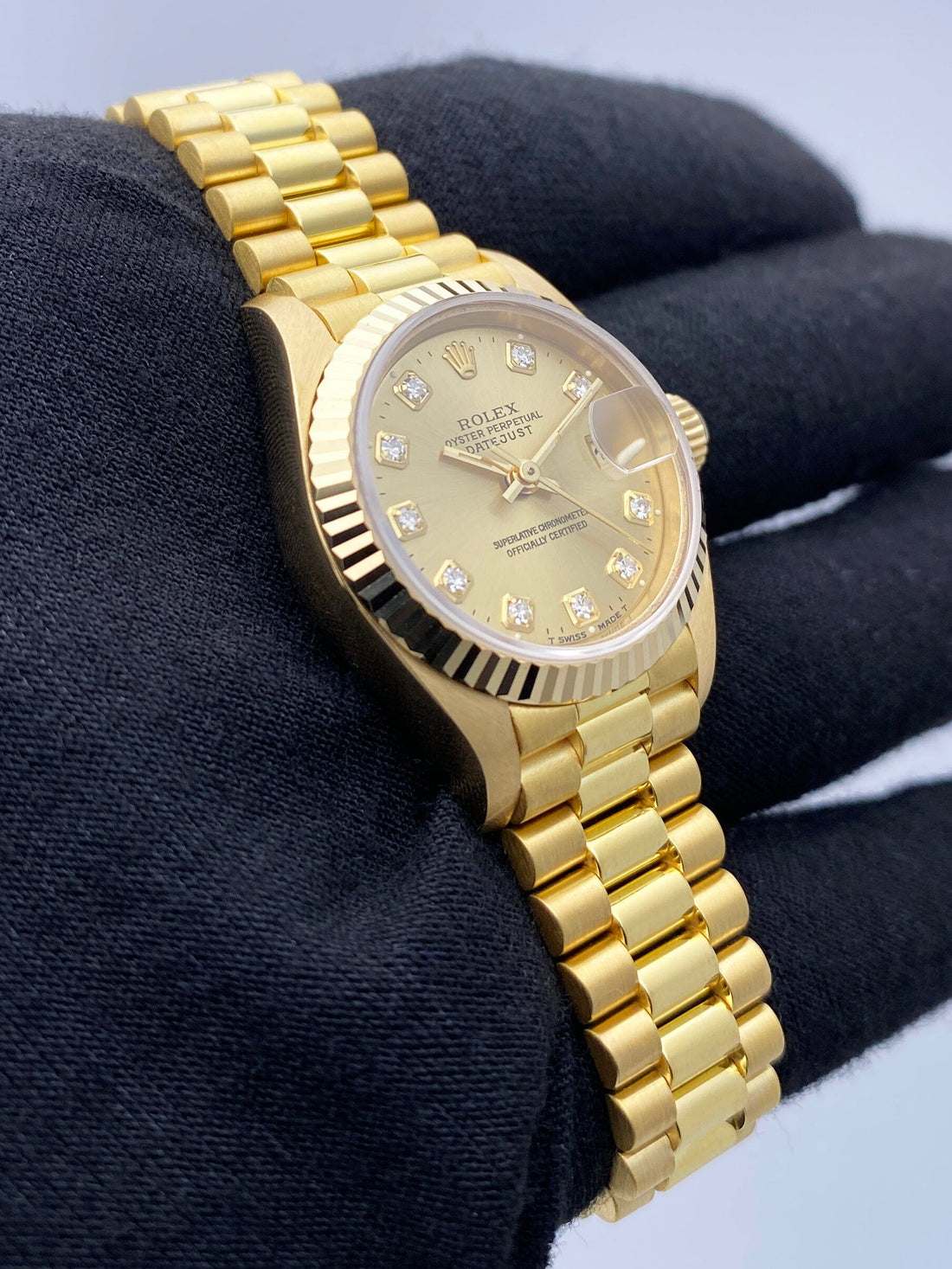 Rolex Oyster Perpetual Datejust 69178 Ladies Watch. 26mm 18K yellow gold case with a fluted bezel. Champagne dial with gold hands and original factory diamond set hour markers. Minute markers on the outer dial. Date display at the 3 o'clock position. 18K yellow gold President bracelet with 18K rose gold hidden fold over clasp. Will fit up to 6-Inch wrist. Sapphire crystal. 18K yellow gold case back. Automatic self-winding movement. This watch comes with original Box and Papers.